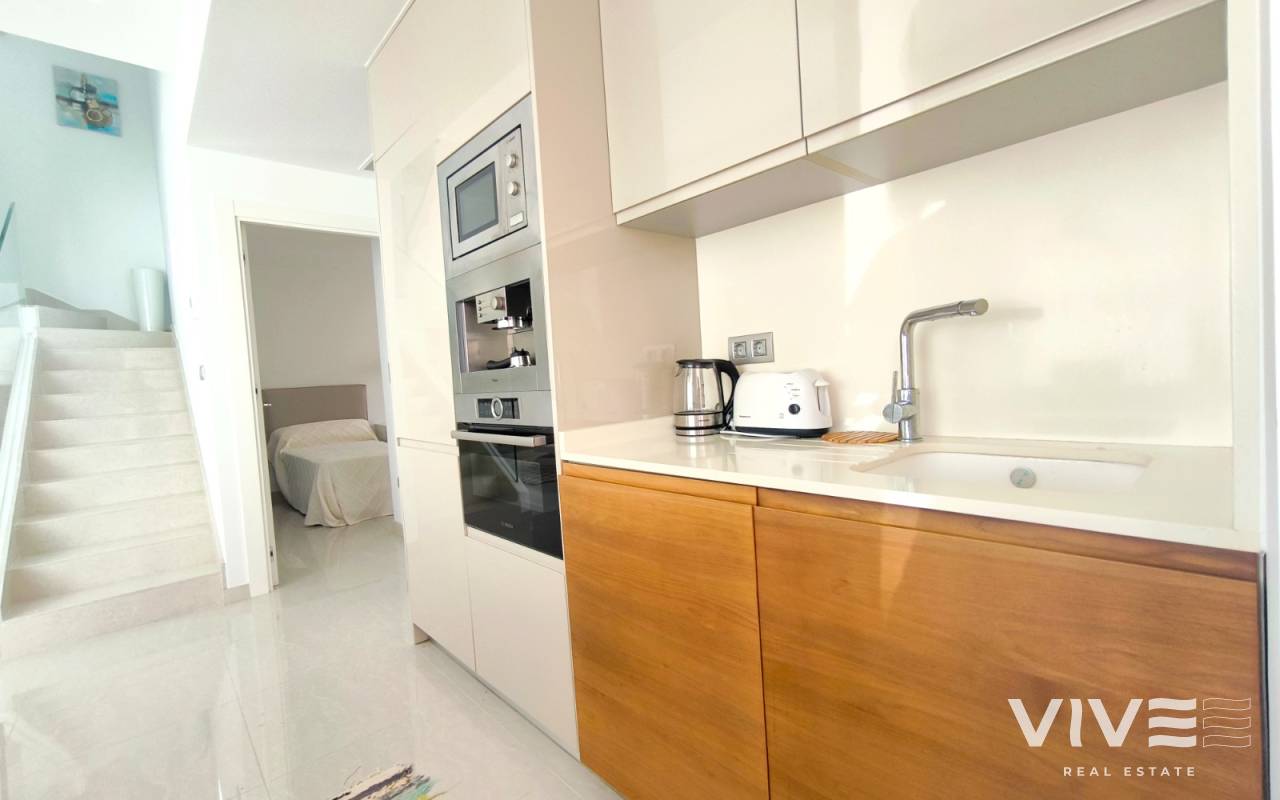 Ground floor: one bedroom, a full bathroom, open-plan kitchen and a bright and spacious living-dining room.
