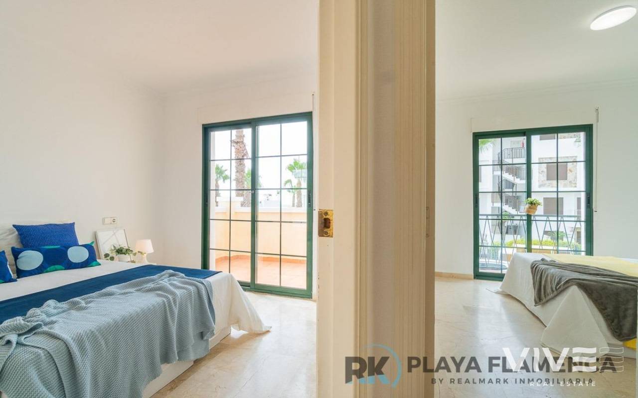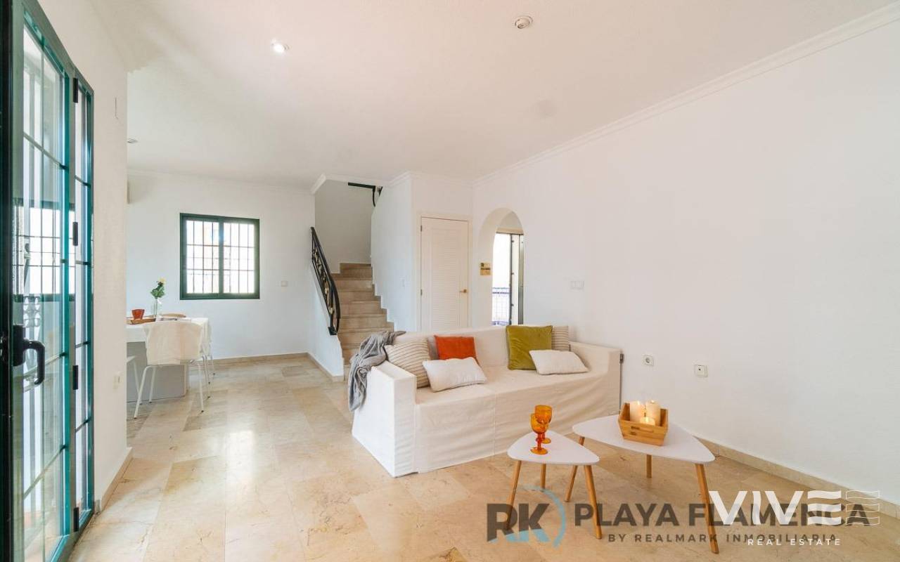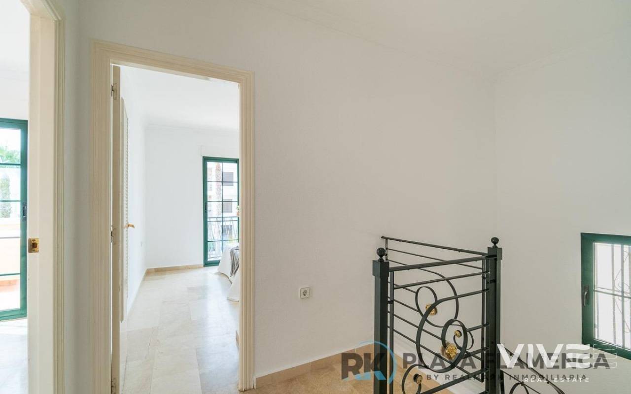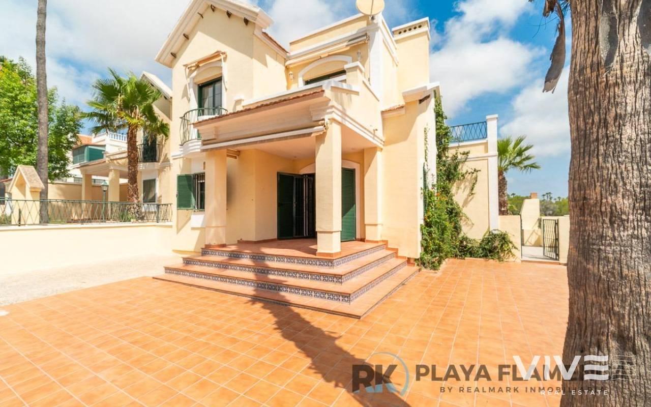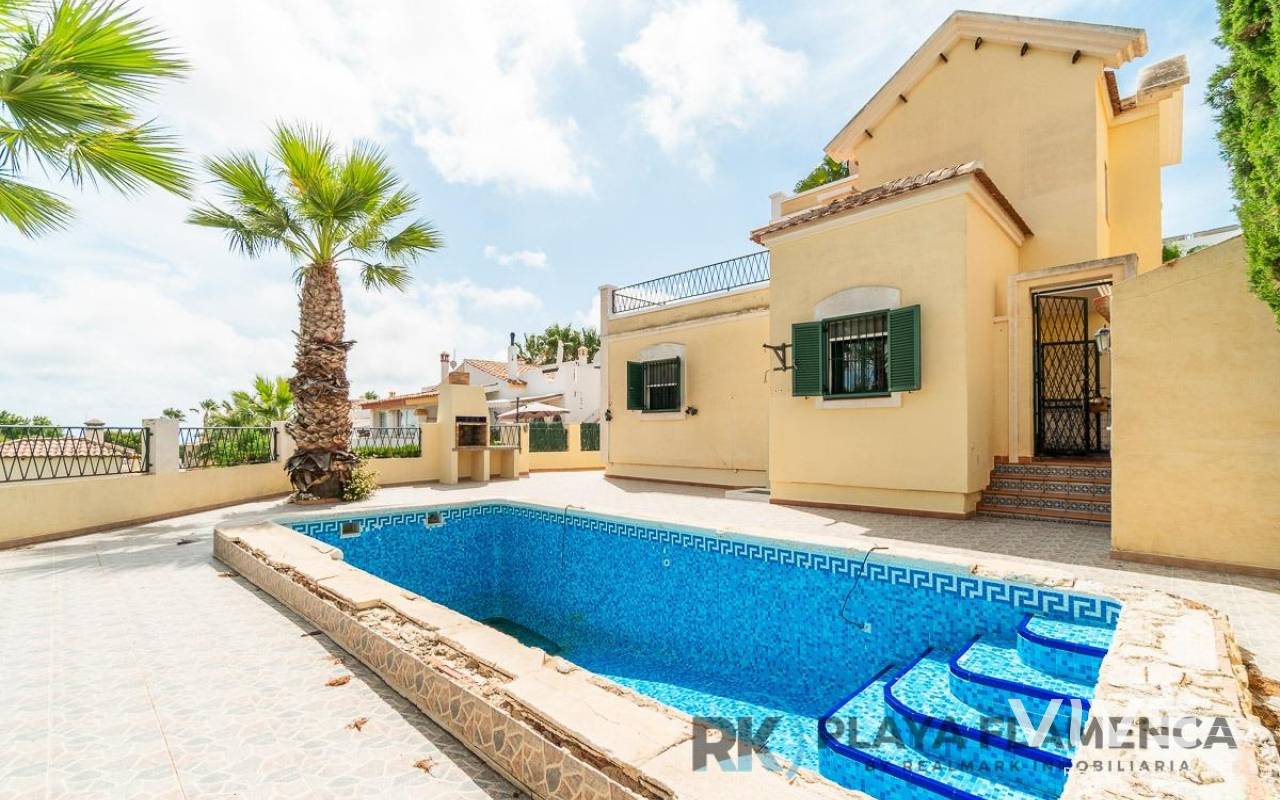 In one of the quietest and most exclusive areas of the VillaMartin development, very close to three golf courses and with its own garden and pool, lies this beautiful villa overlooking green areas, perfect for a large family.. The property is located near three golf courses: Las Ramblas, Campoamor, and Villamartín. It also has easy access to the AP-7 motorway exit, with direct connections to the airports of Alicante (approx. 40 km) and Murcia (approx. 40 km).. It features a communal pool with gardens, where you can enjoy sunbathing and swimming with the rest of the neighbors. It also has its own garden and tiled terraces, and a pool in need of renovation.. The villa's size is ideal for those looking for space, or for entertaining guests and friends; with its 3 bedrooms, 2 bathrooms, and a good-sized plot and garden area.. The 410-square-meter plot is perfect for having space and a sense of independence, with its paved front garden with a vehicle entrance and a paved rear garden with unobstructed views. However, since it's paved and doesn't have many trees and plants, it doesn't require much maintenance or work. The villa faces south on its main facade, terraces, and solarium, so it has sun practically all day. This villa is undoubtedly the dream of many.. And the layout of the home: accessed from the garden, as mentioned, is the first terrace, facing south-southwest. It has sun all day long, but at the same time, being open to the garden and the street, it lets in a full breeze. This spacious terrace, with room for sofas and tables, leads to the main entrance of the home with a security door, which opens onto the spacious and bright living and dining area with a fireplace. It also has a separate kitchen with its own door and window, allowing you to cook without having to worry about odors and grease entering the rest of the home.. Also on the ground floor is a spacious bedroom with a built-in wardrobe and a bathroom with a walk-in shower. This means that if the family has an elderly person or someone with mobility issues, they can live on this floor alone without having to go up and down stairs.. The first floor, accessible via the two-flight interior staircase with easy access, leads to the other two bedrooms with built-in wardrobes and direct access to the large solarium and balcony. This floor also features a second bathroom, this time with a bathtub for relaxing soaks and built-in furniture.. This means that each floor has its own bathroom, bedrooms, and space to enjoy both the outdoors and indoors, with terraces, making it the perfect home for a large family.. . The home is worth a visit for its spaciousness, its light, its proximity to all amenities and the golf course, and its tranquility.