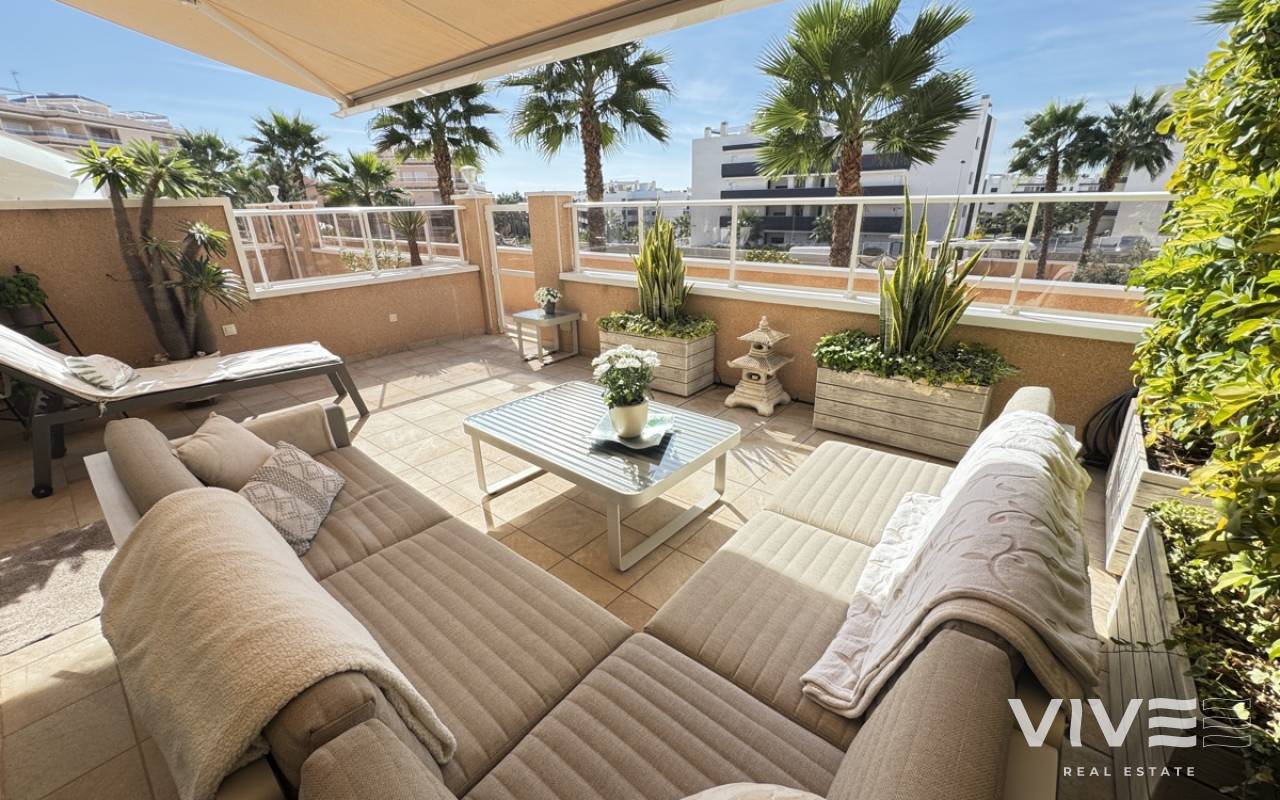 Experience the ultimate in comfort and luxury in this fabulous 2-bedroom, 2-bathroom ground floor modern apartment, perfectly situated in the desirable Vista Azul XXIX complex in Villamartin. KEY FEATURES: - South-Facing Front Terrace: Relax and unwind on the lovely south-facing front terrace with seating area, perfect for alfresco dining or relaxation. - Enclosed Terrace with Ducted Air Conditioning: Enjoy the enclosed terrace with dining area, equipped with ducted air conditioning, making it perfect for use all year round. - Spacious Lounge and Kitchen: A bright and airy lounge area flows seamlessly into a beautiful kitchen with integrated appliances, perfect for cooking and entertaining. - Master Bedroom with Sliding French Doors: The master bedroom features sliding french doors into the lounge, creating a sense of spaciousness and elegance. - Separate Walk-In Wardrobe and Bathroom: A spacious walk-in wardrobe and bathroom, perfect for relaxation and pampering. - 2nd Bedroom with Wet Room: The 2nd bedroom leads out to a toilet/wet room with shower, perfect for guests or family members. ADDITIONAL FEATURES: - Covered Rear Terrace: A covered rear terrace with seating area, perfect for escaping the heat of the hot summers while enjoying wonderful views of the golf course reservoir. - Underfloor Heating Throughout: Stay warm and cozy with underfloor heating throughout the apartment. - Air Conditioning: Enjoy the comfort of air conditioning, perfect for hot summer days. - Water Filter and Electric Blinds: A water filter and electric blinds add to the apartment's luxury features. - Furnished and Irrigation System: The apartment comes furnished and includes an irrigation system, making it perfect for gardening enthusiasts. - Situated beside the famous Villamartin Plaza and fantastic 18 hole golf course. COMPLEX FACILITIES: - Heated Indoor Pool and Sauna: Relax and unwind in the heated indoor pool and sauna, perfect for cold winter days. - Jacuzzi Facilities: Enjoy the jacuzzi facilities, perfect for relaxation and pampering. - Large Outdoor Communal Pool: A large outdoor communal pool with spacious gardens and play area for kids, perfect for family fun. - Underground Parking Space and Storage Cupboard: The price includes an underground parking space and storage cupboard, adding to the apartment's value.