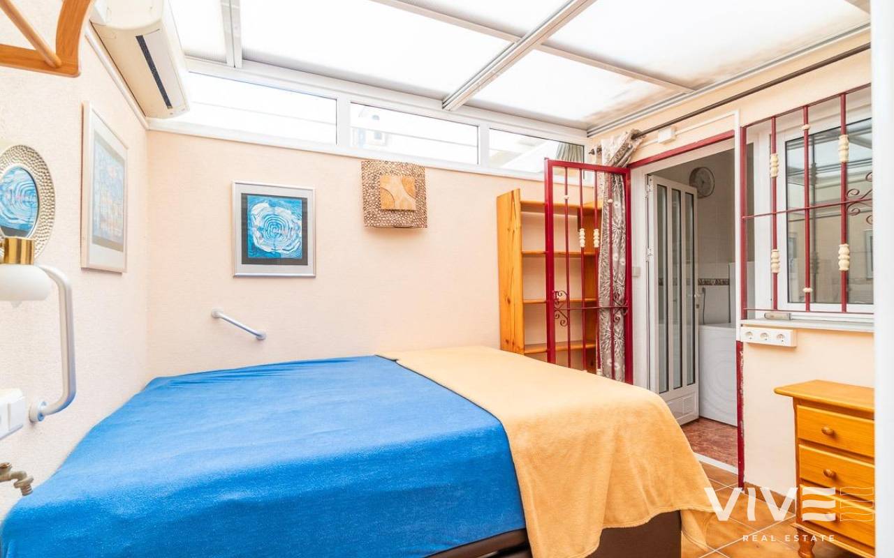 . 1.997 / 5.000. In the heart of Playa Flamenca, just a short walk from the Zenia Boulevard shopping center, beaches, sports facilities, leisure areas, and schools, you'll find this beautiful and bright south-facing semi-detached triplex.. . The property is located within a gated community with automatic gates, ample parking on the access streets, and a central communal pool area, offering privacy and peace from noise and traffic. Its south-facing orientation ensures sunshine practically all day long, and it also features a solarium at the rear, providing shade during the summer months when the front of the house is too hot. A terrace at the front entrance offers year-round sun enjoyment. The house features a living-dining room with a fireplace, a separate kitchen allowing for cooking with the door closed and preventing cooking smells and grease from spreading to the rest of the house, and direct access from the kitchen to a covered patio with an aluminum and glass roof. This patio can be used as a second living room, a laundry room, or even a bedroom for those who cannot access the upper floors, as it includes a bathroom with a shower. The first floor, accessed via an internal staircase, comprises two bedrooms with built-in wardrobes, one of which has a balcony, and a full bathroom with a walk-in shower. The third and top floor offers a third attic bedroom with an en-suite bathroom and shower, perfect for children or teenagers, as it features a solarium-terrace accessible only from this level. The house is furnished, includes all kitchen appliances, and is in perfect working order, ready for immediate occupancy. Whether as a holiday home or for year-round living, it's worth a visit to discover its many advantages and uses.