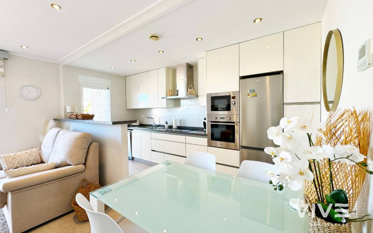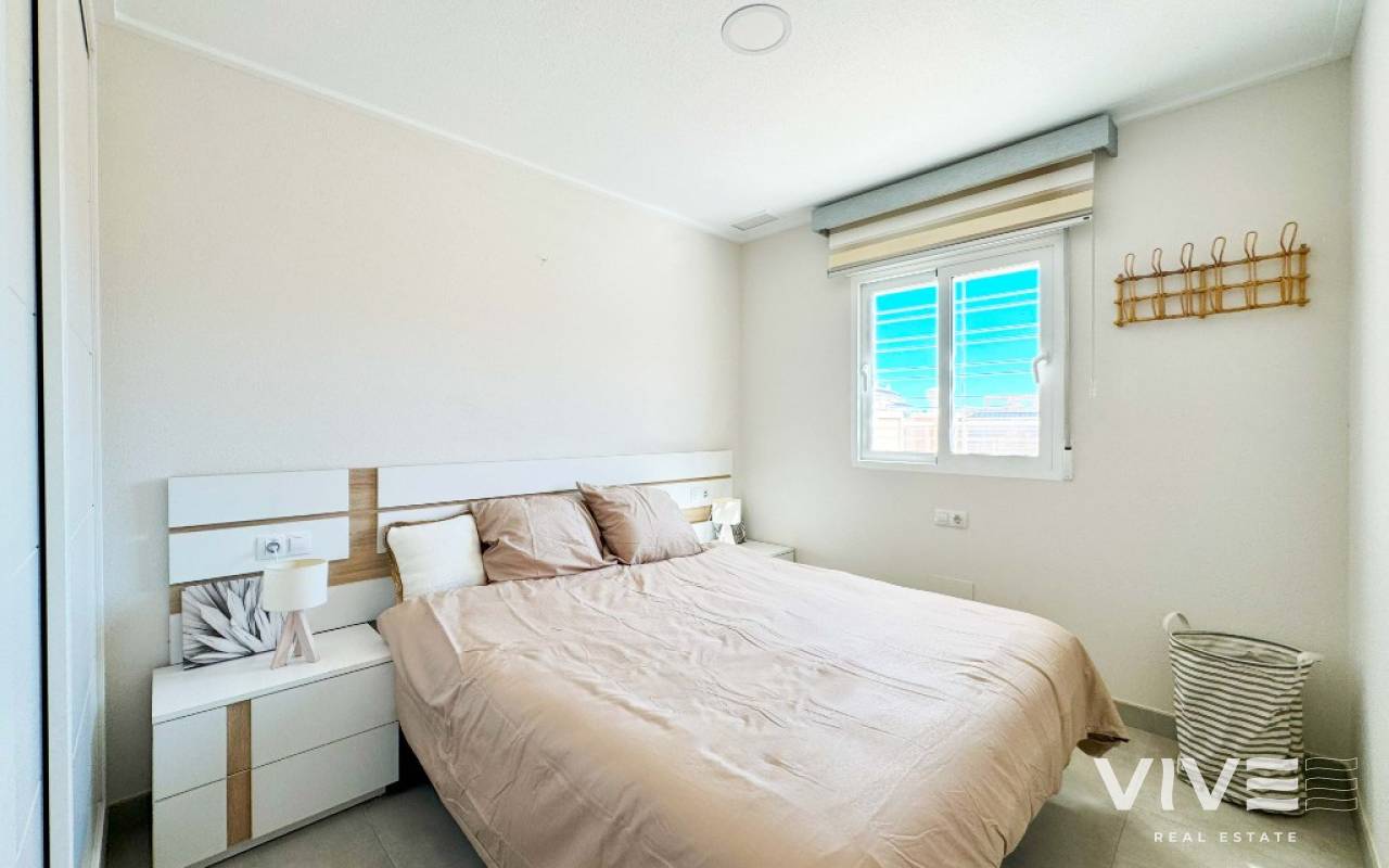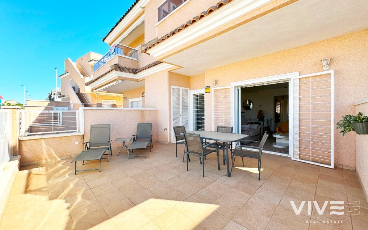 Apartment ground floor for short-term rent in Vista Azul, Punta PrimaWe offer this nice property in perfect condition on the ground floor, with the south facing terrace. The property is located in the gated community Vista Azul, Punta Prima with close proximity to all possible services.The apartment is fully furnished and consist of a large south facing front terrace, green planting and storage space, hall with wardrobe, a bright and spacious living/dining room with an open plan fully equipped kitchen, two bedrooms with fitted wardrobes, two complete bathrooms (one is en-suite) with underfloor heating, air conditioning (hot/cold) throughout the property, electric blinds, and a second terrace facing towards the communal green area and swimming pool.The property also has a parking space.The apartment is ready to move in and very well maintained. The apartment must be visited to fully understand its sovereignty.
