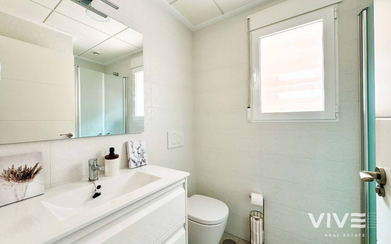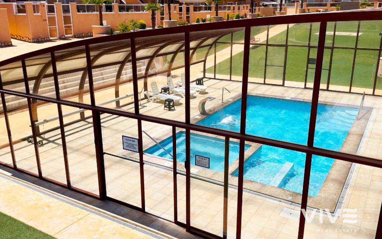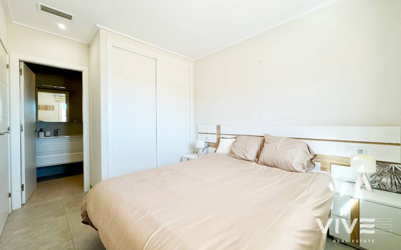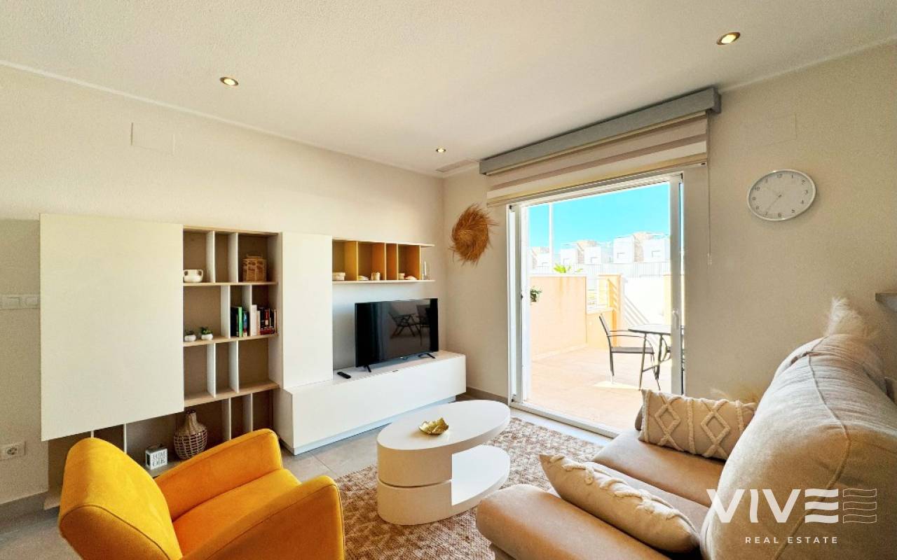 Apartment ground floor for short-term rent in Vista Azul, Punta PrimaWe offer this nice property in perfect condition on the ground floor, with the south facing terrace. The property is located in the gated community Vista Azul, Punta Prima with close proximity to all possible services.The apartment is fully furnished and consist of a large south facing front terrace, green planting and storage space, hall with wardrobe, a bright and spacious living/dining room with an open plan fully equipped kitchen, two bedrooms with fitted wardrobes, two complete bathrooms (one is en-suite) with underfloor heating, air conditioning (hot/cold) throughout the property, electric blinds, and a second terrace facing towards the communal green area and swimming pool.The property also has a parking space.The apartment is ready to move in and very well maintained. The apartment must be visited to fully understand its sovereignty.