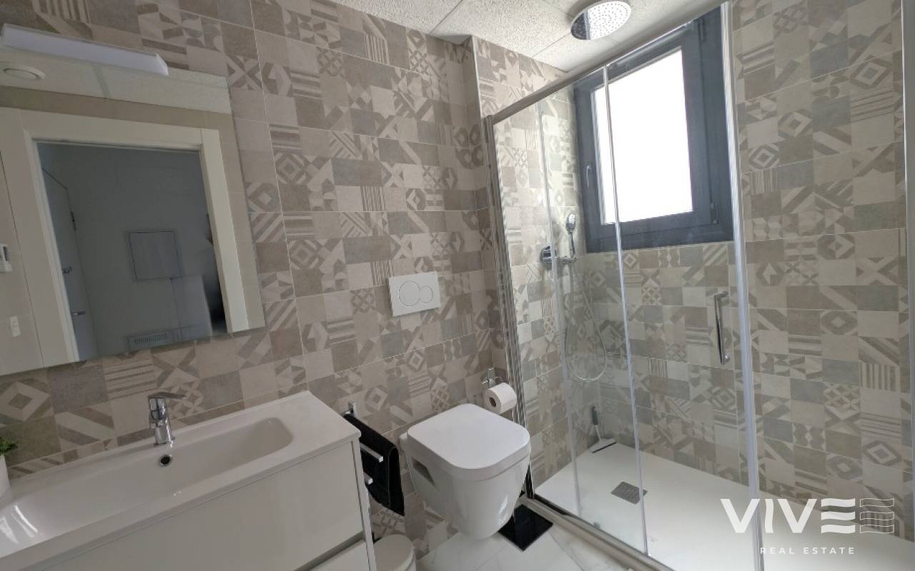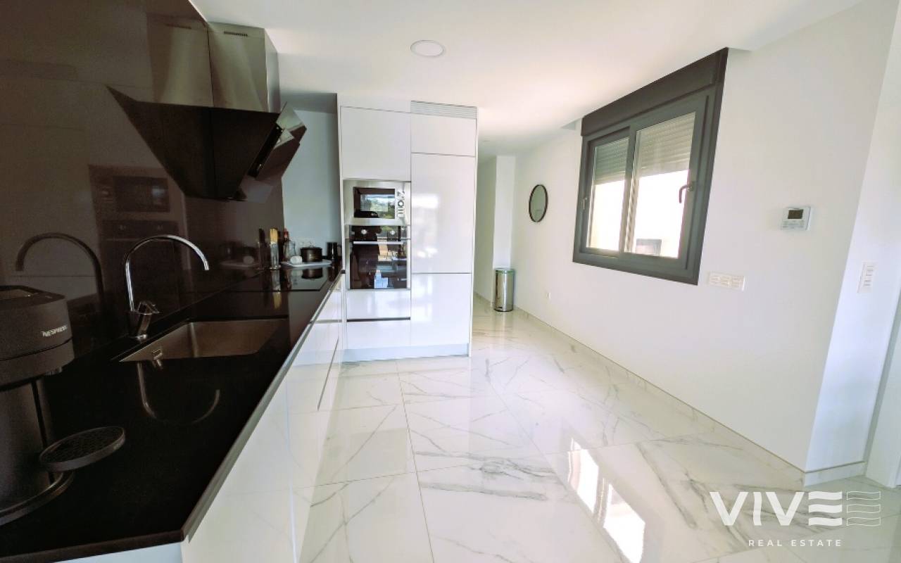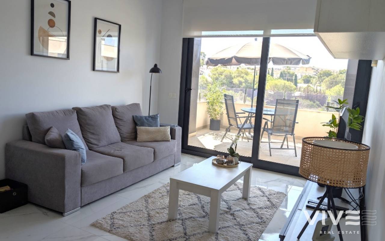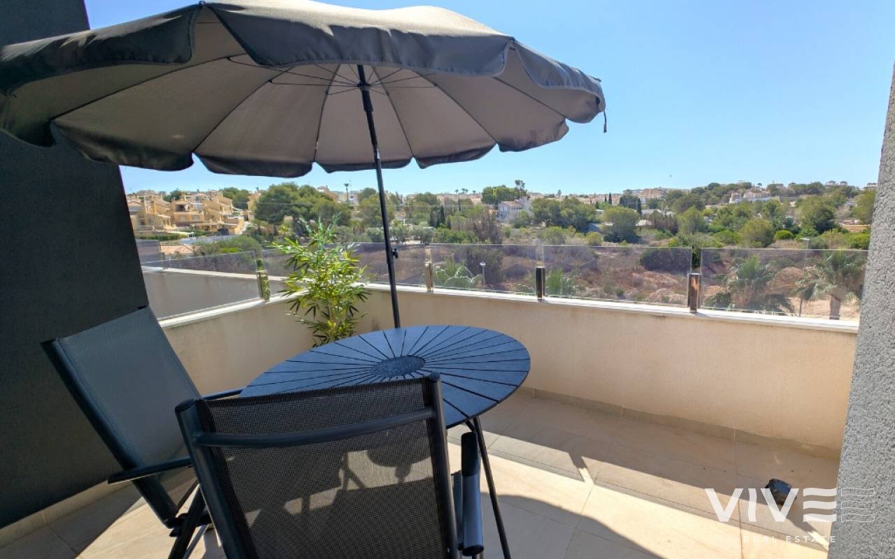 For sale modern Luxury 2 bed 2 bath. in Amanecer VI , Los Altos, VillamartinPenthouse for sale in this gated complex with communal swimming pool, underground parking and secure store room for bicyles etc.We are proud to present to you this Penthouse apartment which is ultra modern and open plan. On entry you have a hallway with the guest bathroom to the left, then you have a store cupboard with washing machine, a little further to the right you have the master suite double room with wardrobe, en suite bathroom and a window with views to the swimming pool, the hallway leads to the open plan living area with a modern kitchen with breakfast bar open to the dining area and then the seating area, from here you have patio doors to the terrace which has been segragated by glass currtains creating another sitting area/sun lounge which can be used fully open when required. The terrace also has a side view to the pool. The kitchen is fully equipped, throught the apartment there is air conditioning hot and cold, both bathrooms have underfloor heating, most furniture is included and an inventory will be supplied. The whole apartment is bright and area. There is lift access to all floors and in the underground is a designated parking space and a secure private store room. Located close to an Aldi supermarket and several bars within a 500m radius, also for those who don't drive from the Aldi you will find a bus service for the beaches of Orihuela Costa and for the shoppers you will be happy to know it also goes to Zenia Boulevard.