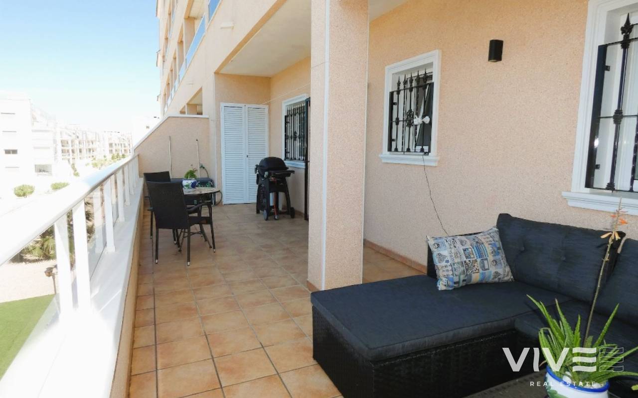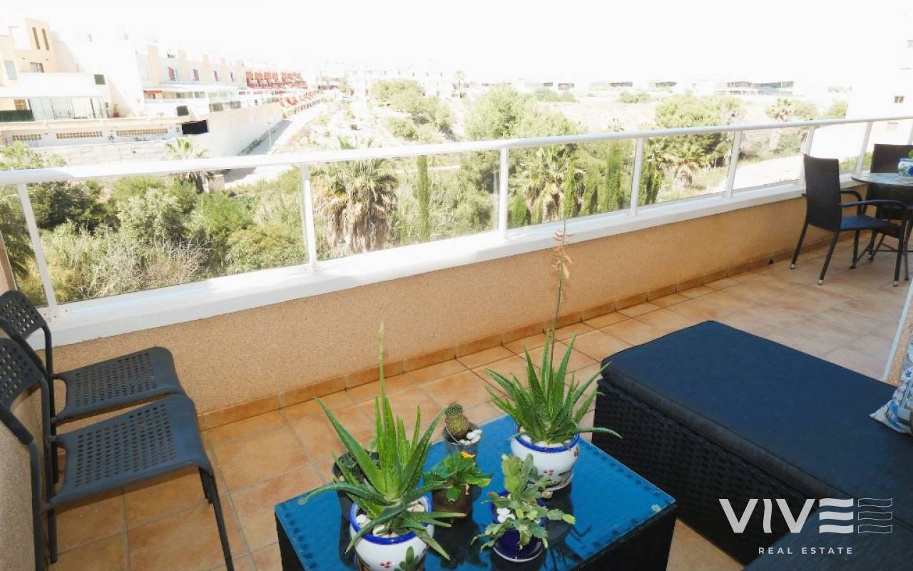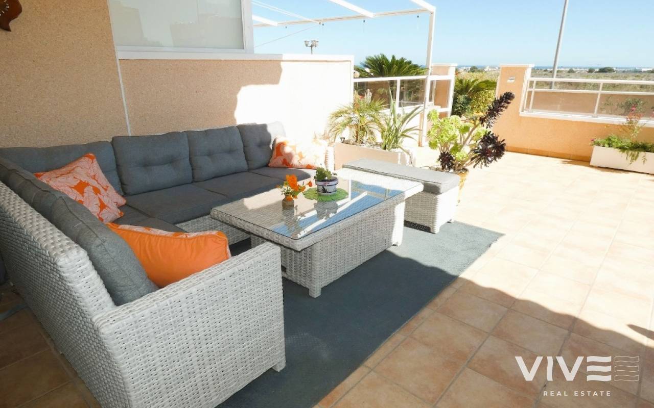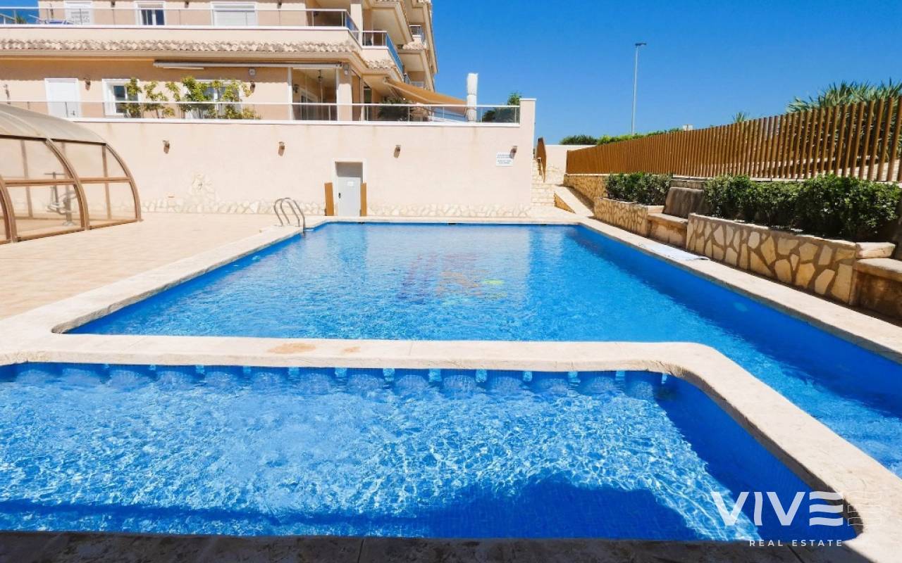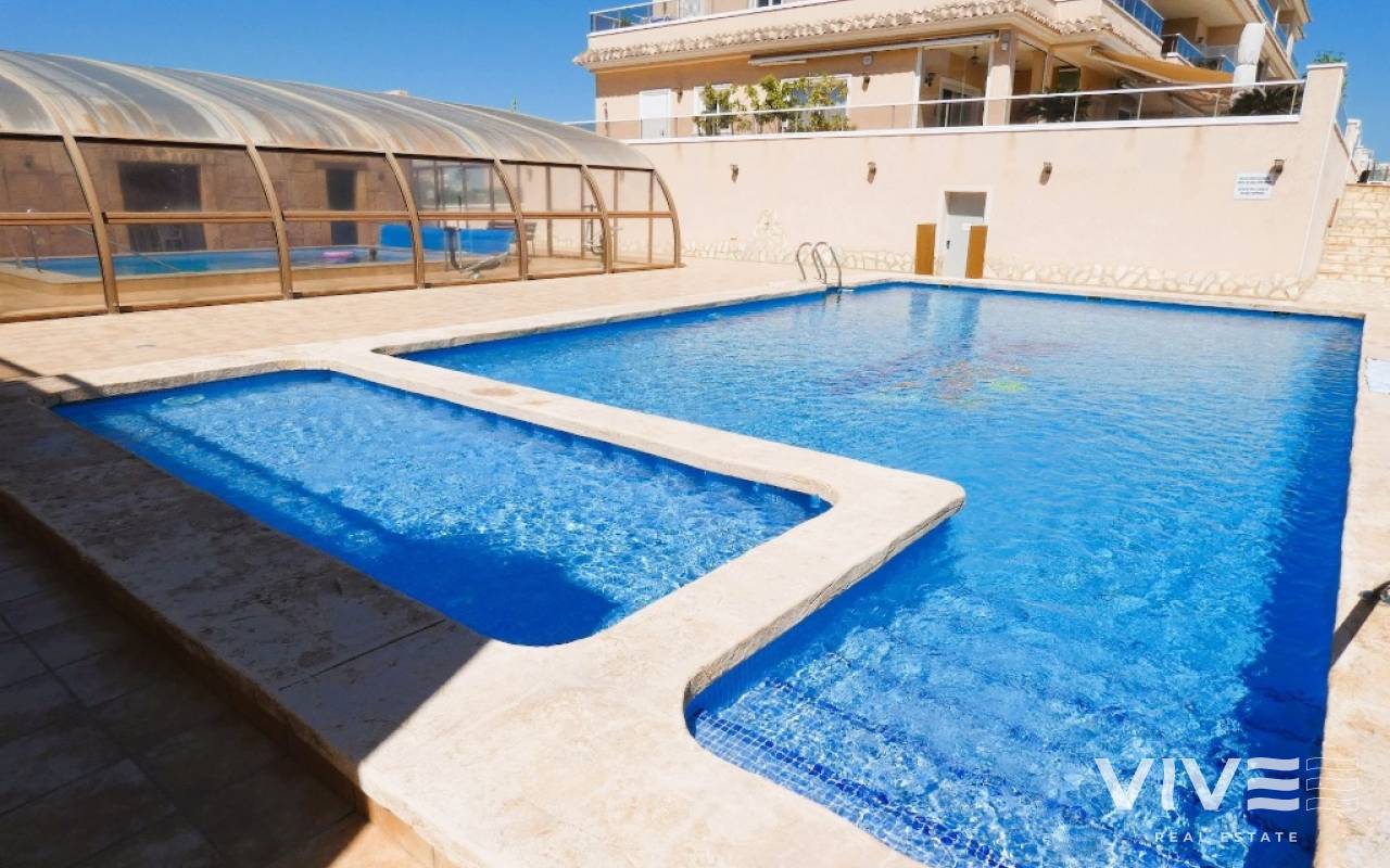 Lovely apartment with 3 bedrooms, 2 bathrooms and a roof terrace with a sea view!We are pleased to present this beautiful ground floor apartment located in the popular area Los Dolses. The apartment has 3 bedrooms with built-in wardrobes, 2 stylish bathrooms, bright and airy living room with open kitchen, terrace outside the living room and a large terrace of 30 m2 . The apartment is sold with furniture, appliances and air conditioning included in the price. The apartment is generally well equipped and maintains a high standard,. You have private parking in the underground garage facility and heated pool.The common area has large green areas, two swimming pools and a jacuzzi. Los Dolses is approximately 45 minutes' drive from Alicante airport. You have approximately 5 minutes to walk to a row good restaurants and cafes. There is also a grocery store just minutes away from the apartment. If you want a trip on one of the many beaches in the area, then it takes 5 minutes to drive, or about 15 minutes by bike. The popular the shopping center "Zenia Boulevard" and several 18-hole golf courses are located and only a few minutes' drive from the apartment.
