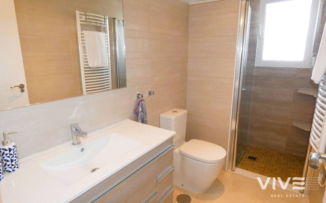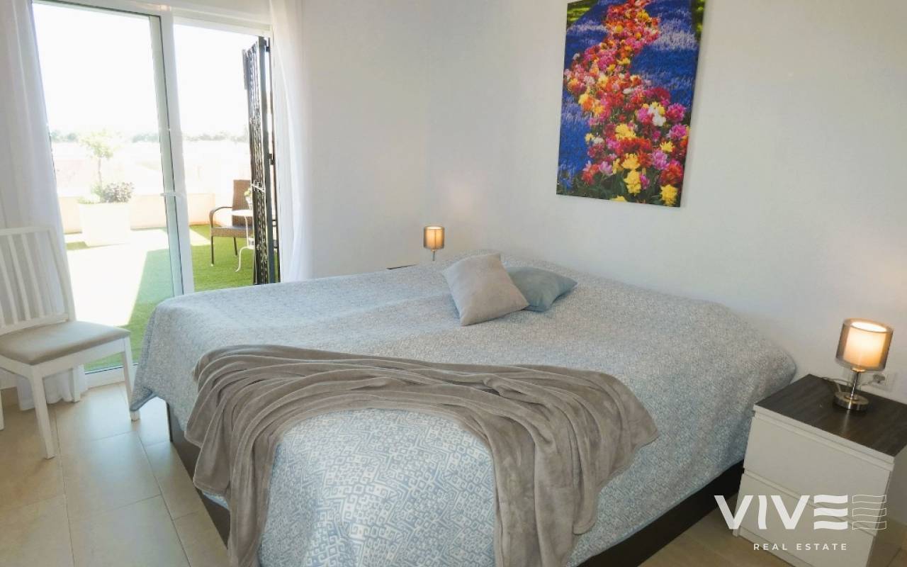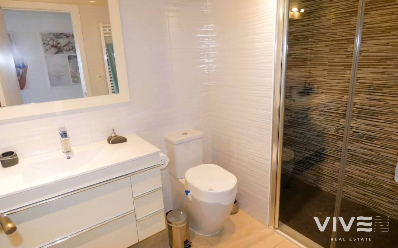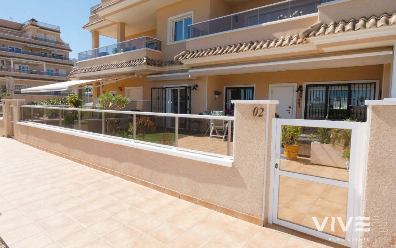 Lovely apartment with 3 bedrooms, 2 bathrooms and a roof terrace with a sea view!We are pleased to present this beautiful ground floor apartment located in the popular area Los Dolses. The apartment has 3 bedrooms with built-in wardrobes, 2 stylish bathrooms, bright and airy living room with open kitchen, terrace outside the living room and a large terrace of 30 m2 . The apartment is sold with furniture, appliances and air conditioning included in the price. The apartment is generally well equipped and maintains a high standard,. You have private parking in the underground garage facility and heated pool.The common area has large green areas, two swimming pools and a jacuzzi. Los Dolses is approximately 45 minutes' drive from Alicante airport. You have approximately 5 minutes to walk to a row good restaurants and cafes. There is also a grocery store just minutes away from the apartment. If you want a trip on one of the many beaches in the area, then it takes 5 minutes to drive, or about 15 minutes by bike. The popular the shopping center "Zenia Boulevard" and several 18-hole golf courses are located and only a few minutes' drive from the apartment.