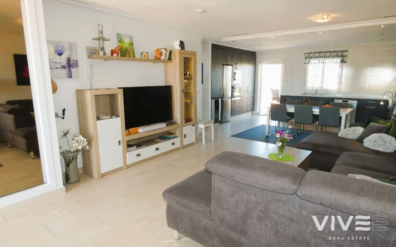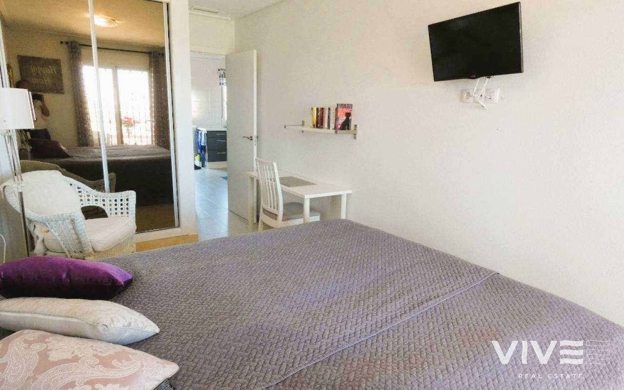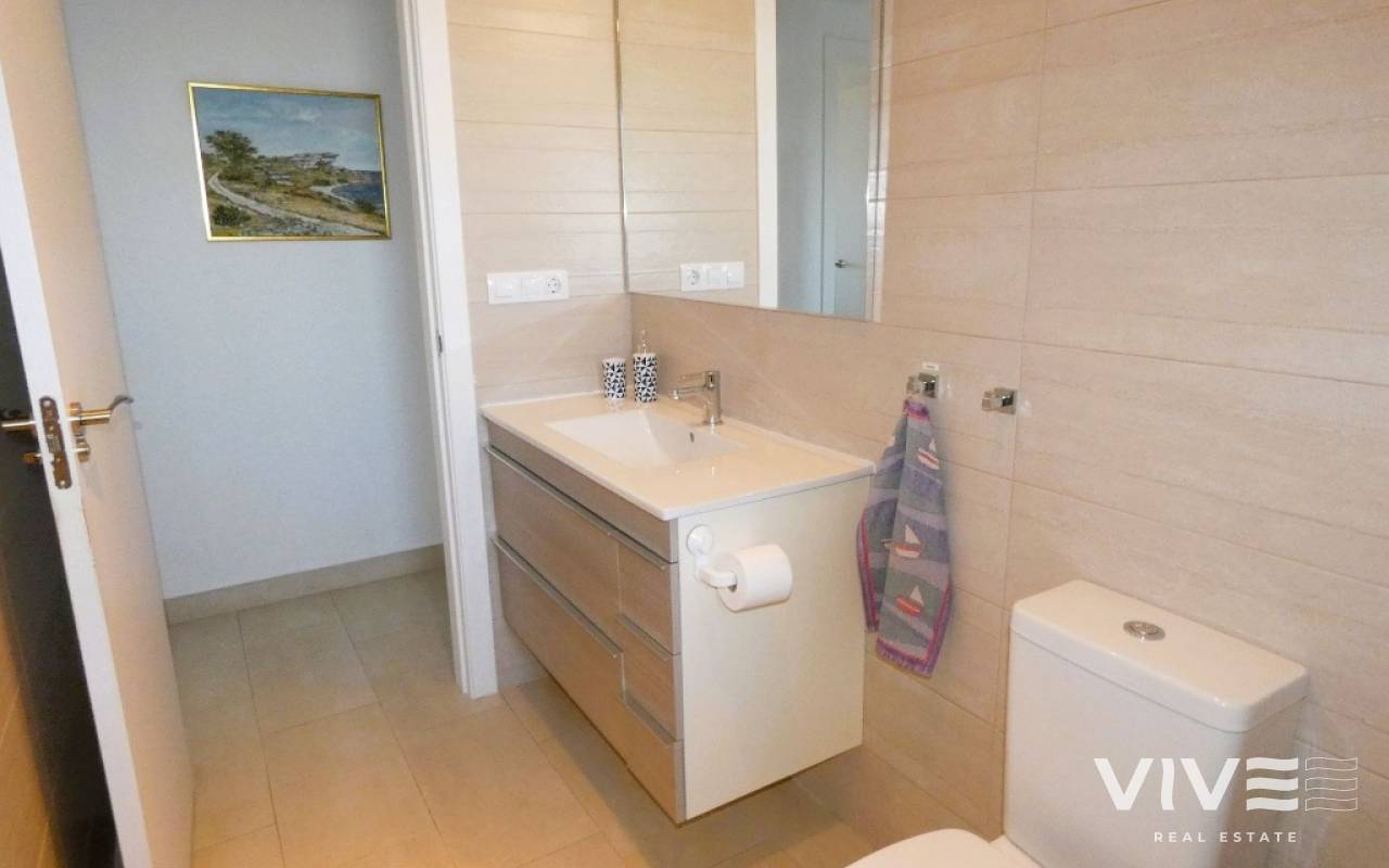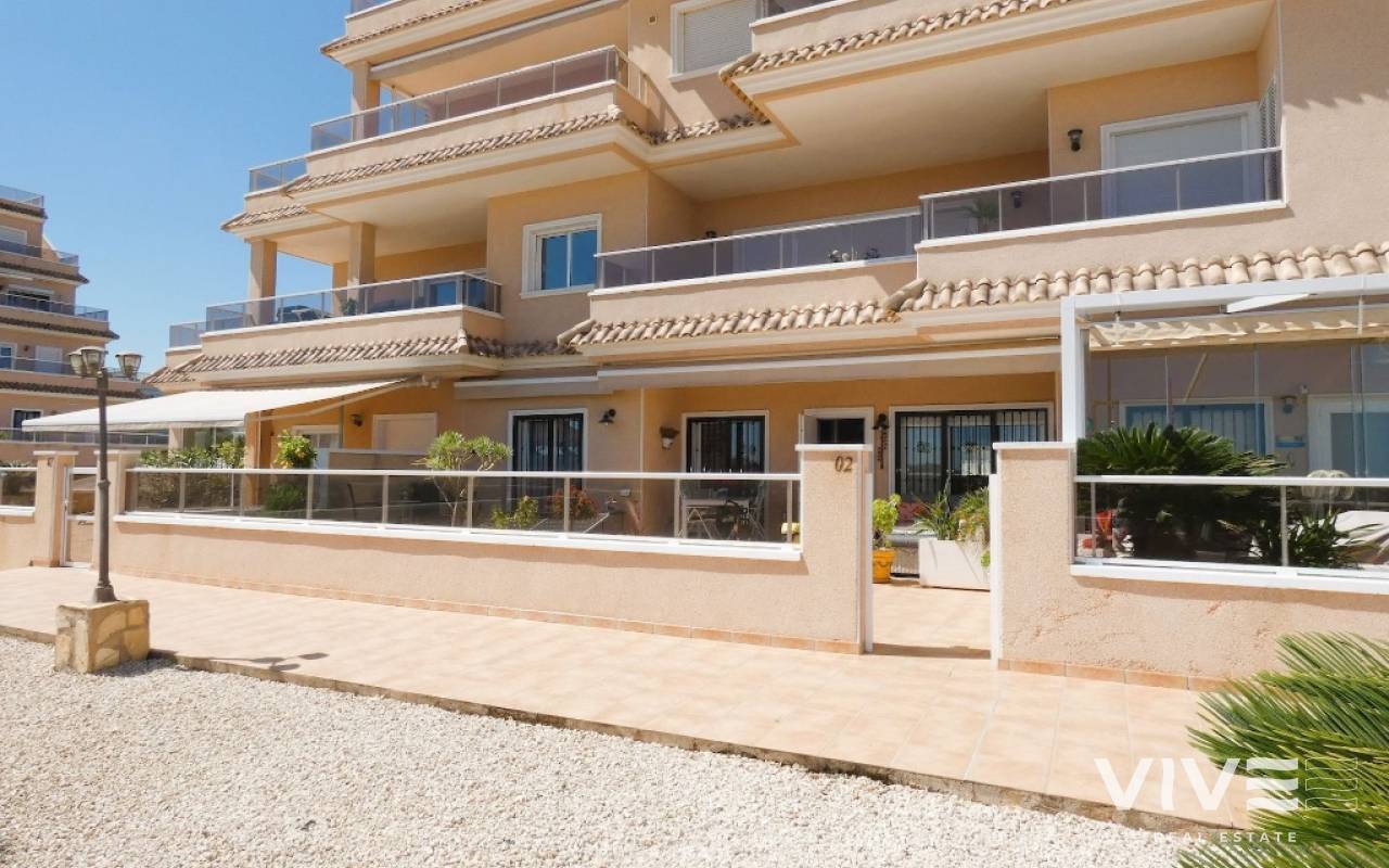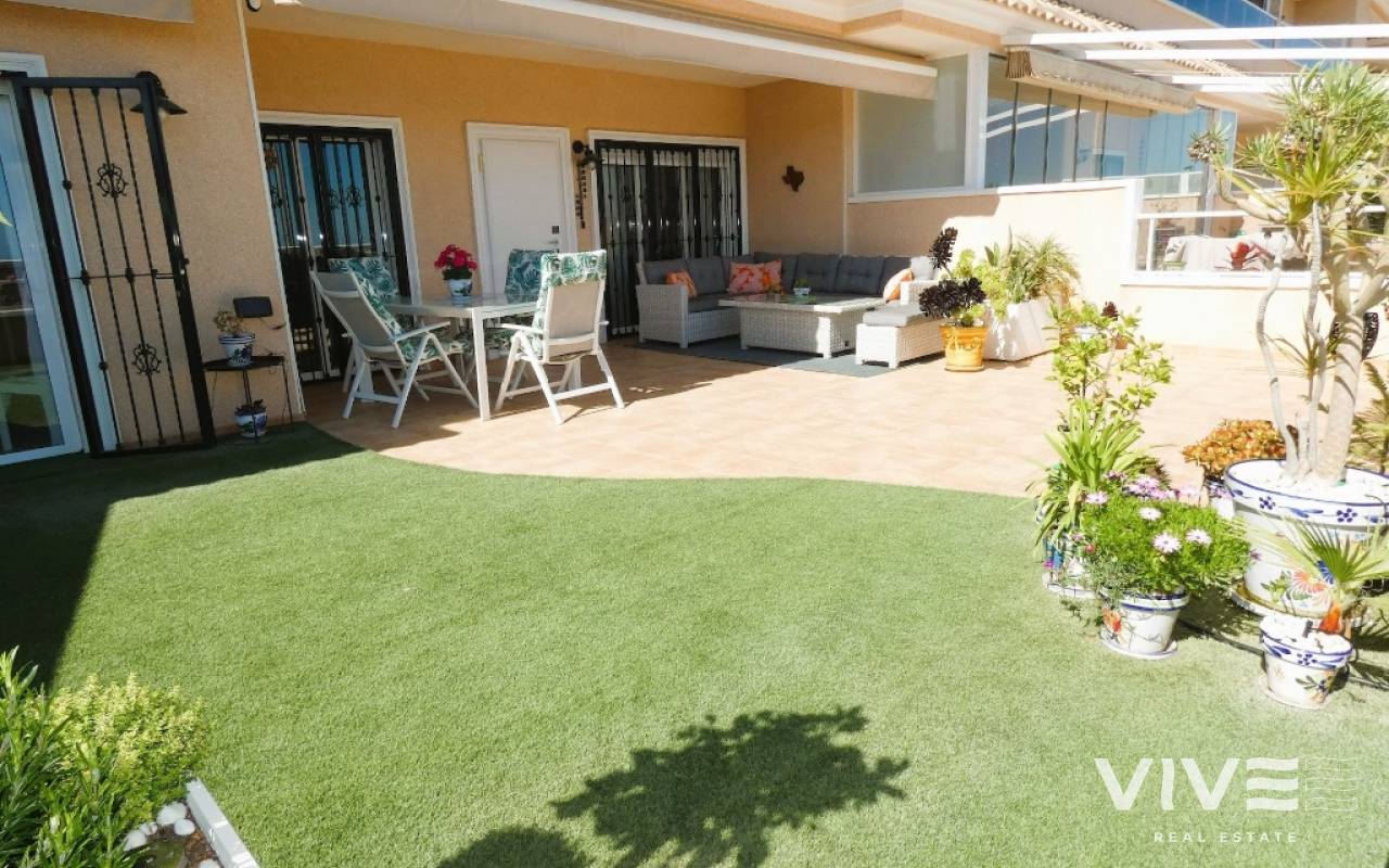 Lovely apartment with 3 bedrooms, 2 bathrooms and a roof terrace with a sea view!We are pleased to present this beautiful ground floor apartment located in the popular area Los Dolses. The apartment has 3 bedrooms with built-in wardrobes, 2 stylish bathrooms, bright and airy living room with open kitchen, terrace outside the living room and a large terrace of 30 m2 . The apartment is sold with furniture, appliances and air conditioning included in the price. The apartment is generally well equipped and maintains a high standard,. You have private parking in the underground garage facility and heated pool.The common area has large green areas, two swimming pools and a jacuzzi. Los Dolses is approximately 45 minutes' drive from Alicante airport. You have approximately 5 minutes to walk to a row good restaurants and cafes. There is also a grocery store just minutes away from the apartment. If you want a trip on one of the many beaches in the area, then it takes 5 minutes to drive, or about 15 minutes by bike. The popular the shopping center "Zenia Boulevard" and several 18-hole golf courses are located and only a few minutes' drive from the apartment.