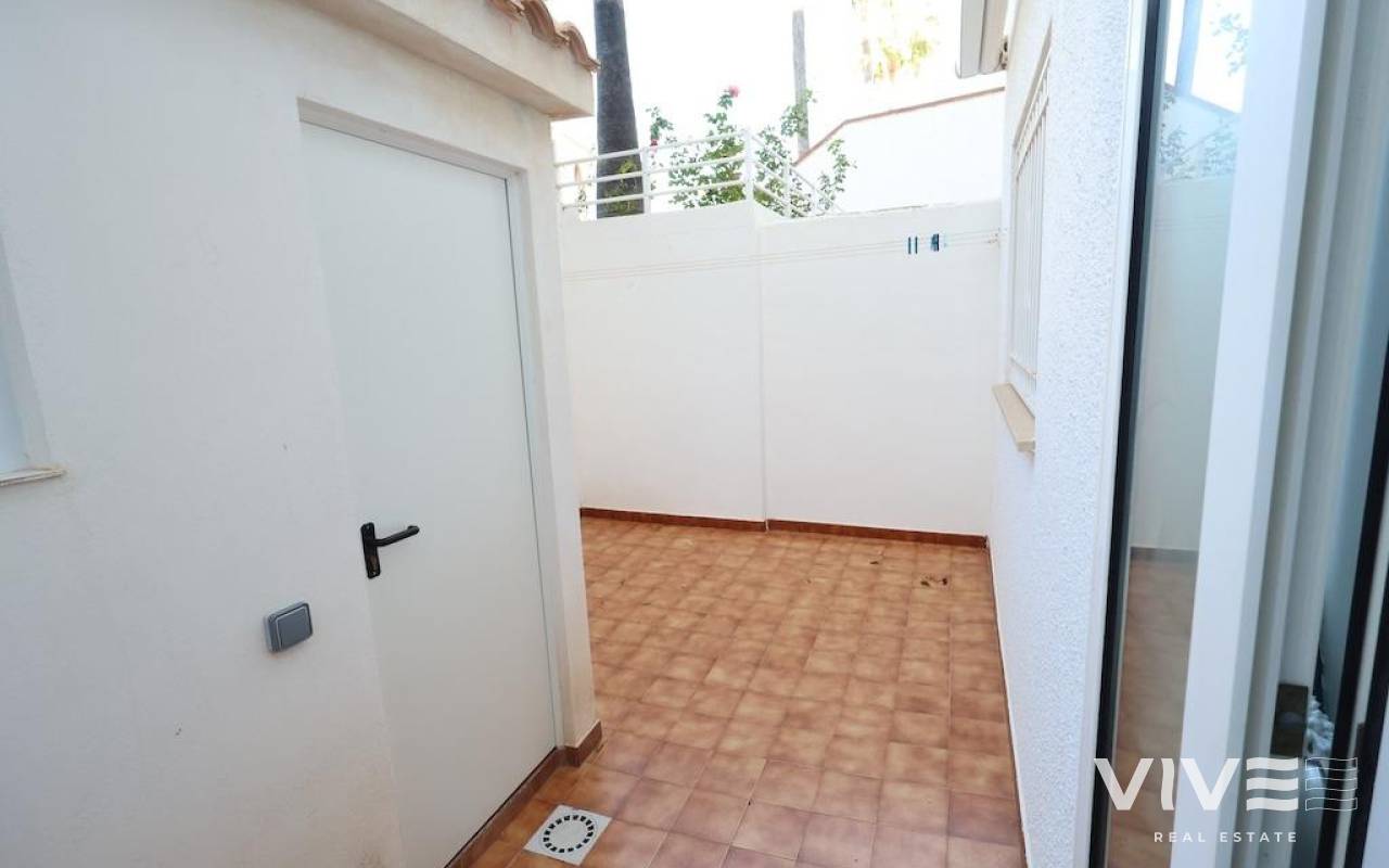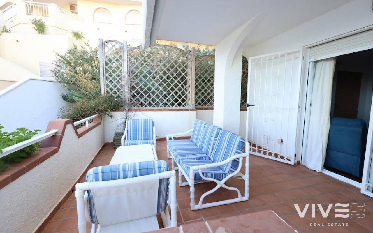 Aguamarina Ground floor bungalow with sea views. . With a total built area of 81 m2 and 75 m2 of usable space, this property offers the perfect setting to enjoy the Mediterranean lifestyle. . It features 2 spacious double bedrooms providing comfort and privacy, as well as 2 well-distributed full bathrooms to meet daily needs. . There is a large living-dining room, a spacious independent kitchen with a closed utility room and rear patio, and a large front terrace. . The residential complex includes a communal pool and is located just 100 meters from Aguamarina beach. . The property is sold fully furnished.