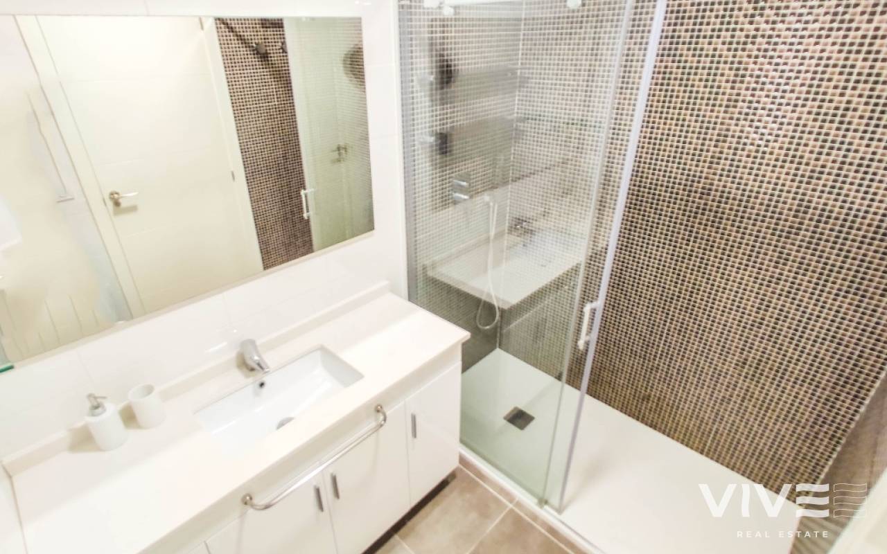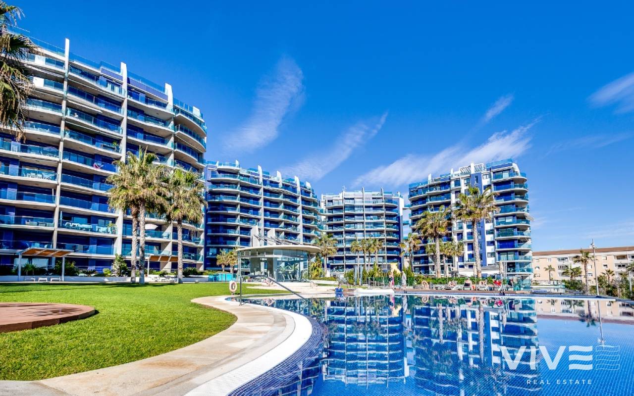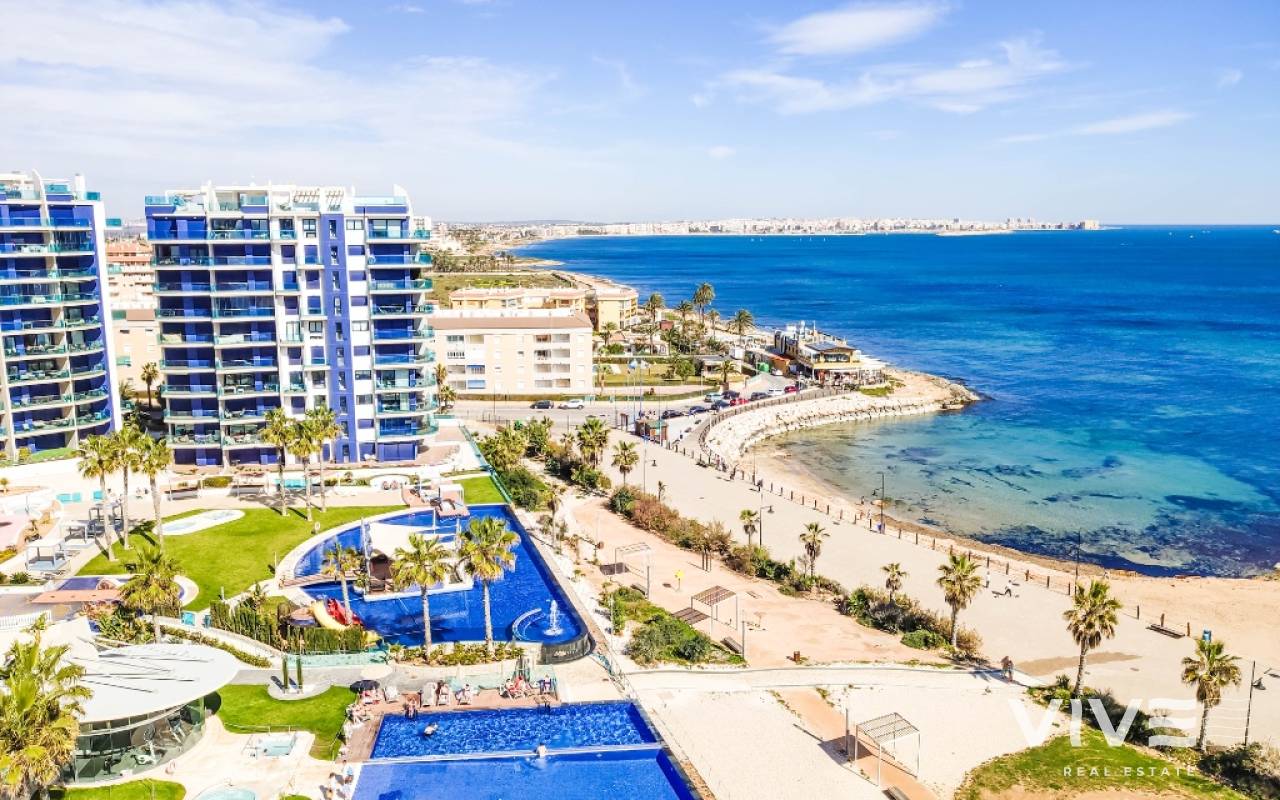 For sale an exceptional frontline apartment in first sea line in Punta Prima. Penthouse consists of 2 bedrooms, 2 bathroom, 9 floor apartment in the Sea Senses development in Punta Prima with spectacular all round panoramic sea views and only 50 meters from the Rocio del Mar beach. Hot and cold air conditioning. Lift access is available. The modern galley-style kitchen is fully equipped with dishwasher, oven, microwave, coffee machine and leads to a utility room equipped with washing machine and tumble drier.The spacious master bedroom benefits from wonderful sea views, large fitted wardrobes. The en-suite bathroom includes a large walk-in shower. Another bedroom benefits large fitted wardrobes.The family bathroom consists of a large walk in shower, lavatory and wash hand basin with separate storage unit.The ultra modern communal area includes three infinity pools - one heated for all year round use, four Jacuzzis, Finnish and Turkish saunas, gymnasium, Bali beds, pool bar and chill out area offering food and drinks, pool Jacuzzi's, children's play area with water fountains, children's paddling pool, play house, football and padel tennis courts.