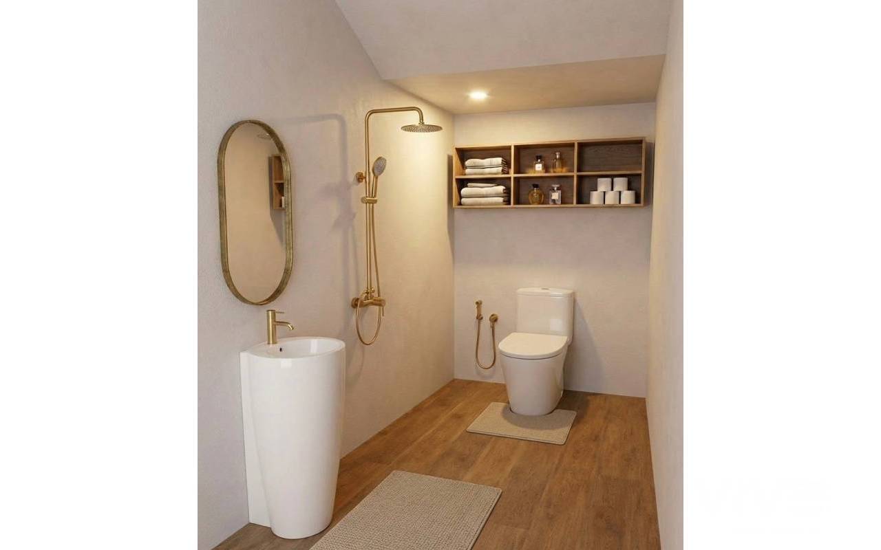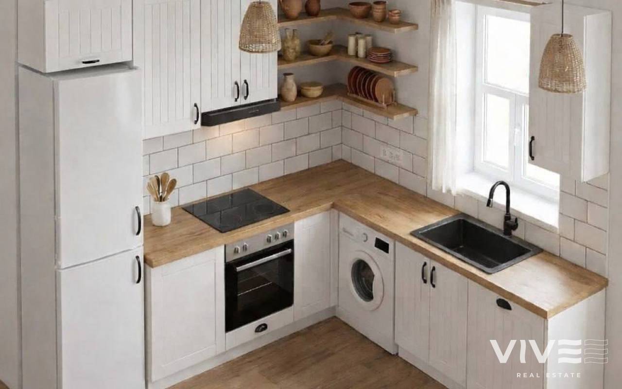 The independent kitchen ensures practicality for daily use, while two balconies — located on the living room level and upper bedroom level — provide outdoor spaces at different heights and moments of the day.