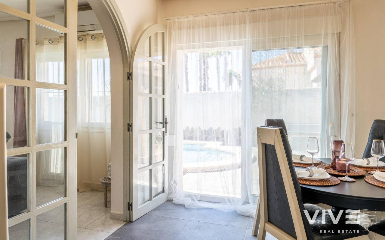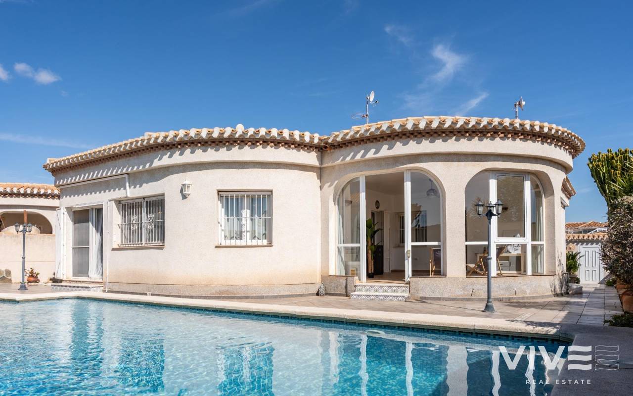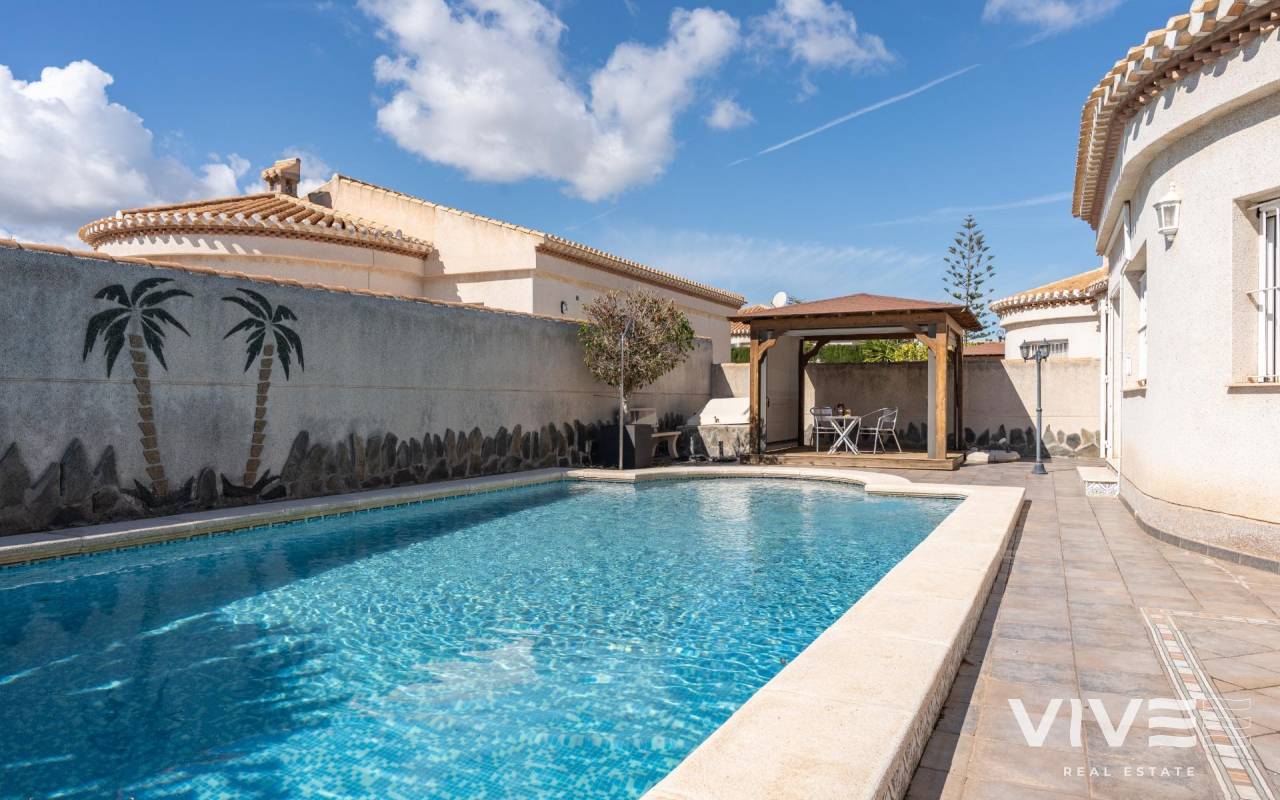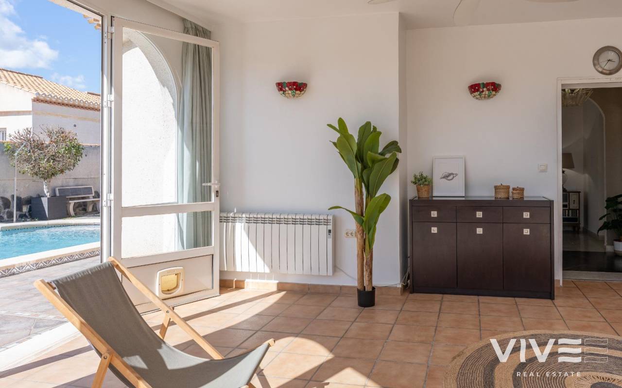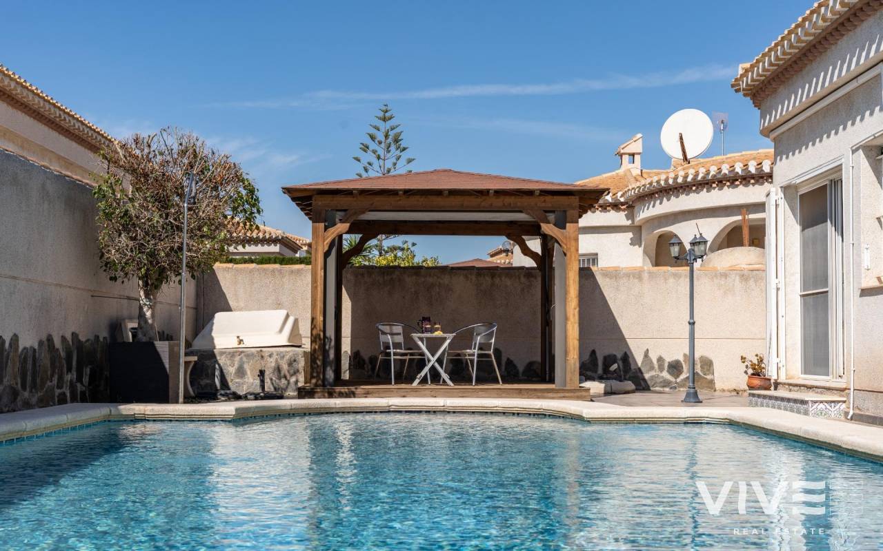 This detached villa, in perfect condition and superbly located in the heart of Playa Flamenca, is truly within walking distance of everything: supermarkets, municipal sports facilities, private sports centers, Zenia Boulevard shopping centre, public school, Town Hall, shops, medical services, and the beaches of Orihuela Costa.. . The Saturday market is located on the same street as the property, offering direct access so you can enjoy shopping for fresh fruit, vegetables, and traditional products, as well as the atmosphere of living in a small Spanish town.. . The plot size of this property is 525 m2, offering many possibilities to enjoy the outdoor space, including a pool area, barbecue, solarium, pergolas, and parking. It is also very easy to maintain, with terraces, artificial grass, and gravel areas designed to keep the garden and outdoor areas in perfect condition without requiring excessive work. There is also an exterior access storage room next to the barbecue and terrace area, allowing convenient use without needing to enter the house when enjoying the pool area.. . Parking is available within the plot itself, with automatic vehicle access gates and a private garage-storage area to keep your vehicle protected from the Alicante sun. The pool area is perfect for sunbathing in privacy, while the built-in barbecue and wooden pergola allow you to fully enjoy the potential of the plot thanks to its south-facing orientation, providing sunshine almost all day and natural light throughout the main living areas of the property.. . At the entrance of the house there is a glazed solarium terrace with a traditional Spanish tiled roof. In winter, when the sun is lower, it is perfect for enjoying the sun, while in summer, by opening the glass windows and benefiting from the shade of the roof, it becomes a cool and ventilated space ideal for reading or spending time with family in a covered semi-outdoor area.. . From this covered terrace with arches, there is access both to the garage area and to the house itself, making it especially convenient to bring shopping directly from the car into the home.. . Through the entrance hall you reach the living room, which features an electric fireplace and south-facing windows that provide excellent natural light and sunshine. From here you access the independent kitchen-dining area, separated by doors so you can cook without smells or smoke spreading to the rest of the house.. . The kitchen has patio doors leading directly to the pool and terrace area, making outdoor living very convenient. It is equipped with kitchen units and appliances.. . The house has three spacious bedrooms with built-in wardrobes, one bathroom with a walk-in shower, and another full en-suite bathroom in the master bedroom featuring a walk-in shower and a jacuzzi.. . In summary, this is a detached villa located in a central and very well-connected area, with excellent outdoor spaces for leisure and family enjoyment. The property is in perfect condition and ready to move into. A viewing is highly recommended to fully appreciate its excellent features.. . Price: €585,000. Taxes and purchase expenses not included (according to applicable regulations). A full breakdown of additional costs will be provided prior to reservation.. . In the case of a transaction with dual agency, the professional fees payable by the buyer will be 1.5% of the final purchase price, with a minimum of €3,000, plus VAT (21%), unless otherwise expressly agreed. These fees are not included in the advertised price.