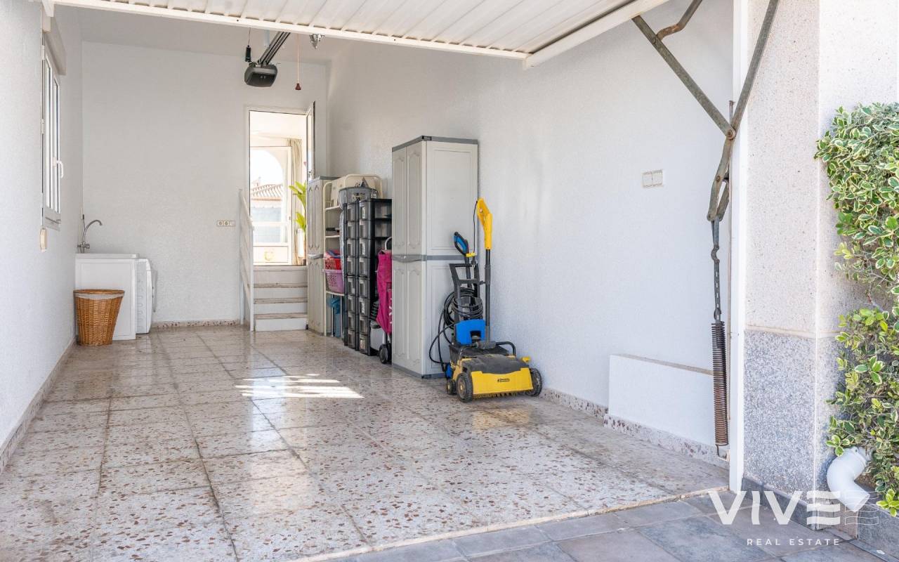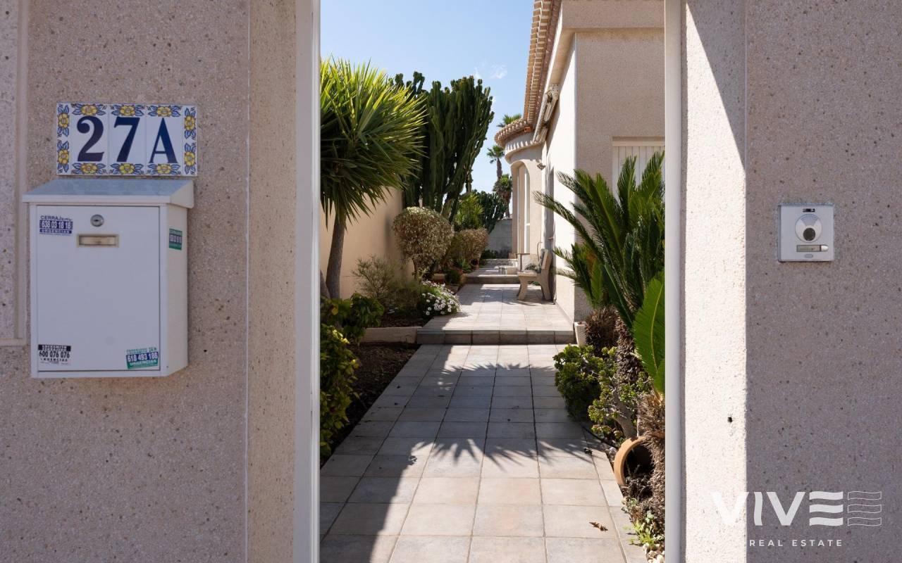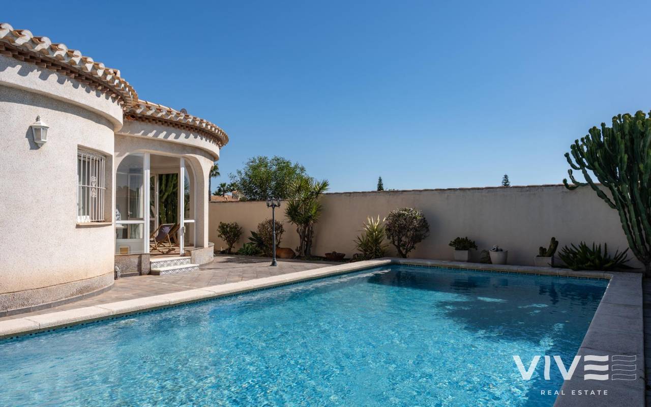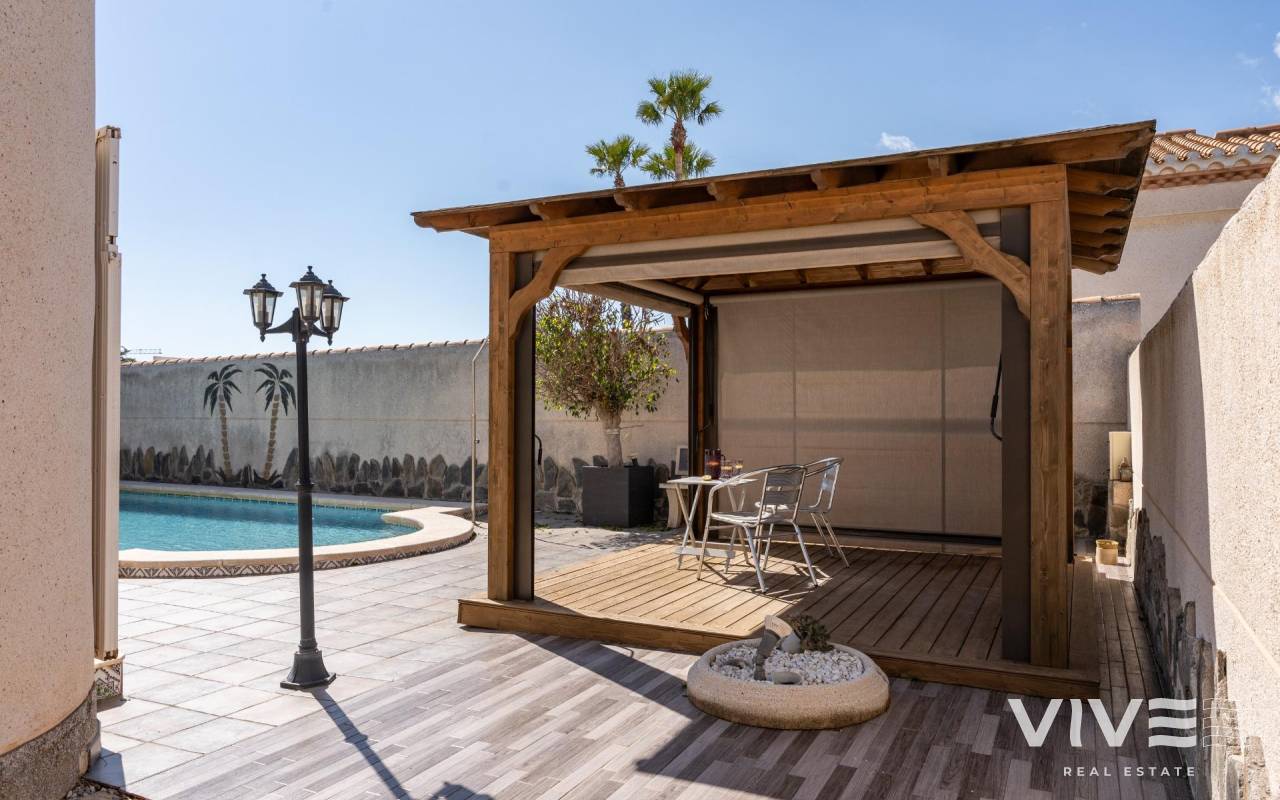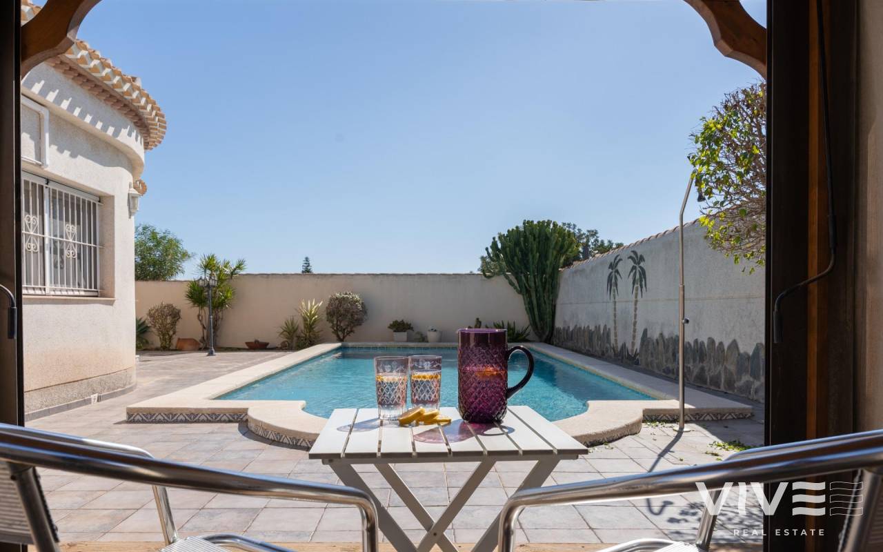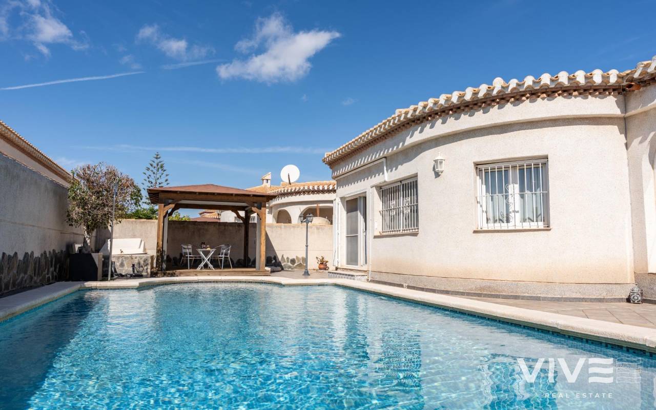 This detached villa, in perfect condition and superbly located in the heart of Playa Flamenca, is truly within walking distance of everything: supermarkets, municipal sports facilities, private sports centers, Zenia Boulevard shopping centre, public school, Town Hall, shops, medical services, and the beaches of Orihuela Costa.. . The Saturday market is located on the same street as the property, offering direct access so you can enjoy shopping for fresh fruit, vegetables, and traditional products, as well as the atmosphere of living in a small Spanish town.. . The plot size of this property is 525 m2, offering many possibilities to enjoy the outdoor space, including a pool area, barbecue, solarium, pergolas, and parking. It is also very easy to maintain, with terraces, artificial grass, and gravel areas designed to keep the garden and outdoor areas in perfect condition without requiring excessive work. There is also an exterior access storage room next to the barbecue and terrace area, allowing convenient use without needing to enter the house when enjoying the pool area.. . Parking is available within the plot itself, with automatic vehicle access gates and a private garage-storage area to keep your vehicle protected from the Alicante sun. The pool area is perfect for sunbathing in privacy, while the built-in barbecue and wooden pergola allow you to fully enjoy the potential of the plot thanks to its south-facing orientation, providing sunshine almost all day and natural light throughout the main living areas of the property.. . At the entrance of the house there is a glazed solarium terrace with a traditional Spanish tiled roof. In winter, when the sun is lower, it is perfect for enjoying the sun, while in summer, by opening the glass windows and benefiting from the shade of the roof, it becomes a cool and ventilated space ideal for reading or spending time with family in a covered semi-outdoor area.. . From this covered terrace with arches, there is access both to the garage area and to the house itself, making it especially convenient to bring shopping directly from the car into the home.. . Through the entrance hall you reach the living room, which features an electric fireplace and south-facing windows that provide excellent natural light and sunshine. From here you access the independent kitchen-dining area, separated by doors so you can cook without smells or smoke spreading to the rest of the house.. . The kitchen has patio doors leading directly to the pool and terrace area, making outdoor living very convenient. It is equipped with kitchen units and appliances.. . The house has three spacious bedrooms with built-in wardrobes, one bathroom with a walk-in shower, and another full en-suite bathroom in the master bedroom featuring a walk-in shower and a jacuzzi.. . In summary, this is a detached villa located in a central and very well-connected area, with excellent outdoor spaces for leisure and family enjoyment. The property is in perfect condition and ready to move into. A viewing is highly recommended to fully appreciate its excellent features.. . Price: €585,000. Taxes and purchase expenses not included (according to applicable regulations). A full breakdown of additional costs will be provided prior to reservation.. . In the case of a transaction with dual agency, the professional fees payable by the buyer will be 1.5% of the final purchase price, with a minimum of €3,000, plus VAT (21%), unless otherwise expressly agreed. These fees are not included in the advertised price.