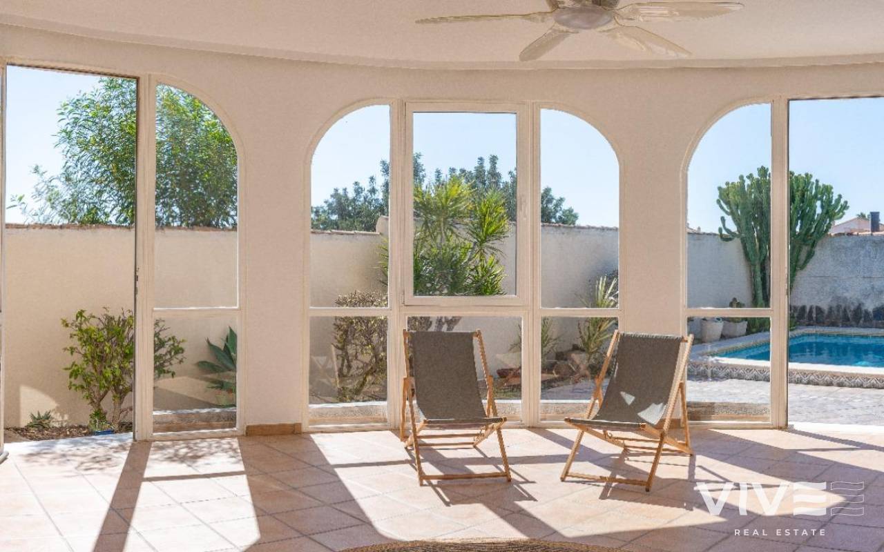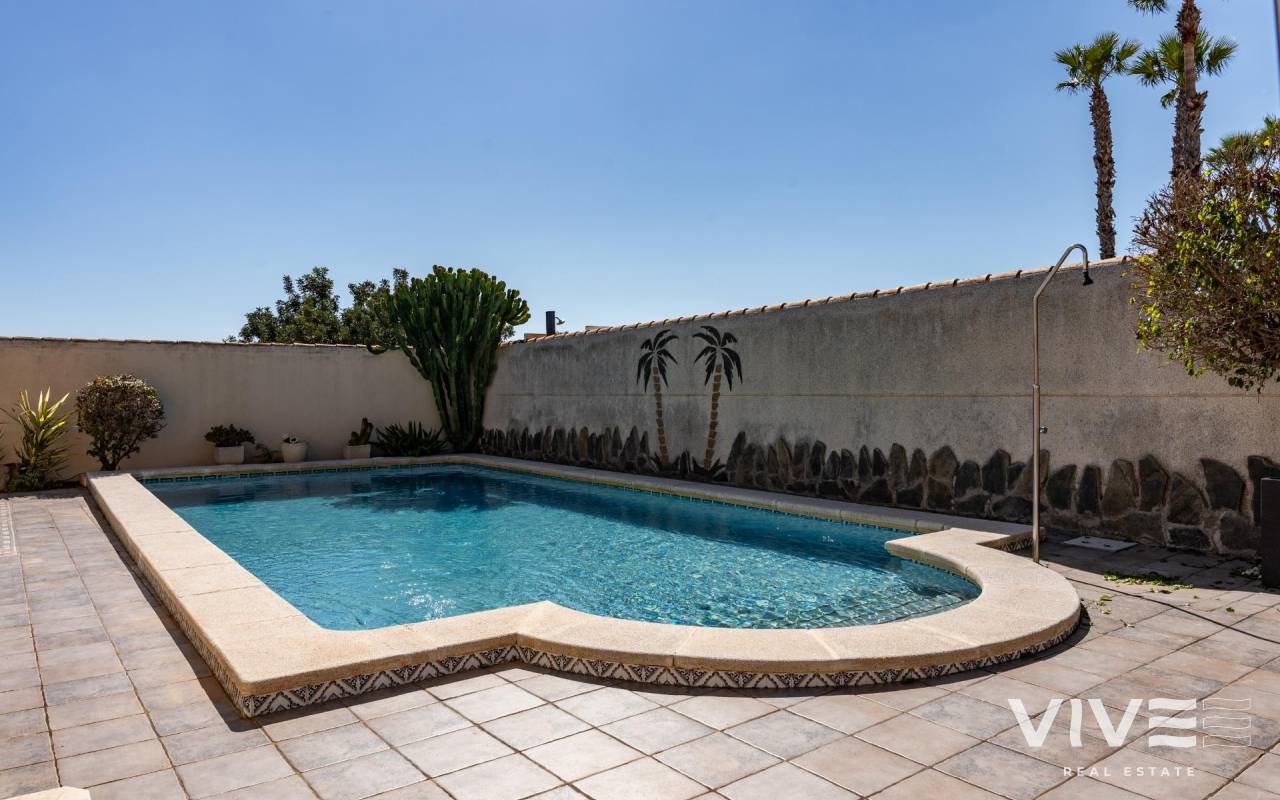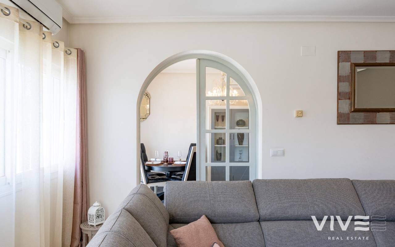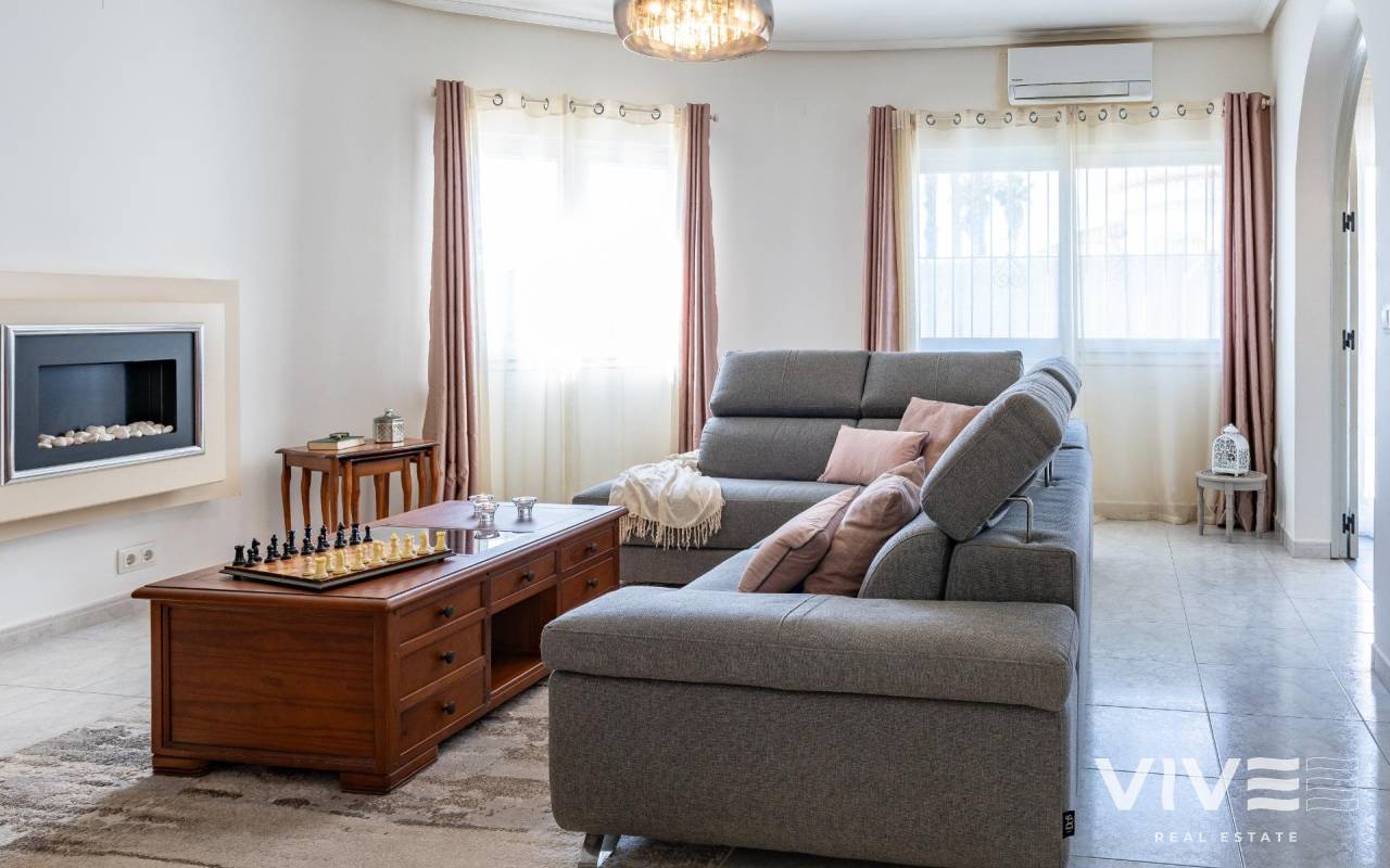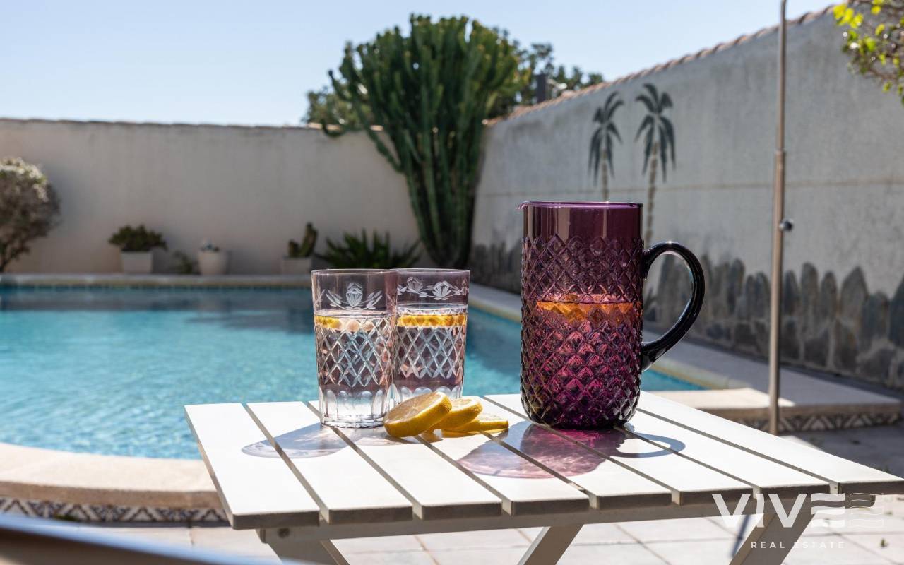This detached villa, in perfect condition and superbly located in the heart of Playa Flamenca, is truly within walking distance of everything: supermarkets, municipal sports facilities, private sports centers, Zenia Boulevard shopping centre, public school, Town Hall, shops, medical services, and the beaches of Orihuela Costa.. . The Saturday market is located on the same street as the property, offering direct access so you can enjoy shopping for fresh fruit, vegetables, and traditional products, as well as the atmosphere of living in a small Spanish town.. . The plot size of this property is 525 m2, offering many possibilities to enjoy the outdoor space, including a pool area, barbecue, solarium, pergolas, and parking. It is also very easy to maintain, with terraces, artificial grass, and gravel areas designed to keep the garden and outdoor areas in perfect condition without requiring excessive work. There is also an exterior access storage room next to the barbecue and terrace area, allowing convenient use without needing to enter the house when enjoying the pool area.. . Parking is available within the plot itself, with automatic vehicle access gates and a private garage-storage area to keep your vehicle protected from the Alicante sun. The pool area is perfect for sunbathing in privacy, while the built-in barbecue and wooden pergola allow you to fully enjoy the potential of the plot thanks to its south-facing orientation, providing sunshine almost all day and natural light throughout the main living areas of the property.. . At the entrance of the house there is a glazed solarium terrace with a traditional Spanish tiled roof. In winter, when the sun is lower, it is perfect for enjoying the sun, while in summer, by opening the glass windows and benefiting from the shade of the roof, it becomes a cool and ventilated space ideal for reading or spending time with family in a covered semi-outdoor area.. . From this covered terrace with arches, there is access both to the garage area and to the house itself, making it especially convenient to bring shopping directly from the car into the home.. . Through the entrance hall you reach the living room, which features an electric fireplace and south-facing windows that provide excellent natural light and sunshine. From here you access the independent kitchen-dining area, separated by doors so you can cook without smells or smoke spreading to the rest of the house.. . The kitchen has patio doors leading directly to the pool and terrace area, making outdoor living very convenient. It is equipped with kitchen units and appliances.. . The house has three spacious bedrooms with built-in wardrobes, one bathroom with a walk-in shower, and another full en-suite bathroom in the master bedroom featuring a walk-in shower and a jacuzzi.. . In summary, this is a detached villa located in a central and very well-connected area, with excellent outdoor spaces for leisure and family enjoyment. The property is in perfect condition and ready to move into. A viewing is highly recommended to fully appreciate its excellent features.. . Price: €585,000. Taxes and purchase expenses not included (according to applicable regulations). A full breakdown of additional costs will be provided prior to reservation.. . In the case of a transaction with dual agency, the professional fees payable by the buyer will be 1.5% of the final purchase price, with a minimum of €3,000, plus VAT (21%), unless otherwise expressly agreed. These fees are not included in the advertised price.