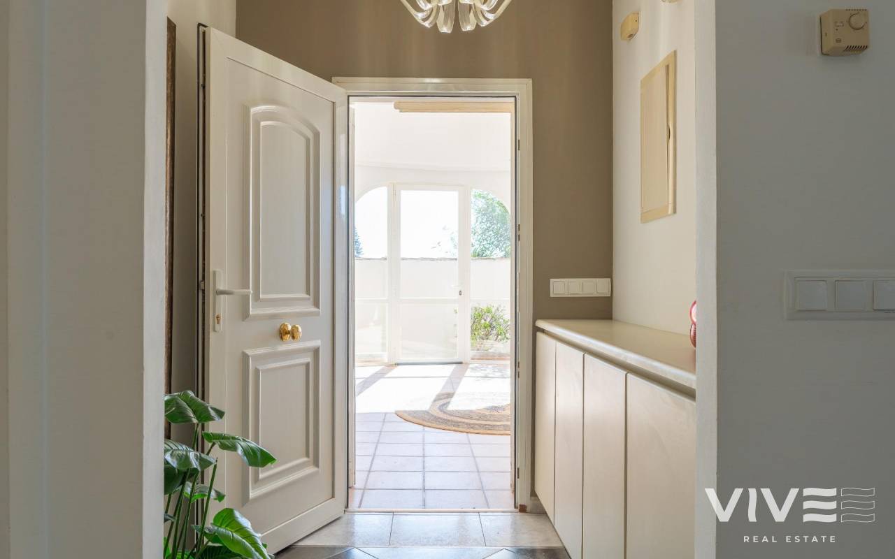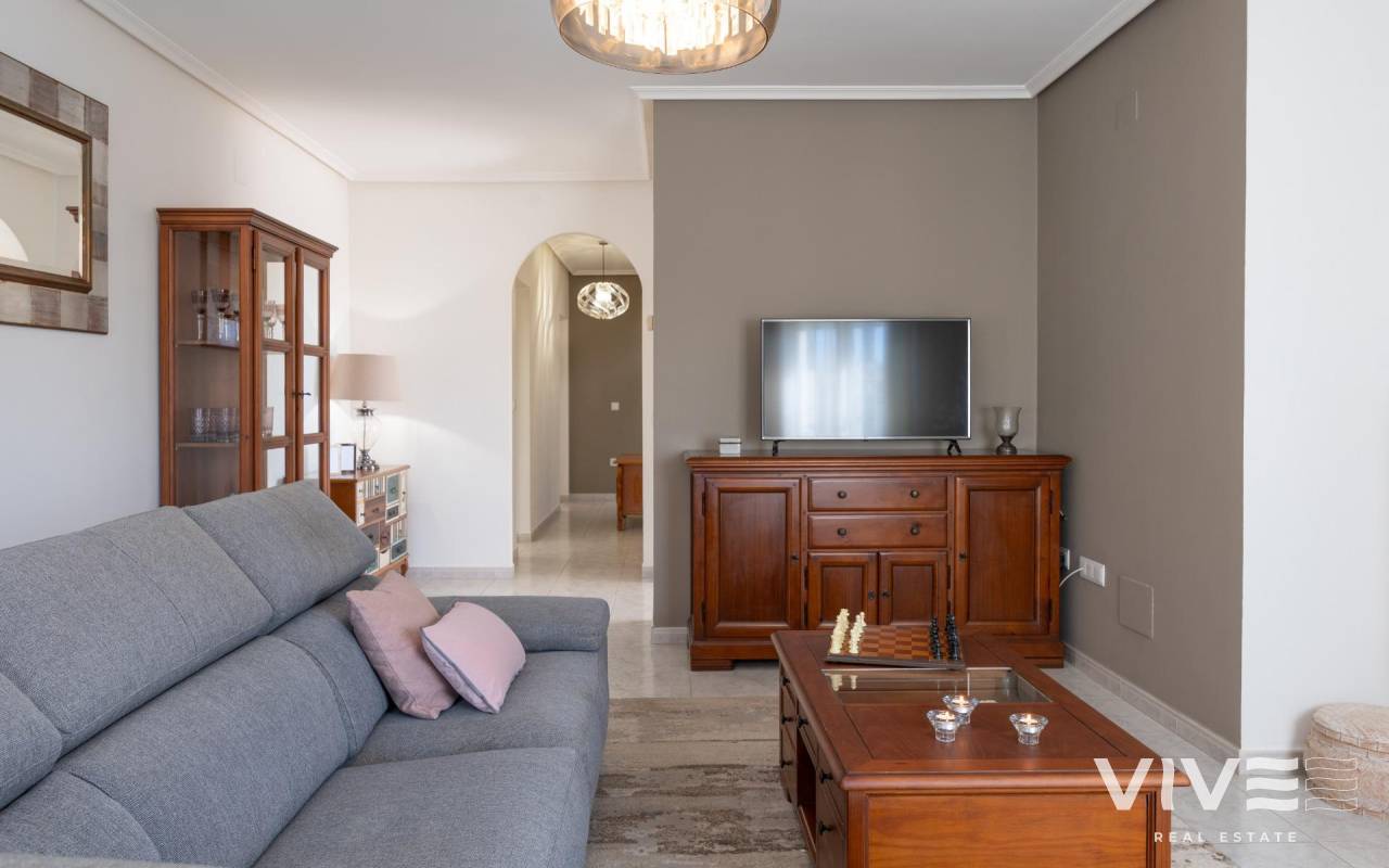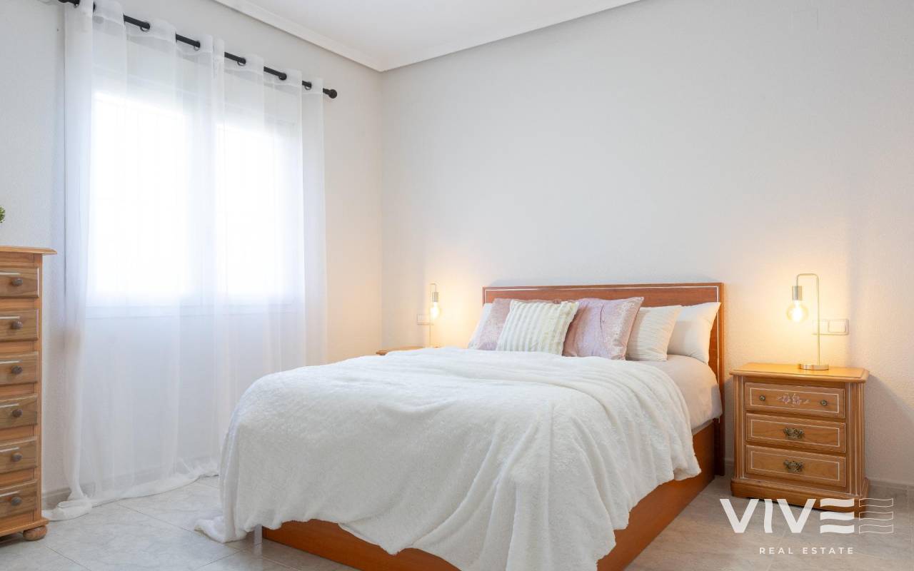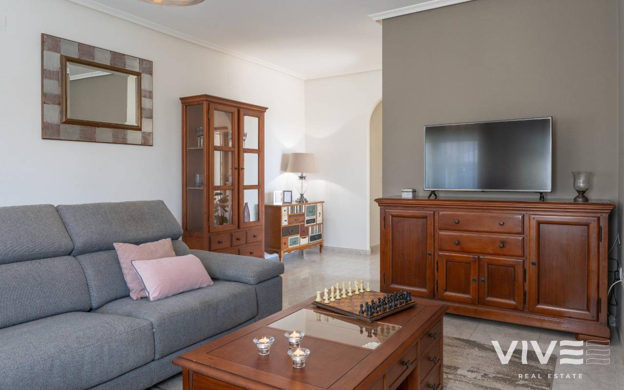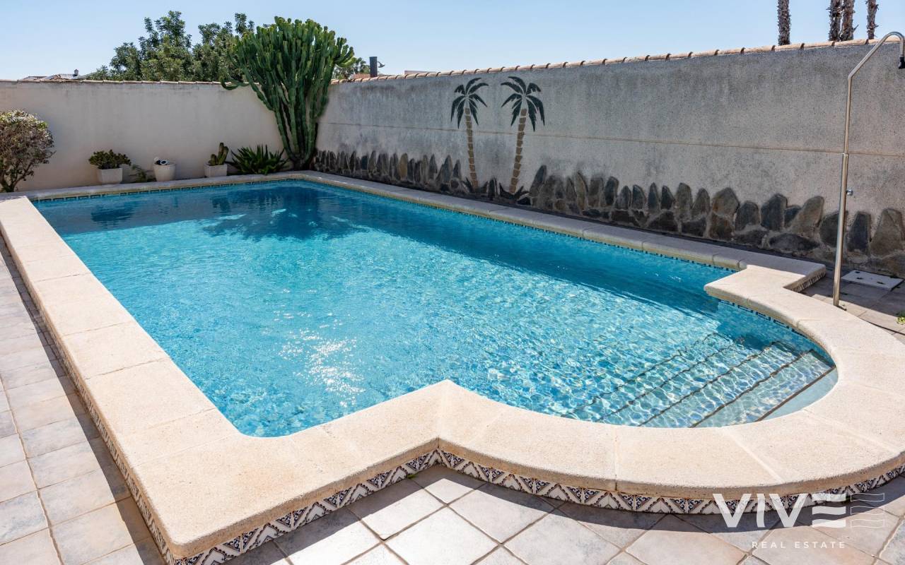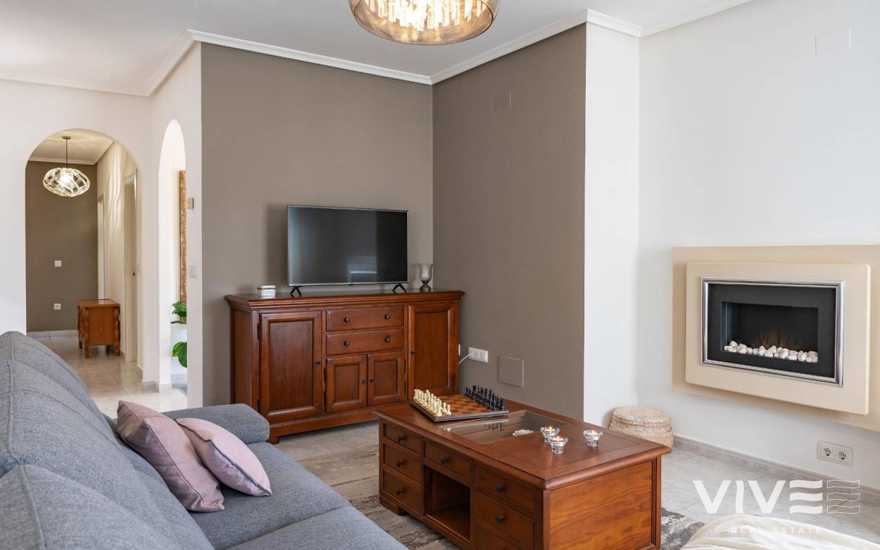 This detached villa, in perfect condition and superbly located in the heart of Playa Flamenca, is truly within walking distance of everything: supermarkets, municipal sports facilities, private sports centers, Zenia Boulevard shopping centre, public school, Town Hall, shops, medical services, and the beaches of Orihuela Costa.. . The Saturday market is located on the same street as the property, offering direct access so you can enjoy shopping for fresh fruit, vegetables, and traditional products, as well as the atmosphere of living in a small Spanish town.. . The plot size of this property is 525 m2, offering many possibilities to enjoy the outdoor space, including a pool area, barbecue, solarium, pergolas, and parking. It is also very easy to maintain, with terraces, artificial grass, and gravel areas designed to keep the garden and outdoor areas in perfect condition without requiring excessive work. There is also an exterior access storage room next to the barbecue and terrace area, allowing convenient use without needing to enter the house when enjoying the pool area.. . Parking is available within the plot itself, with automatic vehicle access gates and a private garage-storage area to keep your vehicle protected from the Alicante sun. The pool area is perfect for sunbathing in privacy, while the built-in barbecue and wooden pergola allow you to fully enjoy the potential of the plot thanks to its south-facing orientation, providing sunshine almost all day and natural light throughout the main living areas of the property.. . At the entrance of the house there is a glazed solarium terrace with a traditional Spanish tiled roof. In winter, when the sun is lower, it is perfect for enjoying the sun, while in summer, by opening the glass windows and benefiting from the shade of the roof, it becomes a cool and ventilated space ideal for reading or spending time with family in a covered semi-outdoor area.. . From this covered terrace with arches, there is access both to the garage area and to the house itself, making it especially convenient to bring shopping directly from the car into the home.. . Through the entrance hall you reach the living room, which features an electric fireplace and south-facing windows that provide excellent natural light and sunshine. From here you access the independent kitchen-dining area, separated by doors so you can cook without smells or smoke spreading to the rest of the house.. . The kitchen has patio doors leading directly to the pool and terrace area, making outdoor living very convenient. It is equipped with kitchen units and appliances.. . The house has three spacious bedrooms with built-in wardrobes, one bathroom with a walk-in shower, and another full en-suite bathroom in the master bedroom featuring a walk-in shower and a jacuzzi.. . In summary, this is a detached villa located in a central and very well-connected area, with excellent outdoor spaces for leisure and family enjoyment. The property is in perfect condition and ready to move into. A viewing is highly recommended to fully appreciate its excellent features.. . Price: €585,000. Taxes and purchase expenses not included (according to applicable regulations). A full breakdown of additional costs will be provided prior to reservation.. . In the case of a transaction with dual agency, the professional fees payable by the buyer will be 1.5% of the final purchase price, with a minimum of €3,000, plus VAT (21%), unless otherwise expressly agreed. These fees are not included in the advertised price.