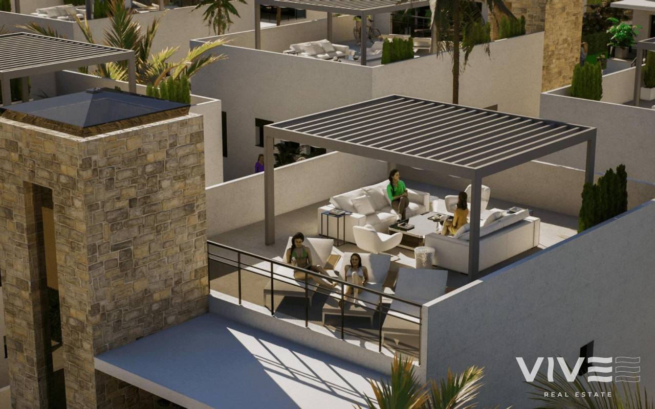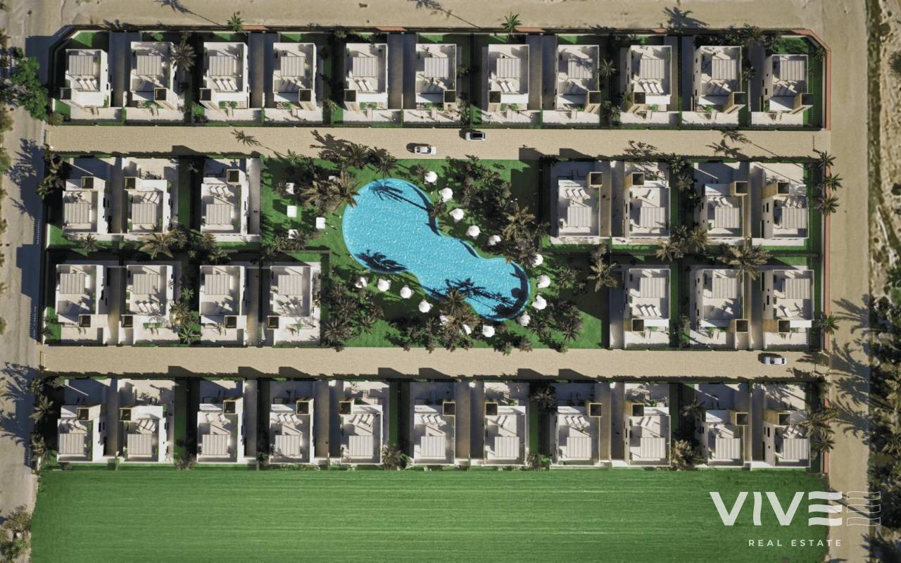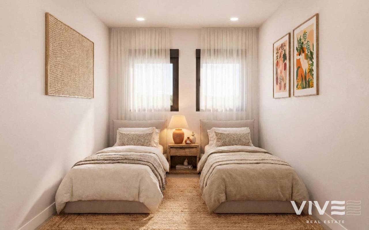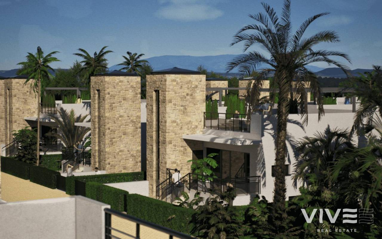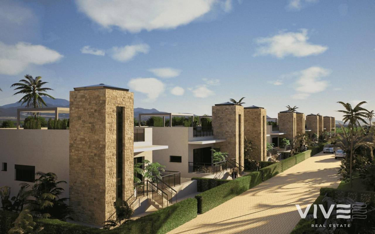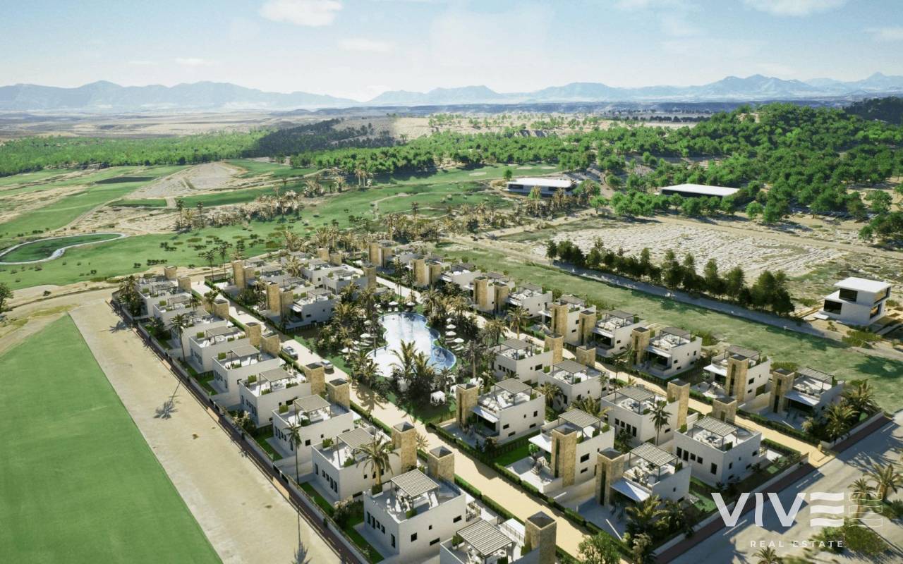 New Build Villas in Camposol Golf (Mazarron-Murcia) with Private Solarium and Basement Exclusive Residential Villas at Camposol Golf Discover this private residential complex of 69 independent villas located in a plot frontline to Camposol Golf in Mazarron, Murcia. Designed around a large central green oasis with a communal swimming pool and landscaped gardens, this development offers a peaceful and secure environment ideal for enjoying the Mediterranean lifestyle. The location combines tranquility with convenience, as the nearby village of El Saladillo provides daily services, shops and local amenities within a short distance. The beautiful beaches of Puerto de Mazarron are just 14 km away, making this an excellent option for both permanent living and holiday homes. Modern Single Level Villas with Flexible Layouts The development offers a selection of modern villas built on one level, available in two or three bedroom configurations. All homes include two bathrooms, one of them en suite, designed with functionality and comfort in mind. Each villa is set on a private plot starting from 300 m2, providing outdoor space for relaxation and entertainment. The properties also feature a private solarium, offering additional outdoor living space with open views of the surrounding golf course and landscape. Basement and Customization Potential A key feature of these villas is the inclusion of a spacious basement, allowing owners to customize the space according to their needs. This area can be adapted into a gym, storage room, home cinema or additional living space, offering great flexibility and added value. The villas are designed with interior stairs connecting all levels, ensuring easy access between the basement, main living area and rooftop solarium. Quality Features and Comfortable Living These new build homes are delivered with high quality finishes and modern features. The kitchens come fully furnished and equipped with appliances, while the bathrooms are completed with shower screens and fittings. Additional features include pre installation for air conditioning, built in wardrobes, electric shutters and a full LED lighting package, ensuring comfort and convenience from day one. Prime Location in Mazarron Near Golf and Coast Camposol is a well established residential area known for its golf course, relaxed atmosphere and international community. Mazarron offers a wide range of services, restaurants and leisure options, while the nearby coast is famous for its sandy beaches and crystal clear waters. Key distances include Camposol Golf on your doorstep, El Saladillo village 2 km, Puerto de Mazarron beaches 14 km, Mazarron town center 10 km, Murcia Corvera Airport 35 km and Cartagena city 40 km. Ideal Investment and Lifestyle Opportunity in Murcia This development offers an excellent opportunity to own a modern villa in a golf front location with great potential for customization and strong rental appeal. Contact us today to receive more information or to arrange a viewing and secure your new villa in Camposol-Mazarron.