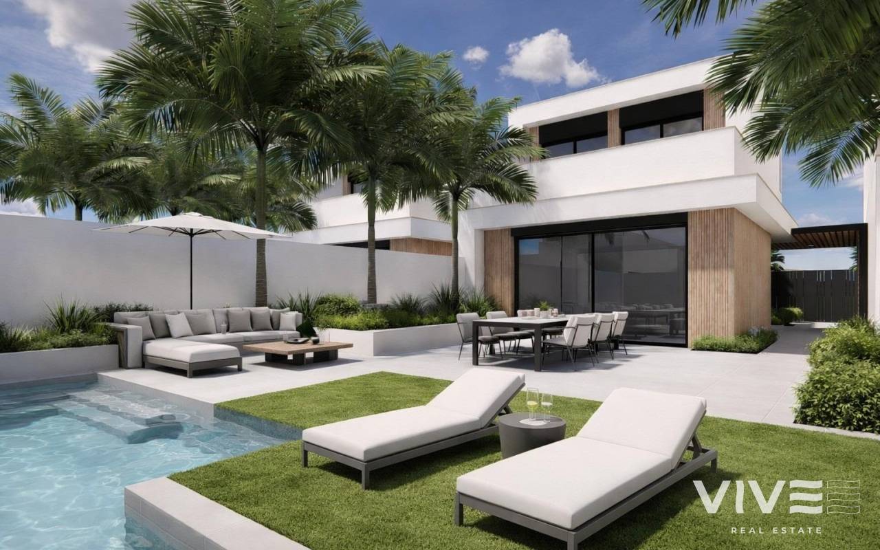New Build Villas with Private Pool Near La Serena Golf in Los Alcazares Exclusive Boutique Development Near Golf and Beach Discover this exclusive residential development of only eight independent new build villas ideally located between La Serena Golf and the charming coastal town of Los Alcazares. Situated just 1500 meters from the Mar Menor beaches, these homes offer the perfect combination of golf, sea and Mediterranean lifestyle. The location allows residents to enjoy walking distance access to both the golf course and the town center, where a wide range of restaurants, shops, cafes and essential services can be found. Los Alcazares is known for its relaxed atmosphere, long promenade and shallow warm waters, making it a popular destination for both holidaymakers and permanent residents. Modern Villas with Flexible Layouts These contemporary villas are available in two or three bedroom configurations, with options for single level or two level designs. Built on private plots starting from 200 m2, each home is designed to maximize space, comfort and natural light. All villas feature a private swimming pool and on plot parking, creating a private and functional outdoor environment ideal for enjoying the sunny climate all year round. Single level villas include a private rooftop solarium, perfect for sunbathing or relaxing with open views. Two level villas offer spacious terraces on the upper floor, providing additional outdoor living areas. Open Plan Living and Outdoor Connection The interior layout focuses on open plan living, with bright living and dining areas seamlessly connected to modern kitchens. Large windows allow natural light to fill the spaces while offering direct access to terraces and pool areas. This design enhances the indoor outdoor lifestyle that defines living on the Costa Calida, making these villas ideal for both everyday living and entertaining guests. High Quality Finishes and Modern Features The villas are built to high standards using quality materials and trusted brands. Features include a reinforced security entrance door by DIERRE, fully fitted wardrobes and modern kitchens equipped with BOSCH appliances. Additional specifications include aerothermal system for hot water, motorized shutters and an automated vehicle access gate. Every detail has been carefully considered to provide comfort, efficiency and convenience. Prime Location on the Costa Calida Los Alcazares offers an excellent location with easy access to beaches, golf courses and transport connections. The Mar Menor beaches are just 1.5 km away, while La Serena Golf is within walking distance. Other key distances include Murcia Corvera Airport 35 km, Cartagena 25 km, Murcia city 50 km and Alicante Airport 90 km. Ideal Investment or Holiday Home Opportunity These new build villas offer a rare opportunity to own a modern property in a prime location close to both the sea and golf. Contact us today for more information or to arrange a viewing and secure your new villa in Los Alcazares.