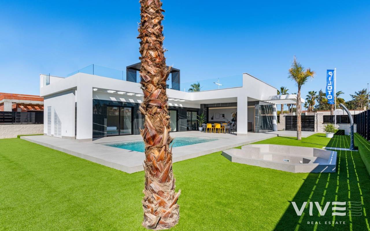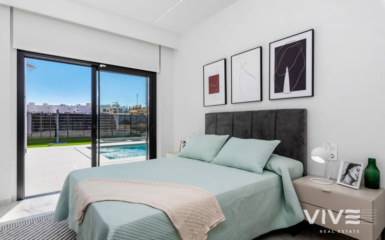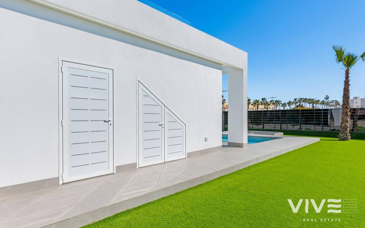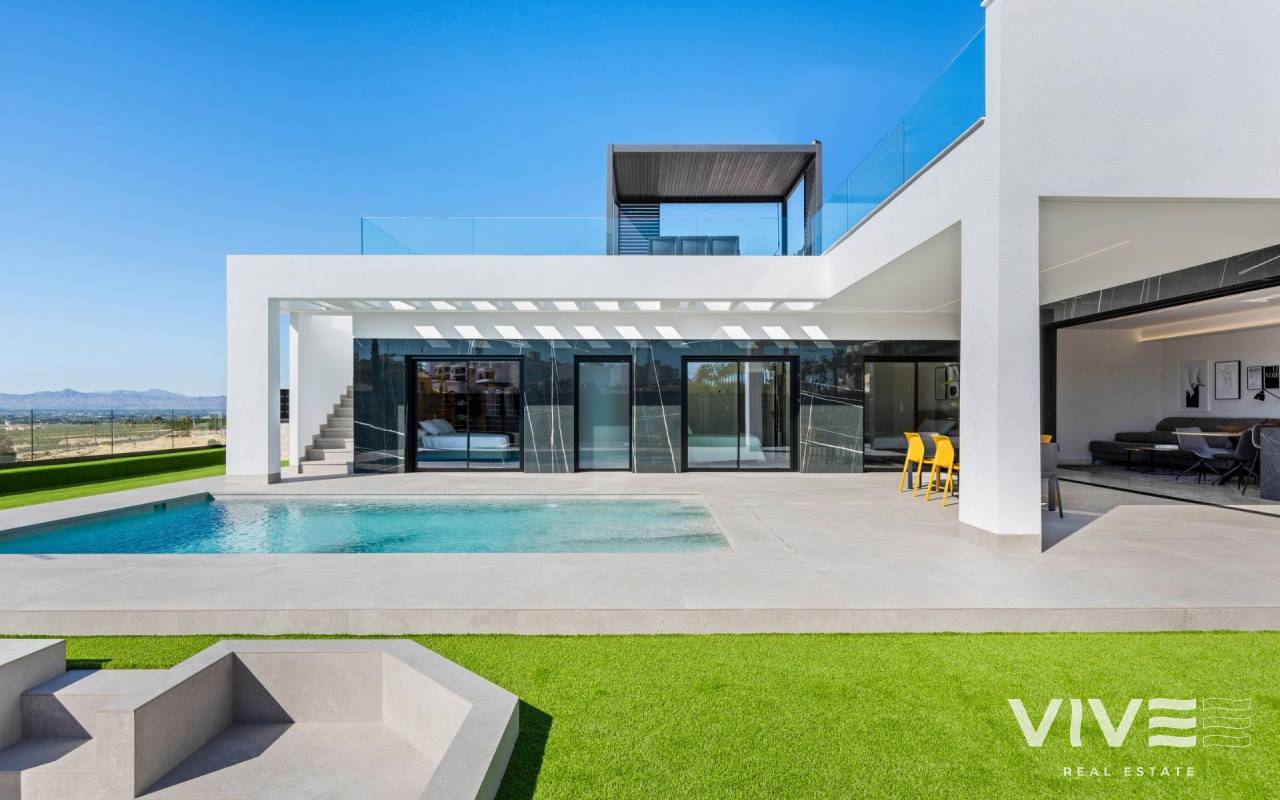New Build Luxury Villas in La Finca Golf, Algorfa Exclusive One floor Villas next to the Golf La Finca in Costa Blanca South Discover this exclusive new build residential project of 11 independent villas located within the prestigious La Finca Golf Resort in Algorfa, one of the most sought after areas of the Vega Baja, Costa Blanca South. Surrounded by green landscapes, citrus groves and rolling fairways, this location offers tranquillity, privacy and a high quality Mediterranean lifestyle, while remaining close to all essential services and coastal attractions. Modern Single Level Villas with Private Pool and Solarium Each villa is thoughtfully designed on one level, offering comfort and functionality throughout. The properties feature 3 spacious bedrooms and 2 modern bathrooms, an open plan American style kitchen, and a bright living and dining area with large windows that open directly onto the terrace and private garden. Outdoors, each villa enjoys a private swimming pool, parking space within the plot, and an impressive 150 sqm private solarium, ideal for enjoying the sun all year round. For buyers seeking additional space, there is the option to add a basement or a fourth bedroom on an upper level at an extra cost, allowing you to tailor the home to your personal needs. High Quality Specifications and Elegant Finishes These villas are built with premium materials and finishes to ensure comfort, efficiency and modern style. Features include a reinforced security entrance door, motorized shutters, fully furnished kitchens equipped with appliances, and bathrooms complete with furniture, mirrors and shower screens. The rooftop solarium is delivered with a summer kitchen and pergola, creating the perfect setting for outdoor dining and relaxation. An interior and exterior LED lighting package is also included, enhancing both design and ambience. Prime Location in La Finca Golf Resort La Finca Golf Resort is renowned for its championship golf course, luxury hotel, spa facilities, restaurants and sports areas, all set within a secure and well maintained environment. Algorfa is a charming Spanish village offering a relaxed atmosphere, local shops and traditional restaurants, while nearby towns provide a wider range of services. Key Distances La Finca Golf Club: on site Guardamar del Segura beaches: 15 km Torrevieja and Orihuela Costa shopping centres: 15 km Almoradi, Benijofar and Ciudad Quesada: 5 to 10 km Alicante International Airport: 35 km Mediterranean Lifestyle and Smart Investment With over 300 days of sunshine per year, excellent road connections and proximity to beaches, golf courses and commercial areas, these villas are ideal as a permanent residence, holiday home or investment opportunity on the Costa Blanca. Secure Your New Villa in La Finca Golf Today Do not miss the opportunity to own a modern villa in one of the most exclusive golf resorts in Algorfa. Contact us today for more information or to arrange a private viewing.