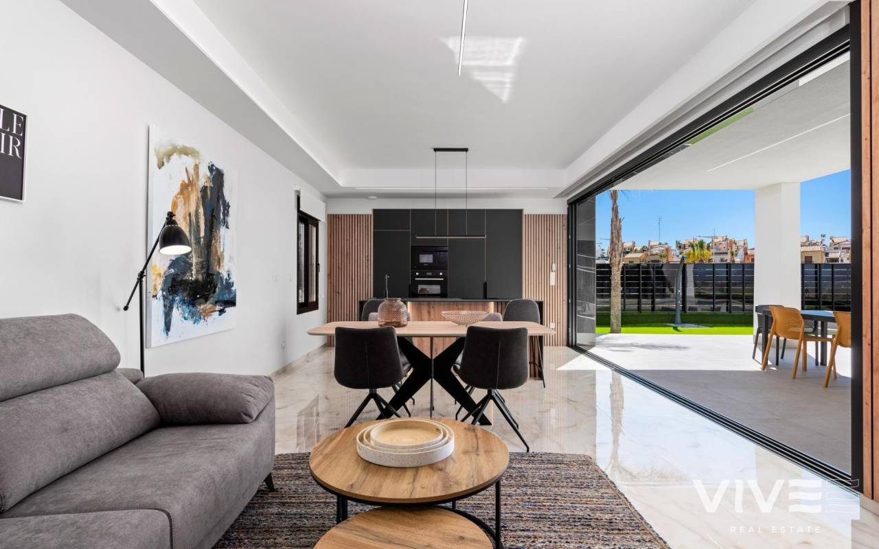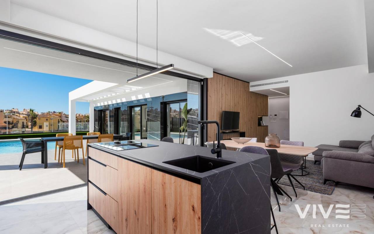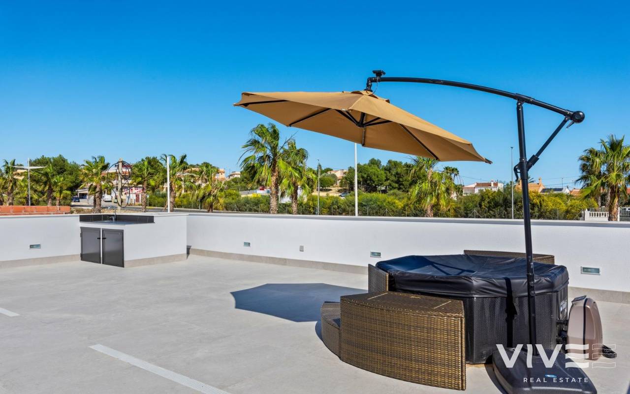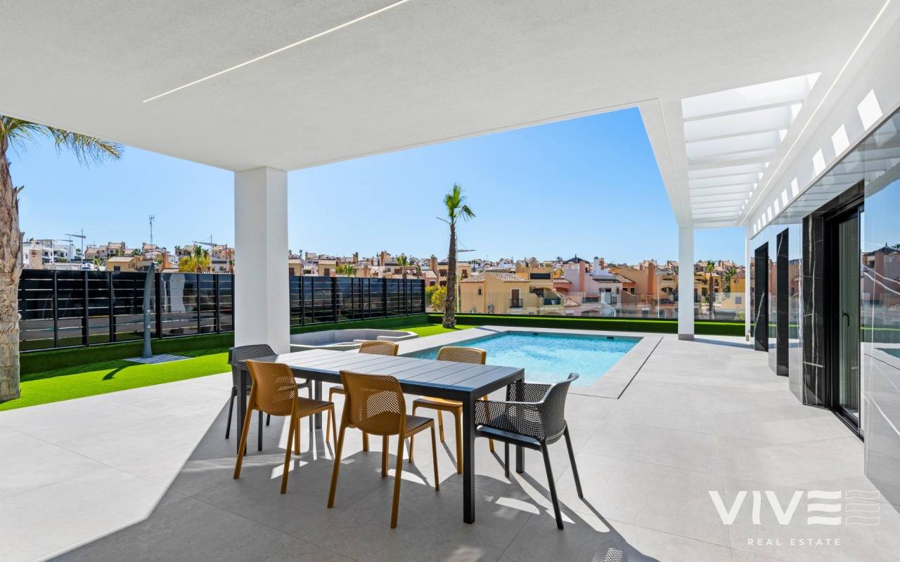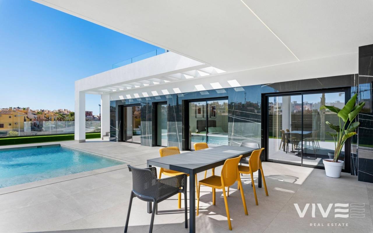 New Build Luxury Villas in La Finca Golf, Algorfa Exclusive One floor Villas next to the Golf La Finca in Costa Blanca South Discover this exclusive new build residential project of 11 independent villas located within the prestigious La Finca Golf Resort in Algorfa, one of the most sought after areas of the Vega Baja, Costa Blanca South. Surrounded by green landscapes, citrus groves and rolling fairways, this location offers tranquillity, privacy and a high quality Mediterranean lifestyle, while remaining close to all essential services and coastal attractions. Modern Single Level Villas with Private Pool and Solarium Each villa is thoughtfully designed on one level, offering comfort and functionality throughout. The properties feature 3 spacious bedrooms and 2 modern bathrooms, an open plan American style kitchen, and a bright living and dining area with large windows that open directly onto the terrace and private garden. Outdoors, each villa enjoys a private swimming pool, parking space within the plot, and an impressive 150 sqm private solarium, ideal for enjoying the sun all year round. For buyers seeking additional space, there is the option to add a basement or a fourth bedroom on an upper level at an extra cost, allowing you to tailor the home to your personal needs. High Quality Specifications and Elegant Finishes These villas are built with premium materials and finishes to ensure comfort, efficiency and modern style. Features include a reinforced security entrance door, motorized shutters, fully furnished kitchens equipped with appliances, and bathrooms complete with furniture, mirrors and shower screens. The rooftop solarium is delivered with a summer kitchen and pergola, creating the perfect setting for outdoor dining and relaxation. An interior and exterior LED lighting package is also included, enhancing both design and ambience. Prime Location in La Finca Golf Resort La Finca Golf Resort is renowned for its championship golf course, luxury hotel, spa facilities, restaurants and sports areas, all set within a secure and well maintained environment. Algorfa is a charming Spanish village offering a relaxed atmosphere, local shops and traditional restaurants, while nearby towns provide a wider range of services. Key Distances La Finca Golf Club: on site Guardamar del Segura beaches: 15 km Torrevieja and Orihuela Costa shopping centres: 15 km Almoradi, Benijofar and Ciudad Quesada: 5 to 10 km Alicante International Airport: 35 km Mediterranean Lifestyle and Smart Investment With over 300 days of sunshine per year, excellent road connections and proximity to beaches, golf courses and commercial areas, these villas are ideal as a permanent residence, holiday home or investment opportunity on the Costa Blanca. Secure Your New Villa in La Finca Golf Today Do not miss the opportunity to own a modern villa in one of the most exclusive golf resorts in Algorfa. Contact us today for more information or to arrange a private viewing.