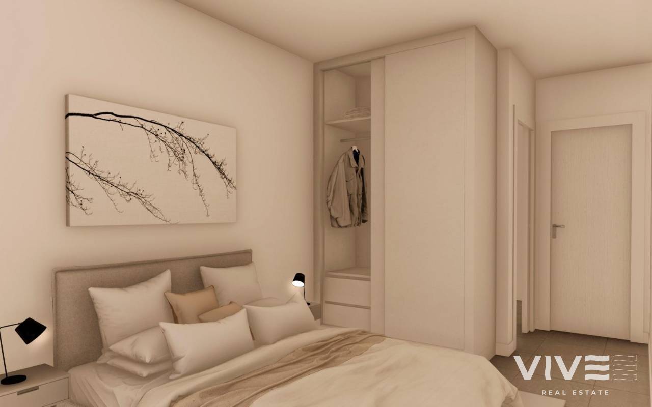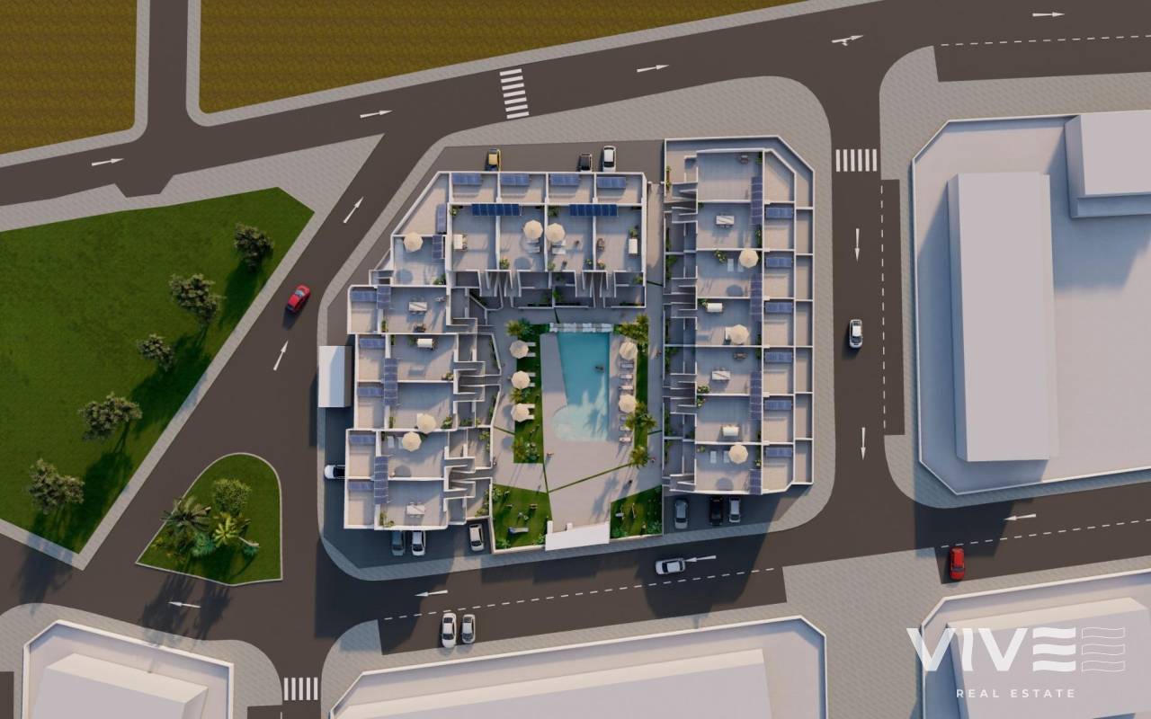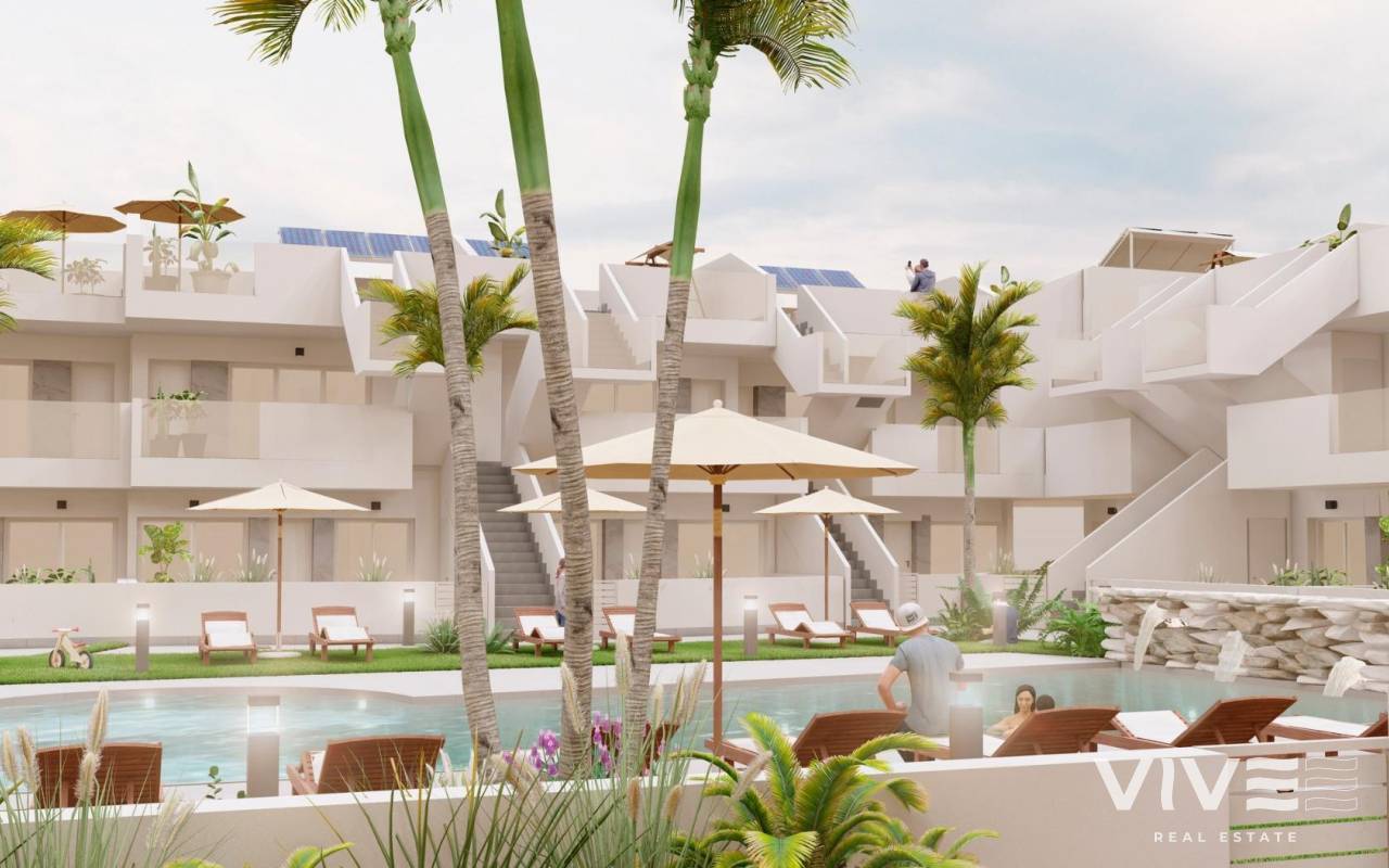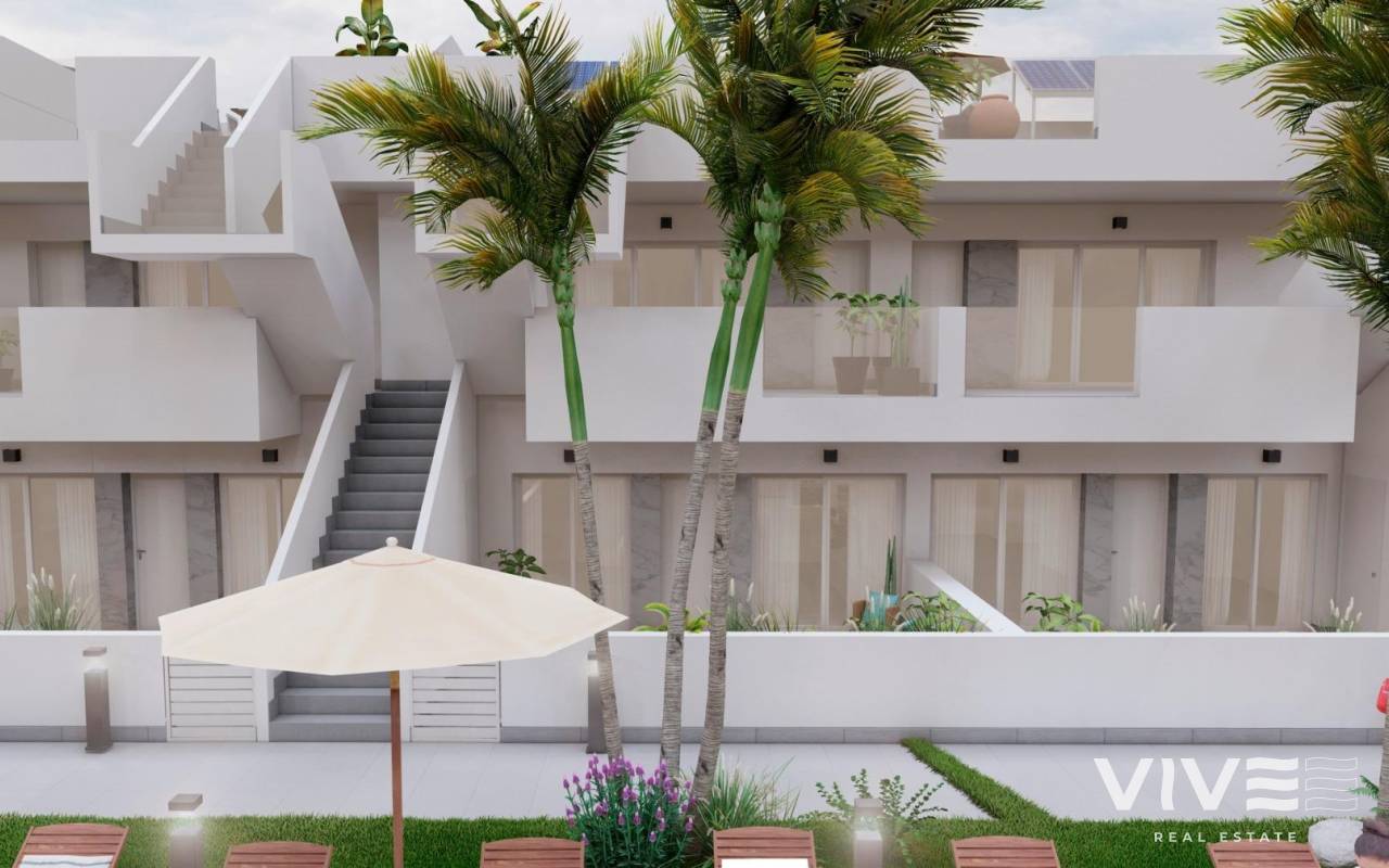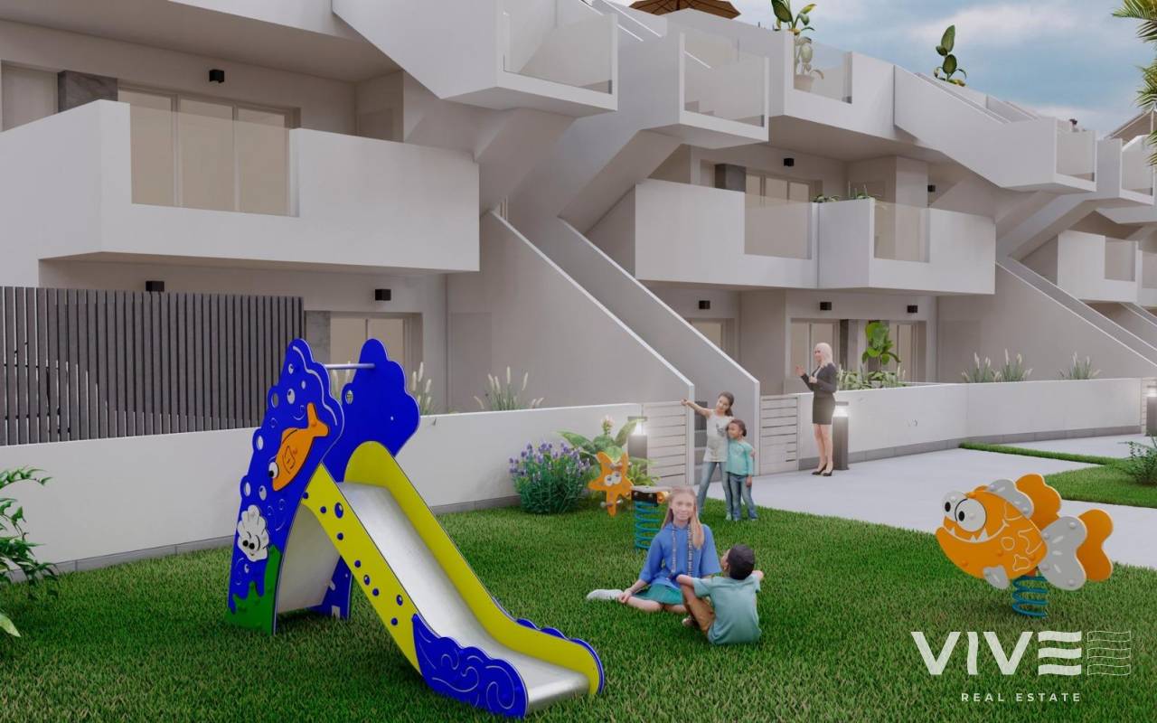 NEW BUILD BUNGALOWS IN ROLDAN New Build gated residential complex of bungalow apartments located in Roldán, Murcia. These exclusive bungalows are designed with 3 bedrooms and 2 bathrooms, terrace on the ground floor and with 2 bedrooms and 2 bathrooms and solarium for the upper floor. The interiors, elegant and functional, have high quality floors, fully fitted kitchens in white combined with imitation wood, including electrical appliances. The bathrooms have a vanity unit with washbasin and light. The bedrooms include lined wardrobes with drawers and sliding doors and each property has pre-installation for ducted air conditioning. The exteriors are not less impressive, including a communal swimming pool and a beautiful sport area and childrens playground on artificial grass to enjoy. Each property has parking space. Storerooms are optional at an extra cost. Roldan itself is a traditional town with all the local amenities you will need including Supermarkets, Restaurants, Bars, Health Clinic, Pharmacy, Police Station, Petrol Station, Mechanics, Dentists, Doctors and more. The nearby golf resorts of La Torre, & Terrazas are easily accessible, Corvera Airport is 15 minutes away & the beaches of the Mar Menor just 20 minutes drive.