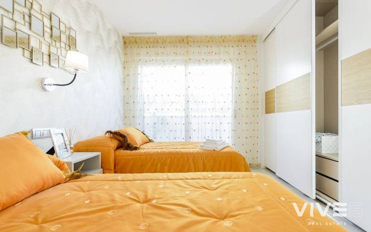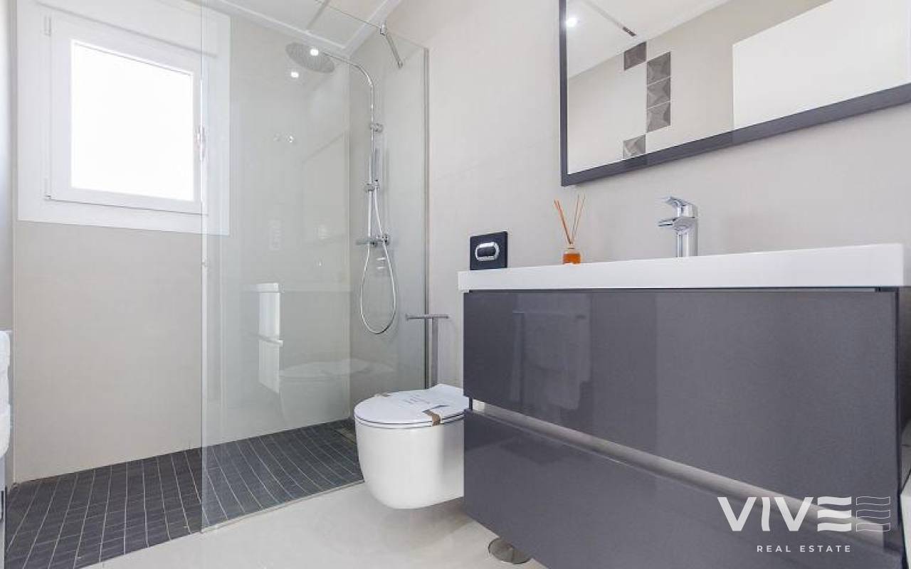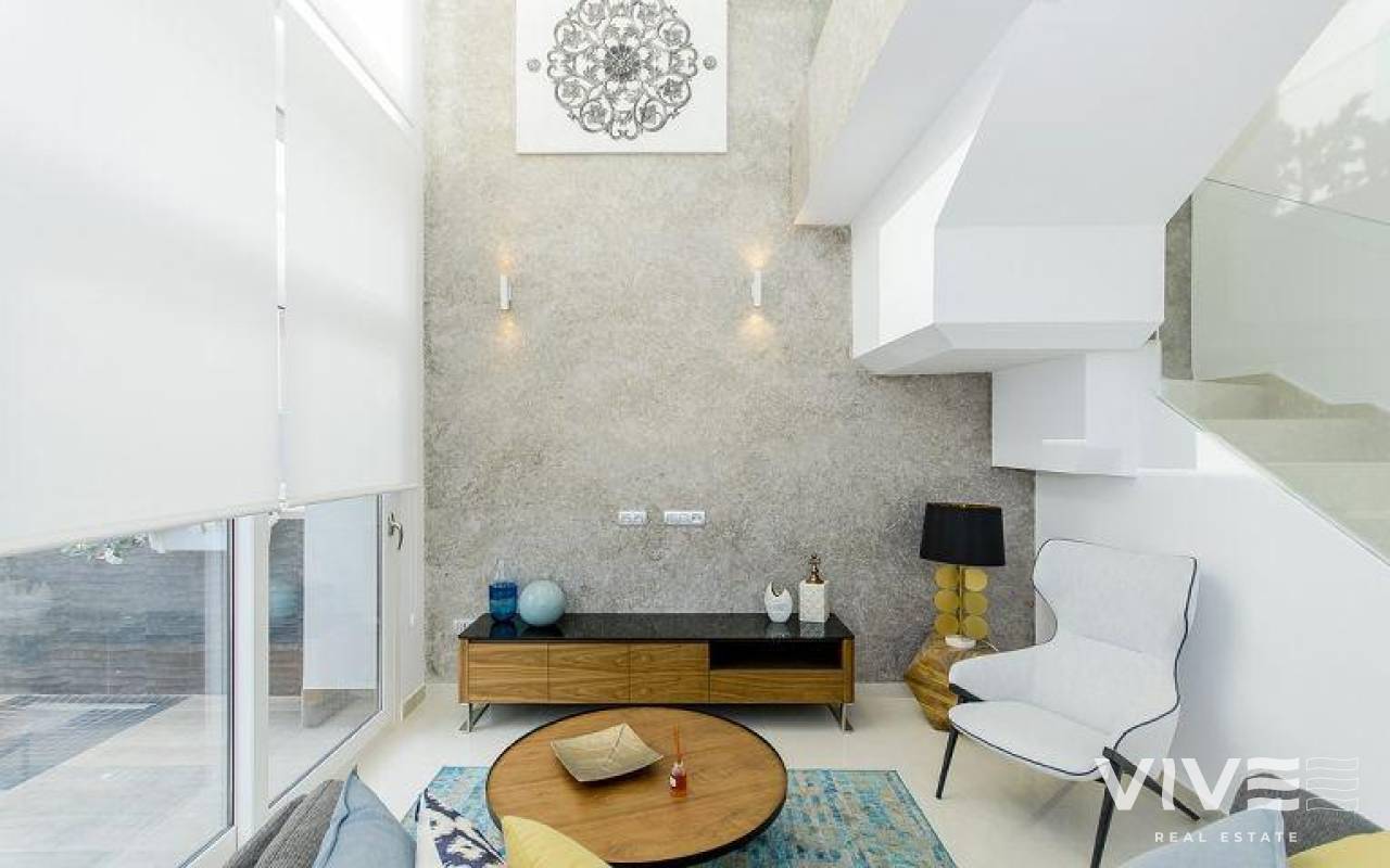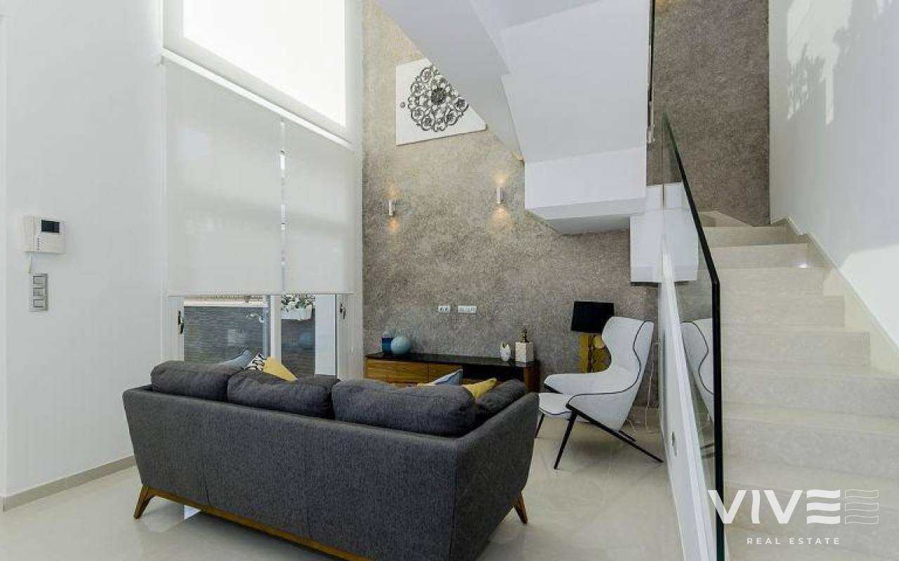 DESIGN VILLA WITH ALL THE LUXURIES Detached villa with 3 bedrooms, 3 bathrooms, with a SOUTH orientation. It has a 12 m2 porch / pergola on the ground floor and a 45 m2 solarium on the roof. It has a terrace, private garden and access door to the car. It is designed with high quality materials using the most careful technology and providing the greatest comfort 6.5x3.3 swimming pool with colored lights, designer tile, brick staircase, 1.20 waterfall and bench to sit under the waterfall. This residence is located in one of the most beautiful and quiet areas between Ciudad Quesada and Pueblo Bravo, near the Natural Park of Las Lagunas de La Mata and Torrevieja and very close to the beaches of Guardamar and the La Marquesa golf course.