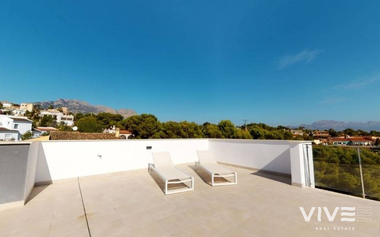 NEW BUILD VILLAS IN LA NUCIA New Build Residential of comfortable and luxurious villas with private pools in La Nucia. Villas consist of 3 large double rooms with fitted and lined wardrobes.One room is on the ground floor and the other two on the first floor. It consists of 4 completely finished bathrooms with glass screens, porcelain toilets and thermostatic taps in showers, one on the first floor, another in the garage and the other 2 en suite in the rooms on the first floor. Bright living room with large windows that give access to the private plot with pool and artificial grass where you can enjoy and relax. Fully equipped American kitchen with wall and base units, high-end appliances and an island with base units, SILESTONE countertop with built-in stainless steel sink and designer stainless steel extractor hood. Installation of Air Conditioning and Heating through AEROTHERMAL ducts with 2 independent machines (dual zone). Comfort and design PORCELANOSA provide exclusive finishes, such as floating floors, natural stone floors and top quality stoneware.The entire Villa has interior and exterior LED lighting and electric shutters. Residential located in an exclusive area of great quality and with all the comforts; terrace, solarium, private garage for 2 vehicles, garden areas, urbanization, pool and everything you can imagine. Residential committed to the enviroment , equipped with solar panels for the production of domestic hot water, LED lighting and THERMAL-ACOUSTIC insulation. La Nucía is a municipality in the comarca of Marina Baixa, Alicante. It borders the municipalities of Altea, Callosa d'En Sarrià, Benidorm, Polop and L'Alfàs del Pi. La Nucia is located in a fruit valley between Benidorm and Callosa d'En Sarrià, 3 km from the coast of Altea. The urban center is on a promontory overlooking the Mediterranean Sea, 51 km north of Alicante and 8 km north of Benidorm. DISTANCES: - Access from highway A. - 5 minutes from Terra Mitica. - 5 minutes from the ELIANS School. - 5 minutes from supermarkets, cafes and all kinds of services. - 10 minutes from Benidorm Beach. - 15 minutes from Playa del Albir. - 20 minutes from Guadalest Castle. - 40Km from Alicante-Elche Airport.