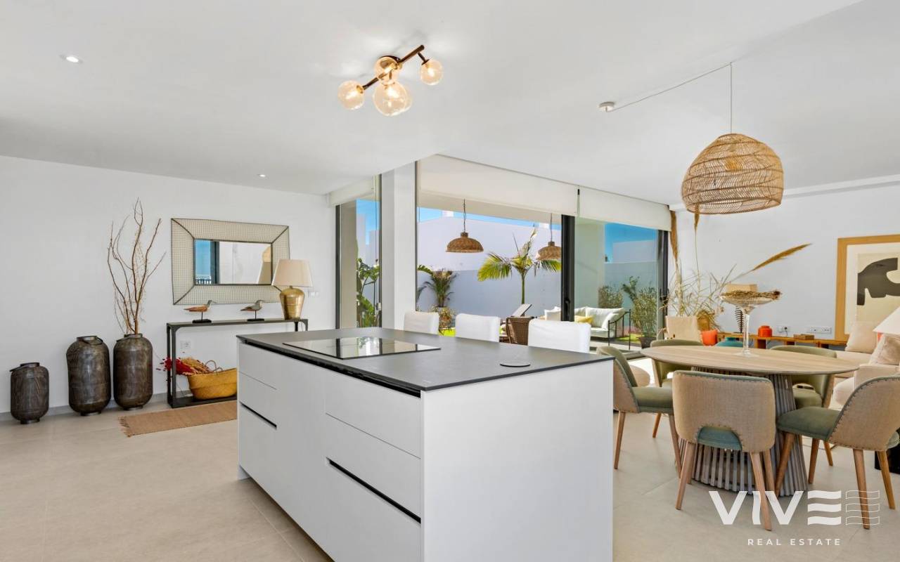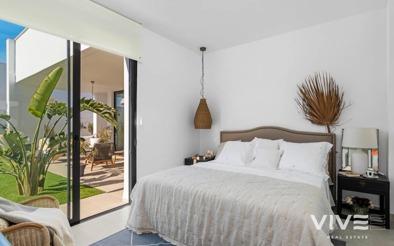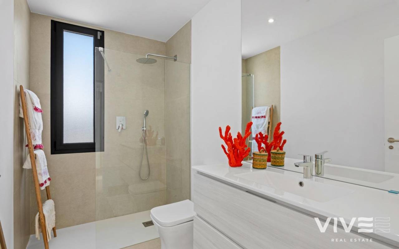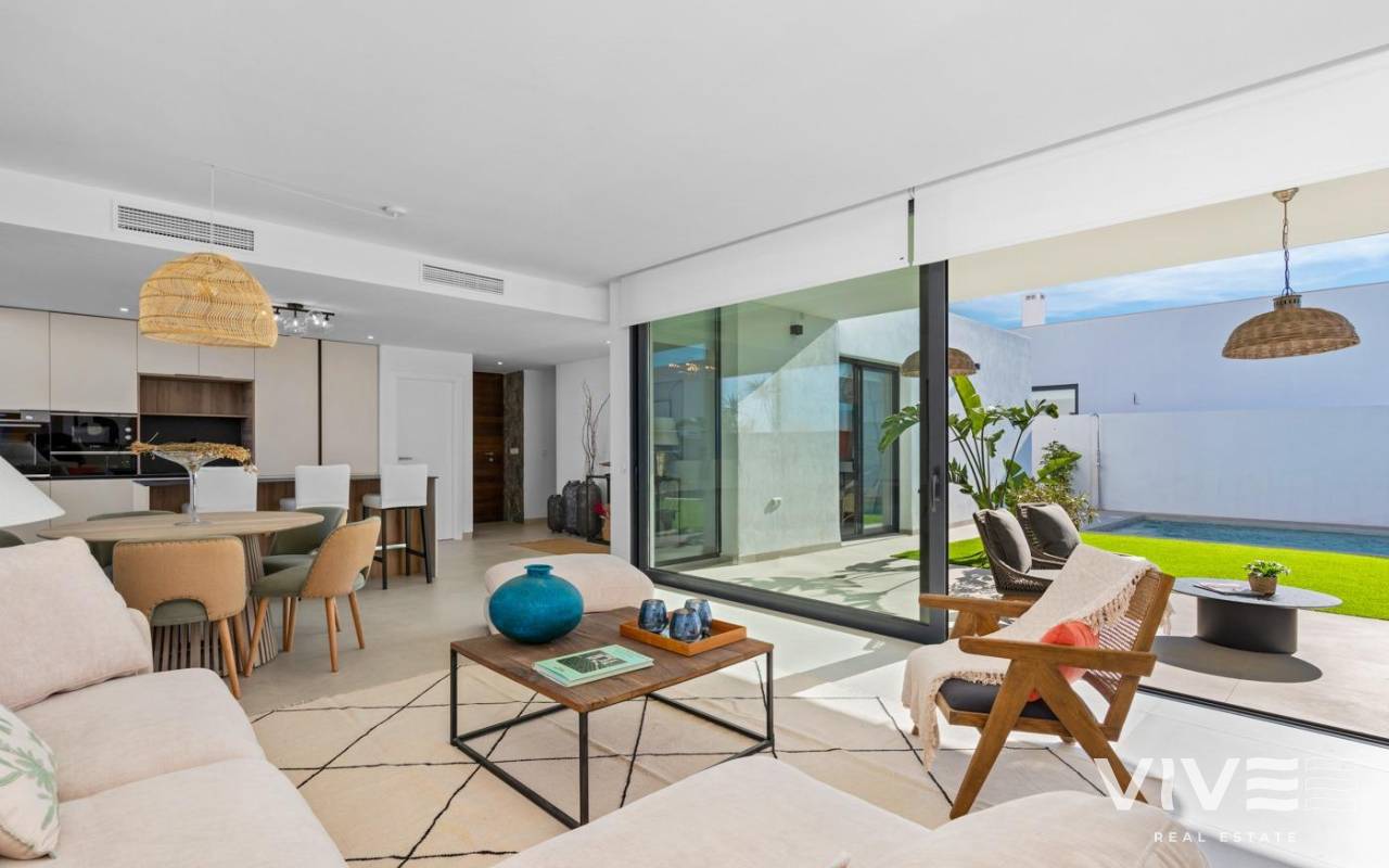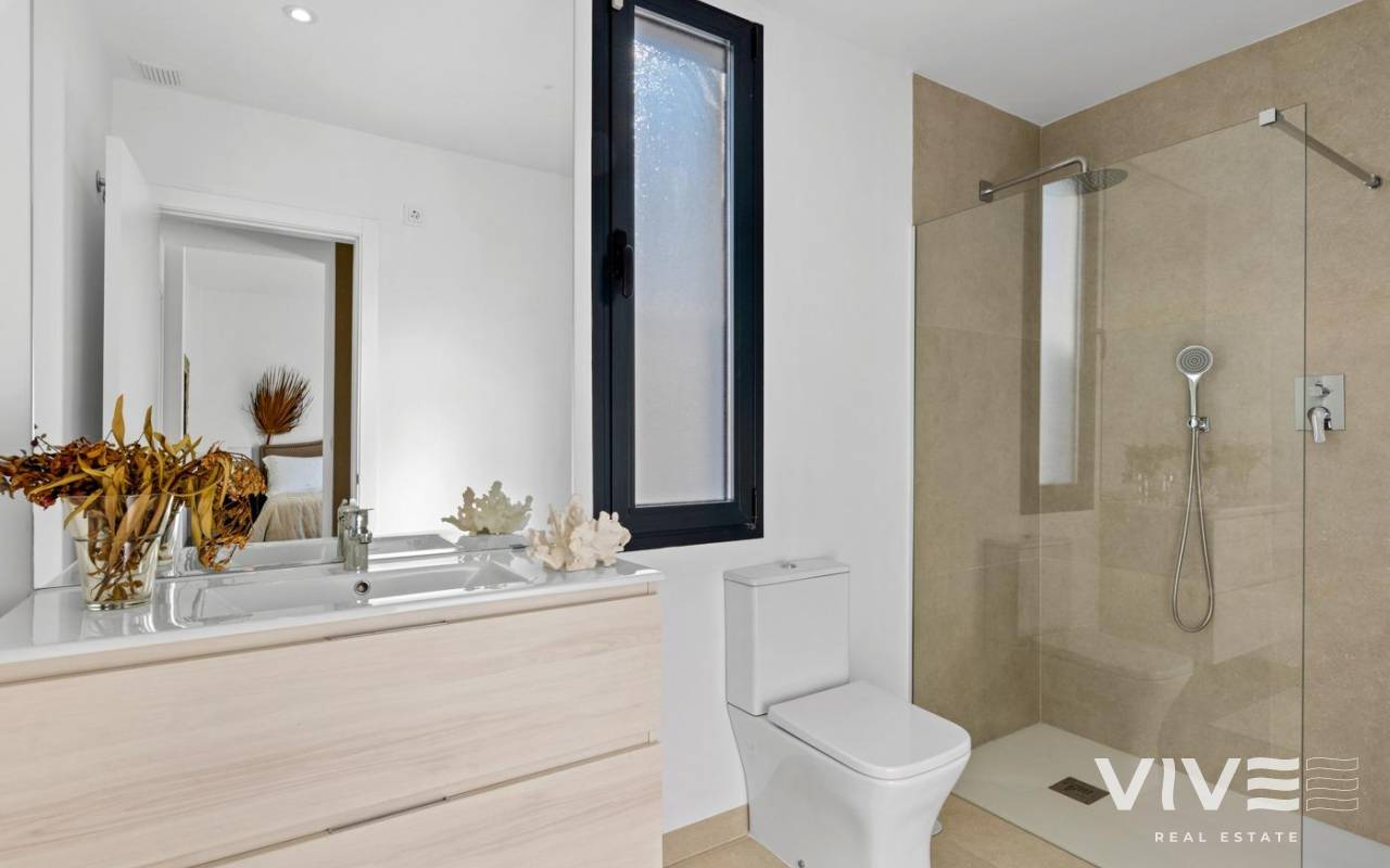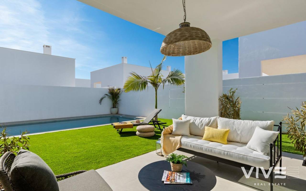 NEW BUILD VILLAS IN MAR DE CRISTAL New Build one level villa with 3 bedrooms, 2 bathrooms and private solarium at 500 meters from the Mar De Cristal beaches. Villas has modern open plan kitchen with the living room, where high sliding windows has access to the garden with private swimming pool and parking space. Mar De Cristal is a coastal town in the middle of beautiful nature and nature parks of which you find photo’s added. This is one of the most beautiful places in Spain and the whole world. In Mar De Cristal you will find some nice restaurants and a supermarket. The nice restaurants of Los Belones are only 2 km’s away, The 36 km beaches of La Manga are a 5 minutes drive. Magical Cabo De Palos and Portman is only a 5 minutes drive. The big shopping centre of Cartagena is less than a 10 minutes drive. Murcia Corvera airport is 30 minutes away, Alicante airport 55 minutes.