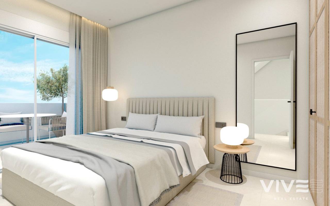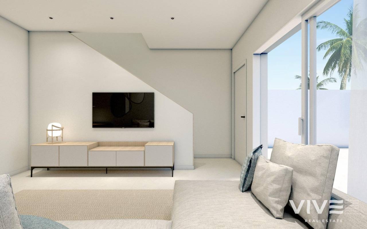 NEW BUILD VILLA IN TORRE DE LA HORADADA New Build villa in residential complex with communal pool in Torre de la Horadada located 800m from the beach. Villa has 3 bedrooms, 2 bathrooms, open plan kitchen with the lounge area, fitted wardrobes, terrace, private solarium, garden and parking space. Torre de la Horadada is located south of Alicante in a beautiful location on the coast. The beautiful beaches of Torre de la Horadada and Mil Palmeras have fine sand beautiful promenade. There are lots of restaurants, bars and shops, also water sports, diving and snorkelling. It is well connected just 40 minutes from Alicante and Murcias Corvera airports, with large commercial shopping centres and multiple golf courses all within easy reach.