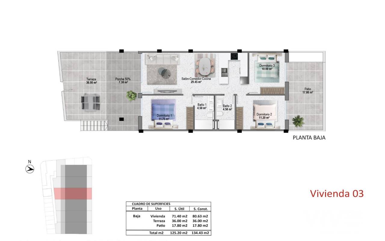 New Build Bungalows in Pilar de la Horadada Near the Beach and Town Centre Contemporary Living in the Heart of Costa Blanca Welcome to a boutique residential complex of 12 new build bungalows located in Pilar de la Horadada, a vibrant coastal town at the southern tip of the Costa Blanca. This prime location offers the perfect blend of tranquil Mediterranean living and convenience, with all essential services, shops, restaurants, and amenities within walking distance. The beautiful sandy beaches of Torre de la Horadada and Mil Palmeras are just 3 km away, ideal for relaxed beach days or water sports. Choice of Ground Floor or Top Floor Bungalows This exclusive development offers two types of modern homes to suit your lifestyle: Ground floor bungalows with 3 bedrooms, 2 bathrooms, and large private front and rear terraces with direct access to the communal pool and gardens. Top floor bungalows with 2 bedrooms, 2 bathrooms, and an expansive private rooftop solarium, complete with a summer kitchen, pergola, and guest toilet. All homes feature bright open-plan living areas, fully equipped kitchens, ducted air conditioning, and private parking. Bedrooms include built-in wardrobes and the bathrooms benefit from underfloor heating for added comfort. Premium Features for Modern Mediterranean Living The homes are designed with high-quality finishes and practical features, including: Armoured front door with aluminium finish Electric shutters in living room and bedrooms Aerothermal hot water system Kitchen appliances from BALAY or equivalent Rooftop solariums with artificial grass, outdoor shower, lighting, and full summer kitchen with dishwasher, small fridge, induction hob, and extractor. Strategic Location with Excellent Connectivity Pilar de la Horadada is well connected to major points of interest along the Costa Blanca and Costa Cálida: Beaches (Torre de la Horadada / Mil Palmeras) – 3 km Lo Romero Golf Course – 6 km Corvera Airport (Murcia) – 40 km Alicante Airport – 55 km Zenia Boulevard Shopping Centre – 14 km Marina of San Pedro del Pinatar – 11 km Your Ideal Home in the Sun Whether you’re looking for a holiday escape, a year-round residence, or a rental investment, these bungalows in Pilar de la Horadada offer excellent value and quality in one of the Costa Blanca’s most desirable towns. Contact us today to arrange a viewing or request more information!
