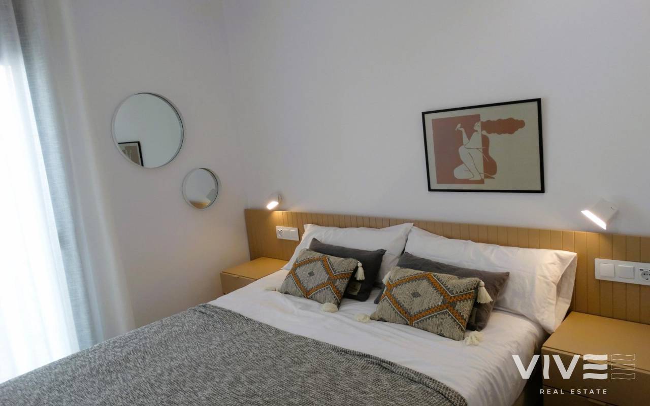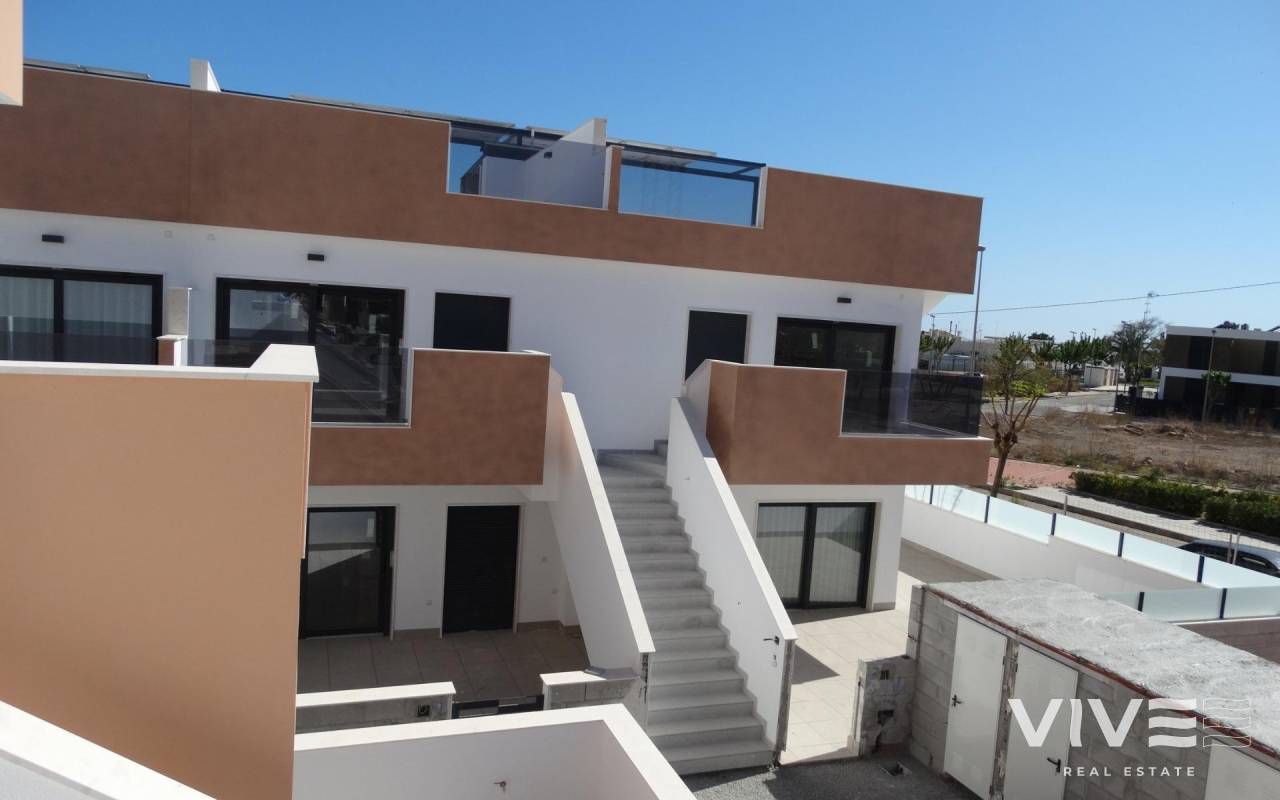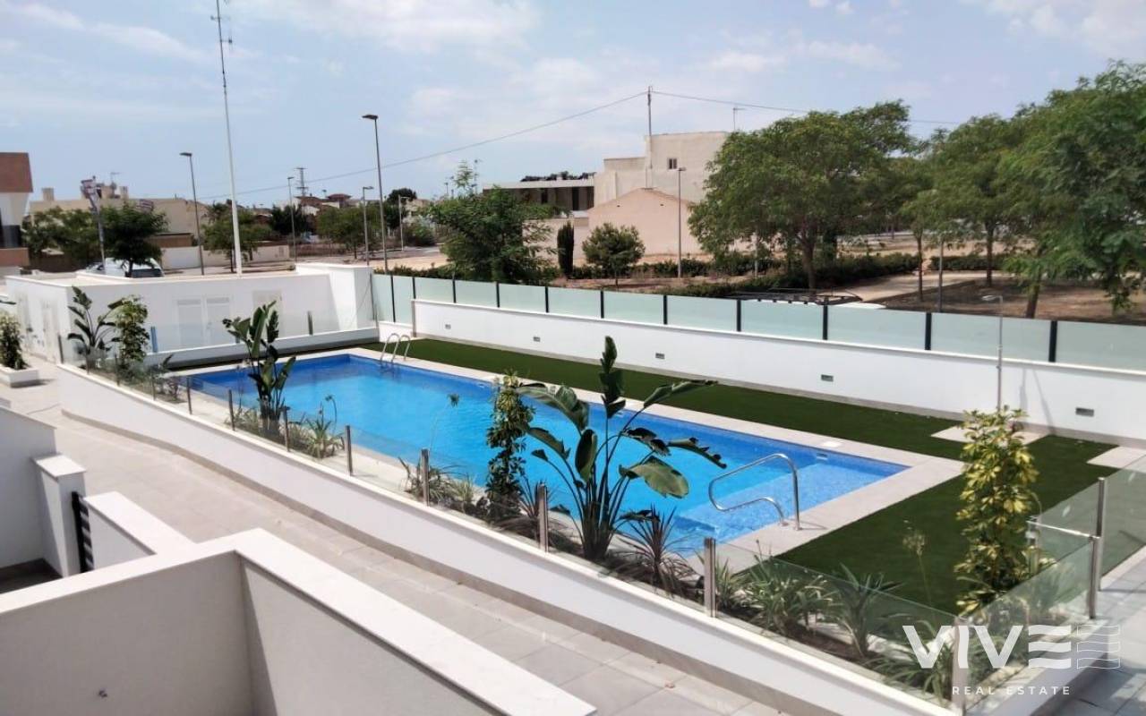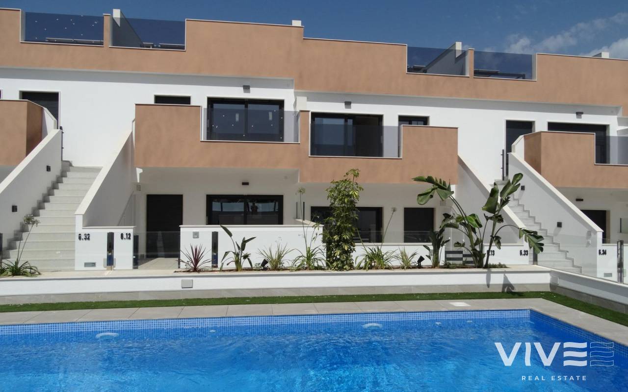 Newly Built Bungalows with Solarium or Garden in Pilar de la Horadada Modern Residential Development on the Southern Costa Blanca Located in the charming municipality of Pilar de la Horadada, this new residential development of bungalows offers a comfortable, Mediterranean lifestyle in one of the most attractive areas of the Costa Blanca. Pilar de la Horadada is known for its welcoming atmosphere, excellent climate and extensive sandy beaches such as Las Higuericas and Mil Palmeras, ideal for enjoying with the family or practising water sports. Layout and Types of Properties The complex consists of 28 modern bungalows available in 2 and 3 bedroom versions, distributed as follows: Ground floors with private garden Upper floors with private solarium and assigned storage room Many of the properties are south-facing, ensuring excellent natural light, and offer views of the communal pool or the adjacent park. Functional and well-equipped spaces Each property has been designed with spacious and functional spaces: Open-plan kitchen with large living-dining room Built-in wardrobes Private terrace in each unit Parking space included In addition, the properties feature: Hot water via aerothermal system Pre-installation of air conditioning PVC exterior carpentry with double glazing and aluminium shutters Bathroom furniture included Communal Areas and Natural Environment The residential complex includes a communal swimming pool surrounded by green areas, perfect for enjoying the sun and tranquillity. Just 4 km from Las Higuericas Beach, it can be easily reached on foot or by bike along the pleasant promenade that connects to the sea. Excellent location and connectivity The location of the residential complex allows access to all kinds of services and points of interest: Supermarkets, shops, bars and restaurants less than 1 km away Golf courses such as Lo Romero 6 km away Dos Mares shopping centre 11 km away Mil Palmeras and Torre de la Horadada beaches just 5 minutes away Murcia (Corvera) airport 40 km away Alicante Airport 65 km away Your New Life in the Sun This residential development in Pilar de la Horadada represents an excellent opportunity to enjoy Mediterranean living in a modern and well-located property. Contact us today for more information or to arrange a viewing and take the first step towards your new home on the Costa Blanca.