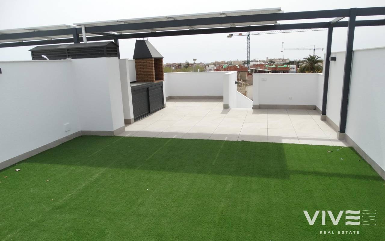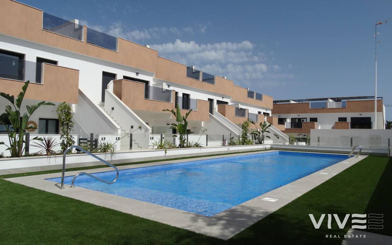 Newly Built Bungalows with Solarium or Garden in Pilar de la Horadada Modern Residential Development on the Southern Costa Blanca Located in the charming municipality of Pilar de la Horadada, this new residential development of bungalows offers a comfortable, Mediterranean lifestyle in one of the most attractive areas of the Costa Blanca. Pilar de la Horadada is known for its welcoming atmosphere, excellent climate and extensive sandy beaches such as Las Higuericas and Mil Palmeras, ideal for enjoying with the family or practising water sports. Layout and Types of Properties The complex consists of 28 modern bungalows available in 2 and 3 bedroom versions, distributed as follows: Ground floors with private garden Upper floors with private solarium and assigned storage room Many of the properties are south-facing, ensuring excellent natural light, and offer views of the communal pool or the adjacent park. Functional and well-equipped spaces Each property has been designed with spacious and functional spaces: Open-plan kitchen with large living-dining room Built-in wardrobes Private terrace in each unit Parking space included In addition, the properties feature: Hot water via aerothermal system Pre-installation of air conditioning PVC exterior carpentry with double glazing and aluminium shutters Bathroom furniture included Communal Areas and Natural Environment The residential complex includes a communal swimming pool surrounded by green areas, perfect for enjoying the sun and tranquillity. Just 4 km from Las Higuericas Beach, it can be easily reached on foot or by bike along the pleasant promenade that connects to the sea. Excellent location and connectivity The location of the residential complex allows access to all kinds of services and points of interest: Supermarkets, shops, bars and restaurants less than 1 km away Golf courses such as Lo Romero 6 km away Dos Mares shopping centre 11 km away Mil Palmeras and Torre de la Horadada beaches just 5 minutes away Murcia (Corvera) airport 40 km away Alicante Airport 65 km away Your New Life in the Sun This residential development in Pilar de la Horadada represents an excellent opportunity to enjoy Mediterranean living in a modern and well-located property. Contact us today for more information or to arrange a viewing and take the first step towards your new home on the Costa Blanca.