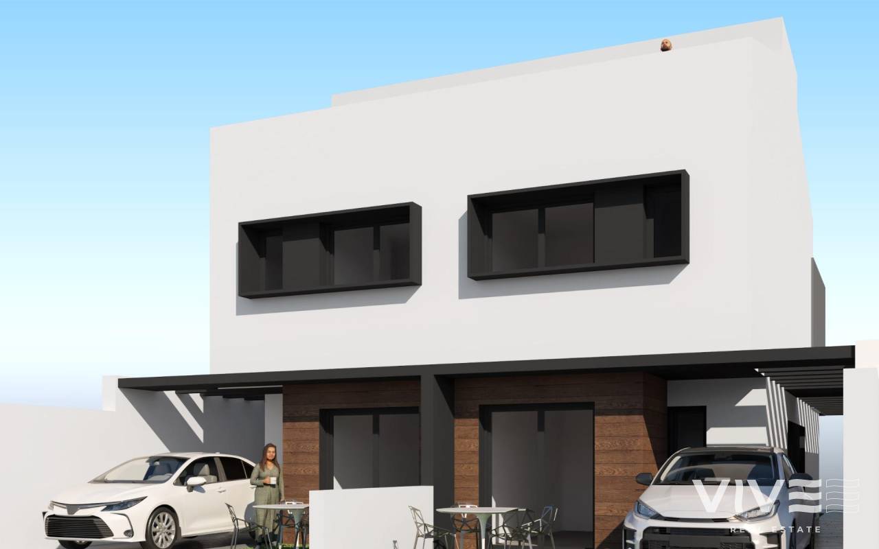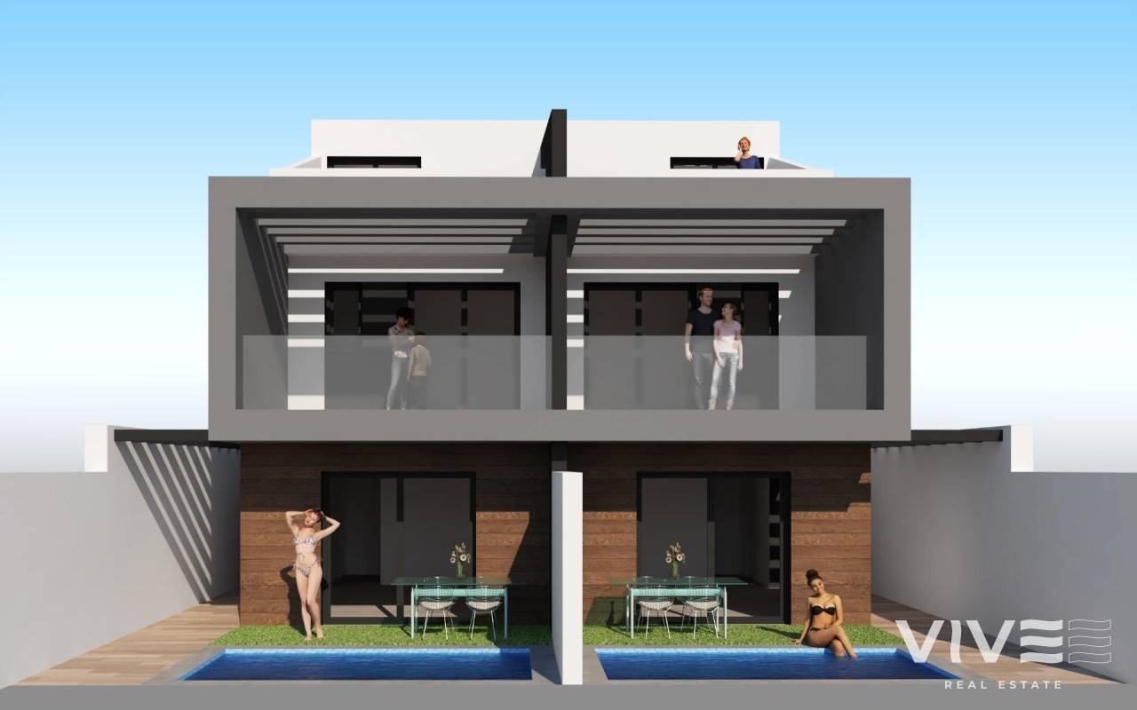 Modern Semi-Detached Villas with Private Pool Near the Sea in Santiago de la Ribera Exclusive New Construction Just 1 km from the Beach Discover this limited-edition development of only two semi-detached villas located in Santiago de la Ribera, a charming coastal town on the Murcian coast, known for its relaxed lifestyle, clean beaches, and excellent year-round climate. These new homes are situated just 1 km from the shores of the Mar Menor, offering the perfect combination of privacy, comfort, and proximity to essential services and leisure options. Contemporary Design with Functional Layout Each villa is thoughtfully distributed across two floors plus a rooftop solarium, providing ample space for modern living. The properties feature: 3 spacious bedrooms, including one on the ground floor 3 fully fitted bathrooms, two of which are en suite A private garden and swimming pool Terrace on the first floor and a rooftop solarium ideal for sunbathing or entertaining Private parking within the plot, with access from the rear street and a separate pedestrian entrance at the front This layout ensures optimal privacy and ease of access while maximizing outdoor living space. High-Quality Finishes and Features Built with attention to detail and modern standards, the homes include: Aluminium exterior carpentry with thermal break and double-glazed windows Complete ducted air conditioning installation Private pool included with each villa Secure parking space within the plot These homes are designed for year-round comfort, whether as a primary residence, a second home, or a vacation rental investment. Prime Location on the Costa Cálida Santiago de la Ribera offers a vibrant Mediterranean lifestyle with everything close at hand: Beach (Mar Menor) – 1 km La Ribera Shopping Center – 2 km Roda Golf – 5 km San Javier Airport – 6 km Lo Pagán Marina – 4 km Dos Mares Shopping Mall – 3 km Excellent road access to Murcia (40 km) and Cartagena (30 km) With its rich local culture, weekly markets, seafront promenades, and watersport options, Santiago de la Ribera is an ideal setting for enjoying the best of the Costa Cálida. Make Coastal Living Your Reality Don’t miss this rare opportunity to own a stylish, new-build villa in one of the most desirable areas of Murcia’s coastline. Contact us now for more information or to schedule a visit.