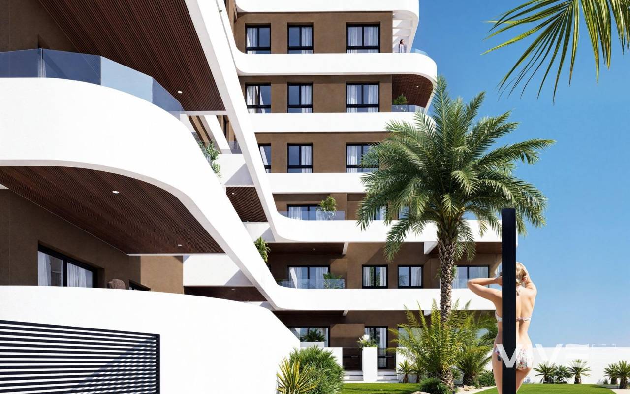 New Build Apartments in Guardamar del Segura – Modern Living Just 1.4 km from the Beach Discover a new residential development in Guardamar del Segura, Alicante, offering just 19 exclusive, modern homes designed for comfortable, contemporary living on the Costa Blanca. Ideally located just 1.4 km from the beach and a short walk from the town center, this development combines style, practicality, and a prime coastal setting. Exclusive Residential Project with Limited Availability This boutique development features 2 and 3-bedroom apartments with a range of layouts to suit different needs: Ground-floor units with spacious private terraces Mid-level apartments with generous balconies or open terraces. A spectacular penthouse with a private solarium and swimming pool Each property showcases elegant, curved architectural lines, glass railings, and modern finishes—ideal for both year-round residence or a luxurious holiday retreat. Premium Finishes and Energy-Efficient Features Designed for comfort and sustainability, each home includes: Reinforced front door for added security Fully furnished kitchen with appliances included Energy-efficient aerothermal system for hot water Private parking space included in the price The building also features a communal swimming pool and landscaped garden areas, perfect for enjoying the sunny Mediterranean climate. Prime Location in Guardamar del Segura Situated in a well-connected and vibrant part of Guardamar, this development provides easy access to nature, beaches, and essential services. Residents enjoy proximity to supermarkets, restaurants, medical centers, parks, and the town’s famous pine forest and dunes. Key distances: Guardamar town center – 1 km Closest beach – 1.4 km Marina – 2 km Reina Sofía Park – 1.5 km La Marquesa Golf (Ciudad Quesada) – 9 km Habaneras Shopping Center (Torrevieja) – 13 km Alicante-Elche Airport – 33 km Public transport connections include direct bus lines to Alicante and Torrevieja, offering easy access without the need for a car. Secure Your Apartment on the Costa Blanca Whether you’re looking for a permanent residence, vacation property, or smart investment, this new development in Guardamar del Segura is the perfect choice. Contact us today to learn more or reserve your new home by the sea.