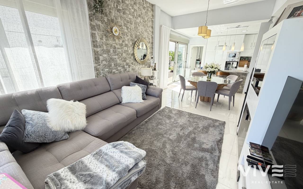Stunning 3-Bedroom Single-Storey Villa in Pau 26, Villamartin This splendid three-bedroom, single-storey villa is ideally situated in the sought-after Pau 26 area of Villamartin. Positioned on a desirable corner plot along a private road, the property offers both privacy and generous outdoor living space. The exterior boasts a spacious garden with multiple seating areas, a private swimming pool, and off-road parking. A standout feature is the expansive rooftop solarium, complete with a jacuzzi and outdoor kitchen—perfect for entertaining while enjoying panoramic views of the surrounding area. Inside, the villa features a bright and modern open-plan living space with a large, well-appointed kitchen. There are three generously sized double bedrooms, including a master bedroom with en-suite bathroom, as well as a separate, spacious family bathroom. Offered unfurnished, this property is ready for immediate occupancy—making it an ideal choice for a permanent residence, holiday home, or investment opportunity.