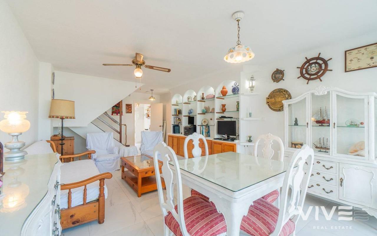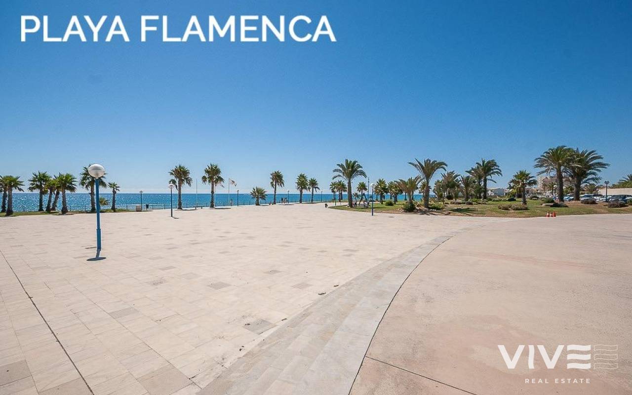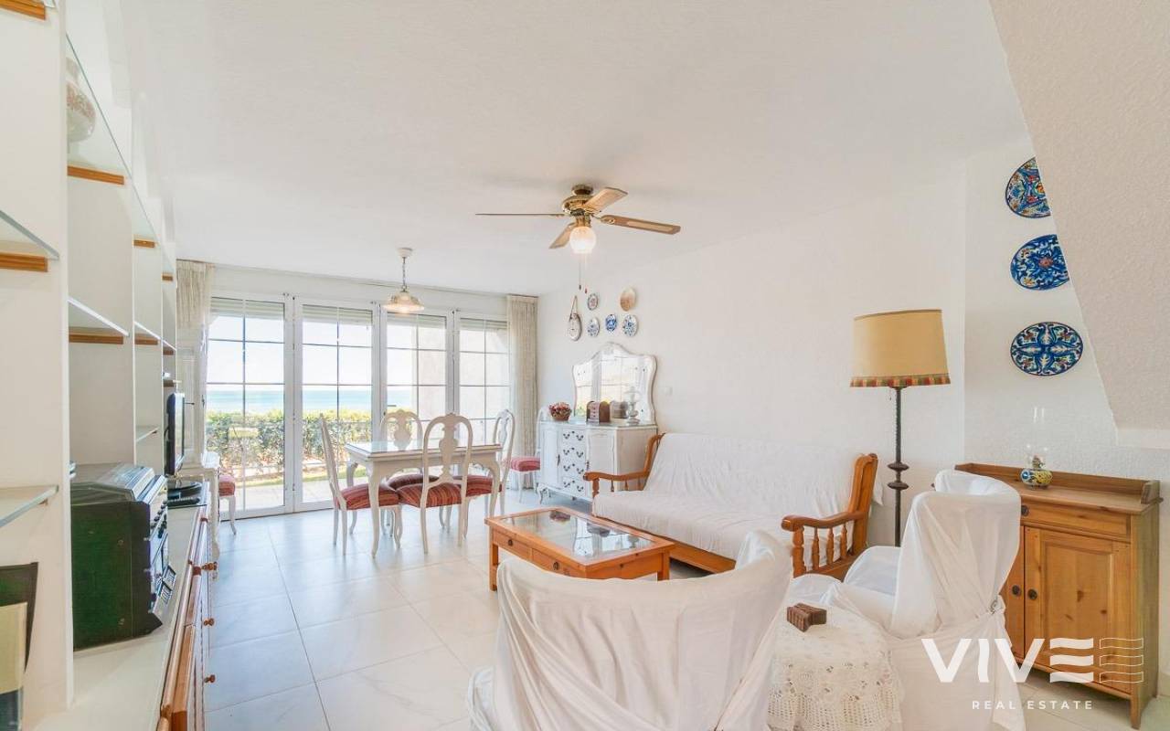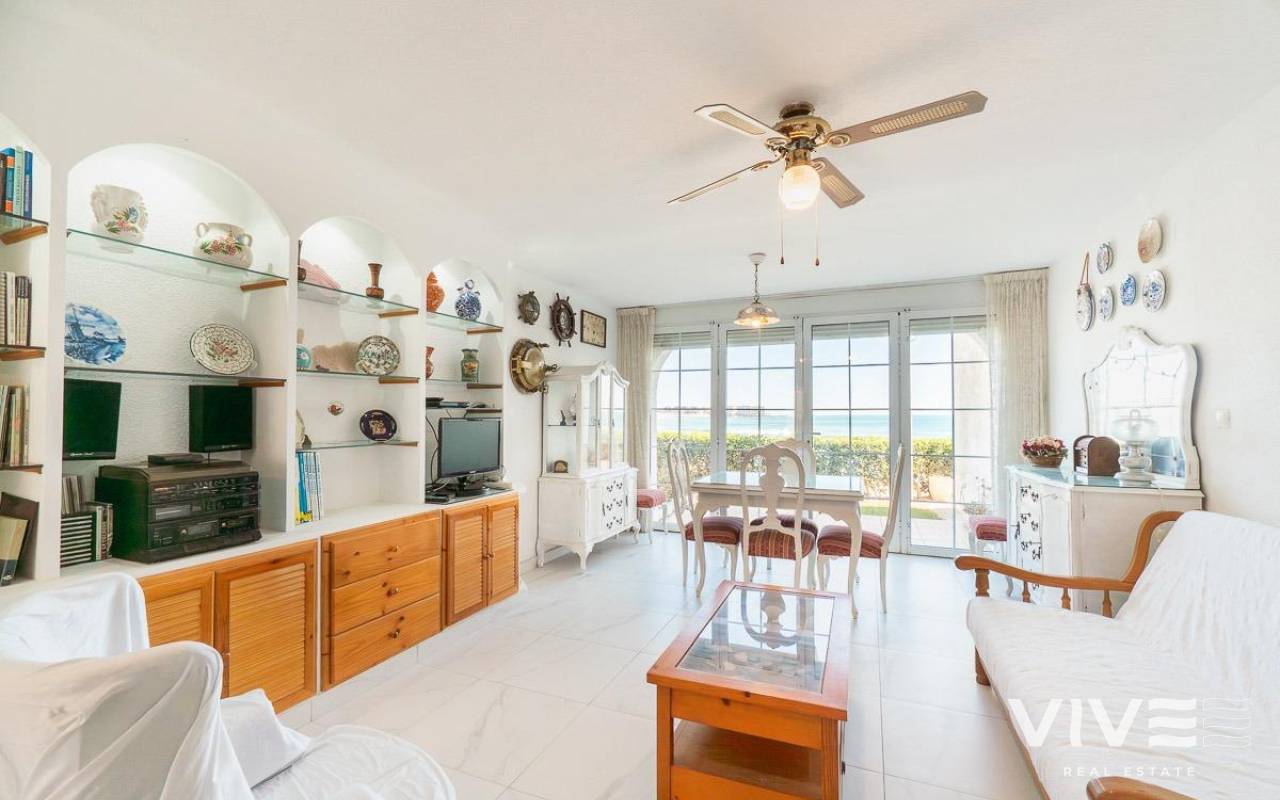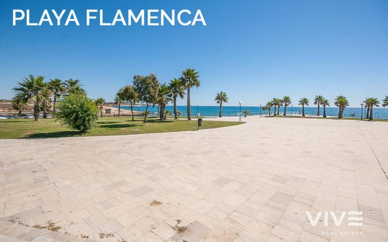 Discover a unique gem on the seafront in the prestigious area of Playa Flamenca, where properties rarely come onto the market due to its privileged cliffside location.. . This charming townhouse, with 90 m2 built, offers an unparalleled Mediterranean lifestyle. On the ground floor, you will find a spacious living room filled with natural light, featuring a large front window with direct access to the garden, where you can enjoy open views and the soothing sound of the sea. The kitchen is independent, practical, and perfectly suited for everyday living. At the entrance, there is also a cozy private garden that adds a welcoming touch.. . Upstairs, there are two spacious double bedrooms. The master bedroom is truly exceptional: imagine waking up and enjoying sea views directly from your bed. This floor also includes a fully equipped bathroom.. . The property is part of an exclusive residential complex with a communal swimming pool, perfect for enjoying the Mediterranean climate all year round. In this highly sought-after area, where properties are rarely available, this home represents a unique opportunity both as a permanent residence or an investment.. . Living here means embracing a seafront lifestyle in one of the most desirable locations in Orihuela Costa.. . A truly exceptional property where the sea becomes part of your home.. . Price: €390,000. Taxes and purchase costs not included (according to applicable regulations). A detailed breakdown of additional costs will be provided prior to reservation.