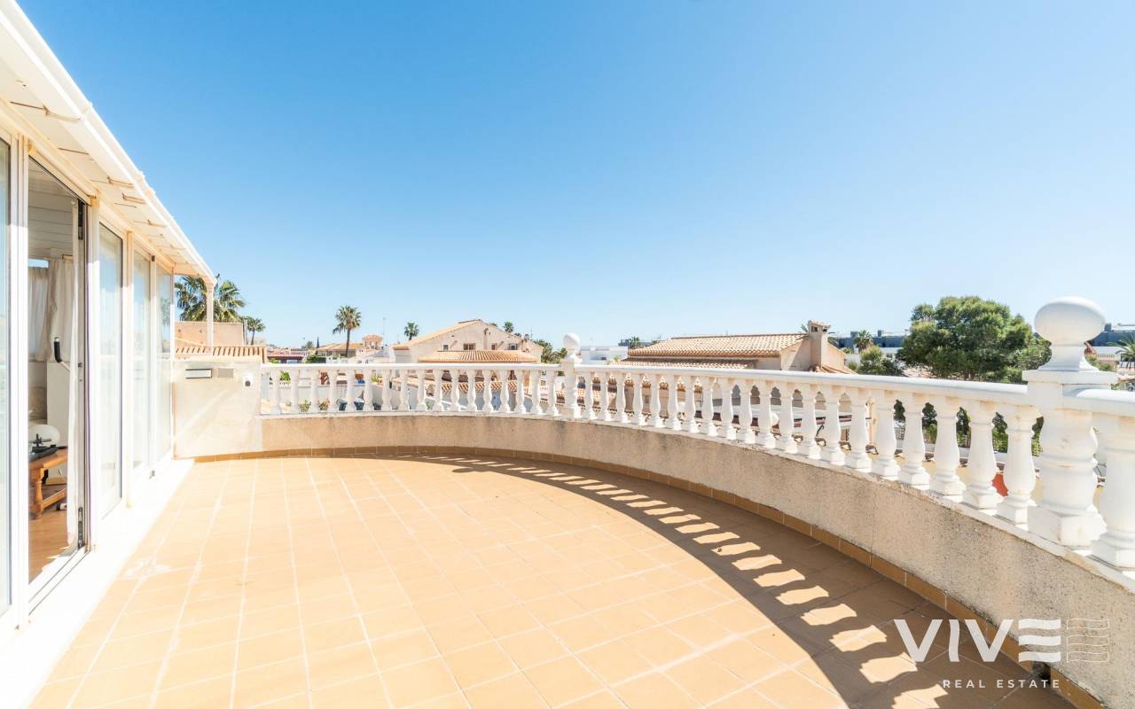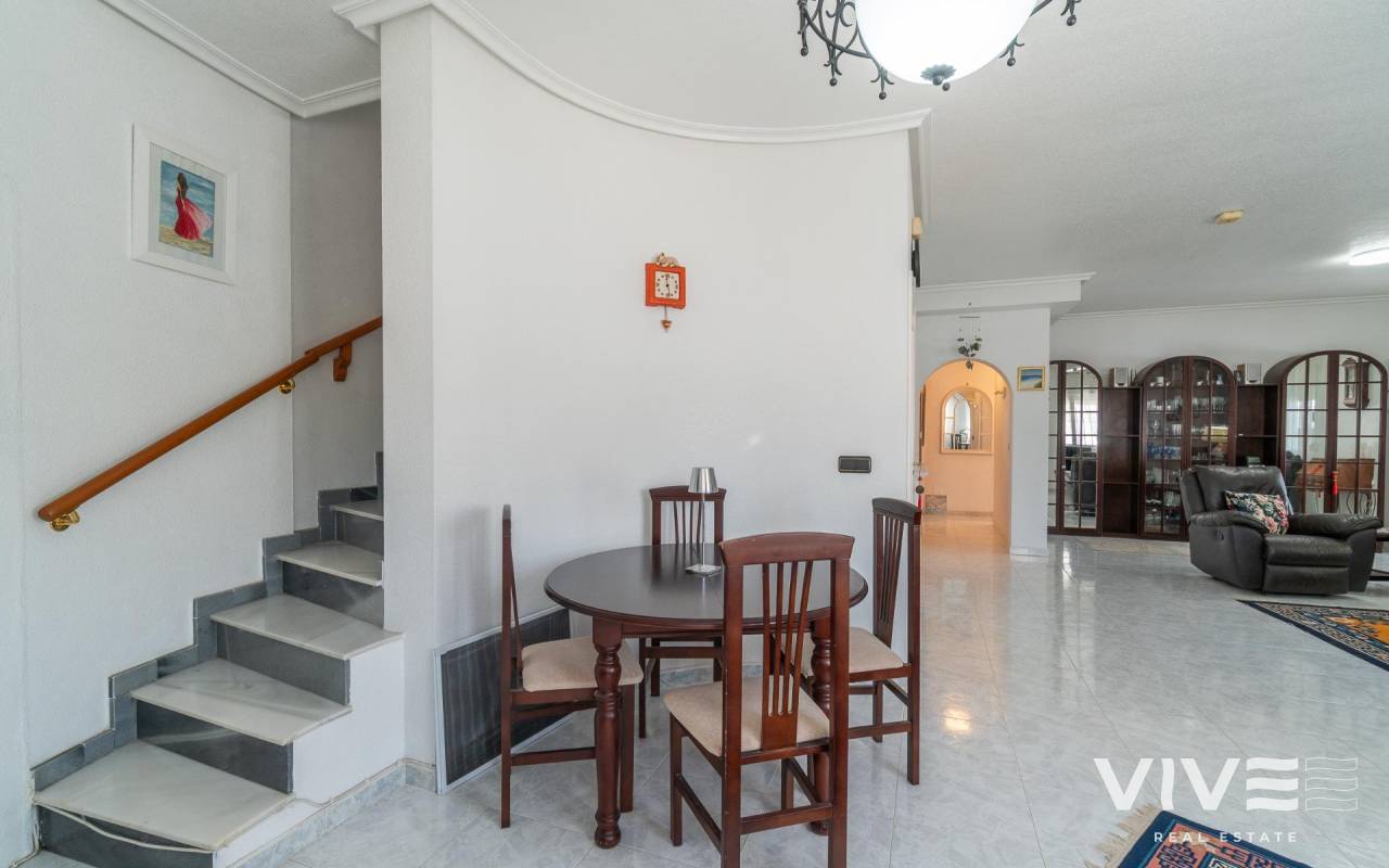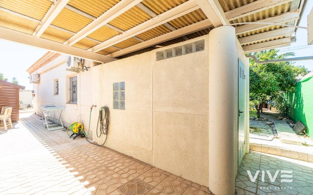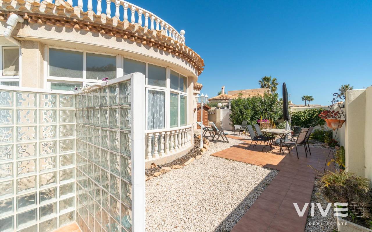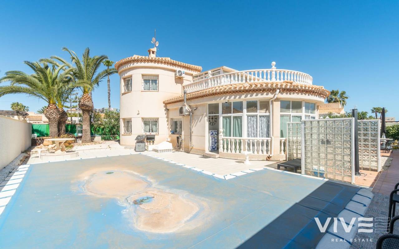 This large detached villa, situated on a 500 m2 plot with over 190 m2 of living space, is superbly located in the heart of Playa Flamenca. It is truly within walking distance of everything: supermarkets, municipal and private sports facilities, the Zenia Boulevard shopping center, a public school, the town hall, shops, doctors, and the beaches of Orihuela Costa.. . The Saturday market is very close, with direct walking access, allowing you to enjoy shopping for fruits, vegetables, and traditional products while experiencing the atmosphere of a small Spanish village. At the same time, you can easily access the property by car without encountering road closures.. . The 500 m2 plot, as mentioned, offers numerous possibilities for enjoying the outdoor space, including a swimming pool, barbecue, outdoor kitchen, solarium, pergolas, parking, and more. Maintenance is very easy, with terraces, artificial grass, and gravel areas, ensuring that keeping your garden and outdoor areas in perfect condition requires minimal effort.. . The property features on-site parking with automatic gates and a private garage/storage area to keep your vehicle protected from the Alicante sun. The pool area is perfect for sunbathing in privacy, while the built-in barbecue and wooden pergola allow you to fully utilize the plot's potential, thanks to its southern exposure and sun exposure throughout the day. This also ensures abundant natural light throughout the property's daytime living areas.. . There is a glazed solarium terrace at the entrance to the house, but with its traditional clay tile roof. In winter, when the sun is lower, it can be used for sunbathing, and in summer, by opening the glass windows and enjoying the shade of the roof, it becomes a cool and airy space where you can relax with a book and spend time with family in a semi-covered outdoor area. From this covered terrace with arches, you enter the main house with its large living-dining room, featuring a fireplace and south-facing windows for maximum natural light and sunshine, and a semi-independent kitchen with a breakfast bar and an adjacent utility room that combines pantry and laundry space.. On the same ground floor, the house has two spacious bedrooms with built-in wardrobes, a bathroom with a walk-in shower, and the staircase leading to the upper floor.. . Upstairs, you'll find the large master bedroom overlooking its own garden and swimming pool, a large bathroom with a walk-in shower, and a large glazed space perfect for a playroom, office, guest room, or any other use. This is complemented by the rest of the solarium, which offers sea views and a south-facing orientation, ensuring sunshine all day long.. . In short, this is a detached villa in a central and well-connected location, with outdoor areas for leisure and family enjoyment. It is in perfect condition and ready to move into, and a visit is well worth it to appreciate its excellent features.. . Price: €640,000. Taxes and closing costs not included (according to applicable regulations). A breakdown of additional costs will be provided before booking.. . In the case of a transaction with two intermediaries, the buyer's professional fees will be 1.5% of the final purchase price, with a minimum of €3,000, plus VAT (21%), unless expressly agreed otherwise. These fees are not included in the advertised price.