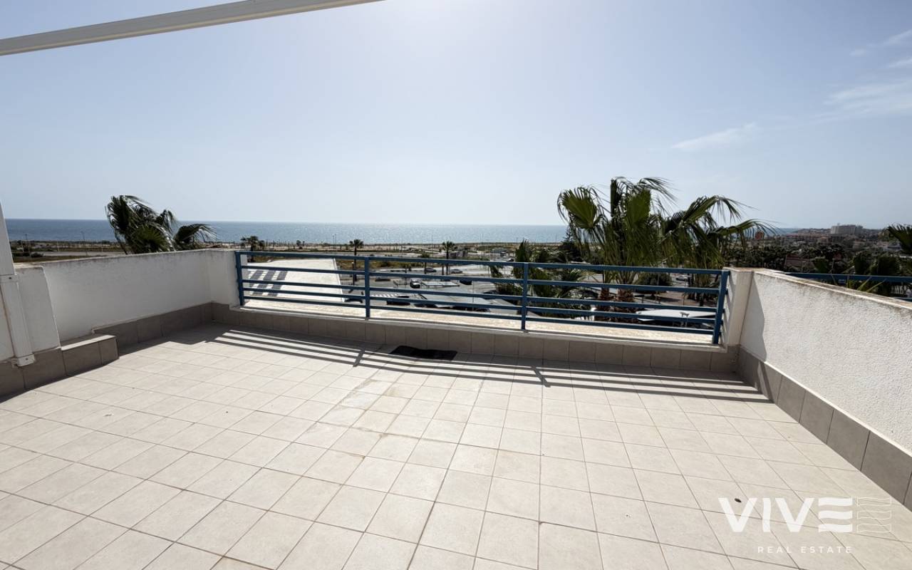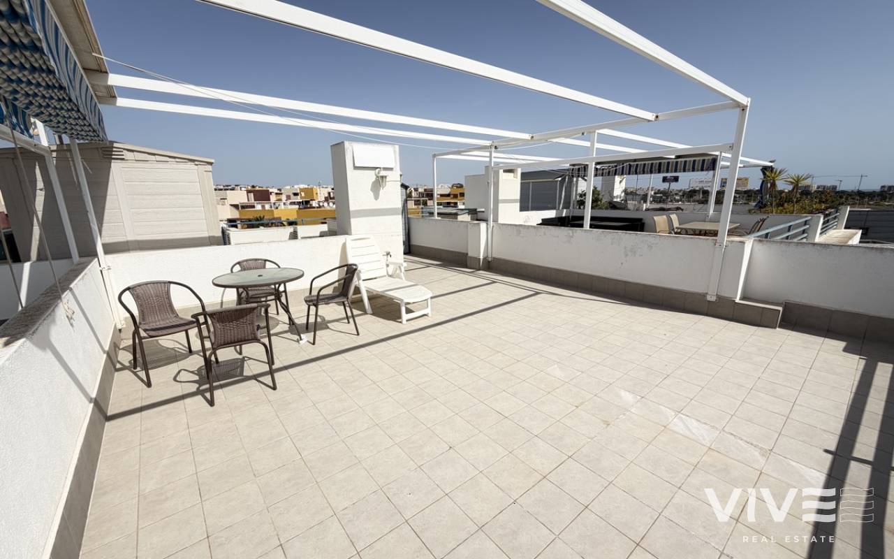 A stunning penthouse apartment situated in the sought-after La Calma development in Playa Flamenca. Ideally located just moments from the sea, this exceptional property offers generous living space both internally and externally. The apartment features two spacious bedrooms, each with its own en-suite bathroom, along with a private balcony and an expansive rooftop solarium—perfect for relaxing or entertaining while enjoying the Mediterranean climate. Residents benefit from access to a selection of beautifully maintained communal swimming pools, as well as being conveniently positioned close to a wide range of local amenities, including shops, restaurants, and leisure facilities. This is an exciting opportunity to acquire a superb penthouse in a prime coastal location—properties of this calibre rarely remain on the market for long.