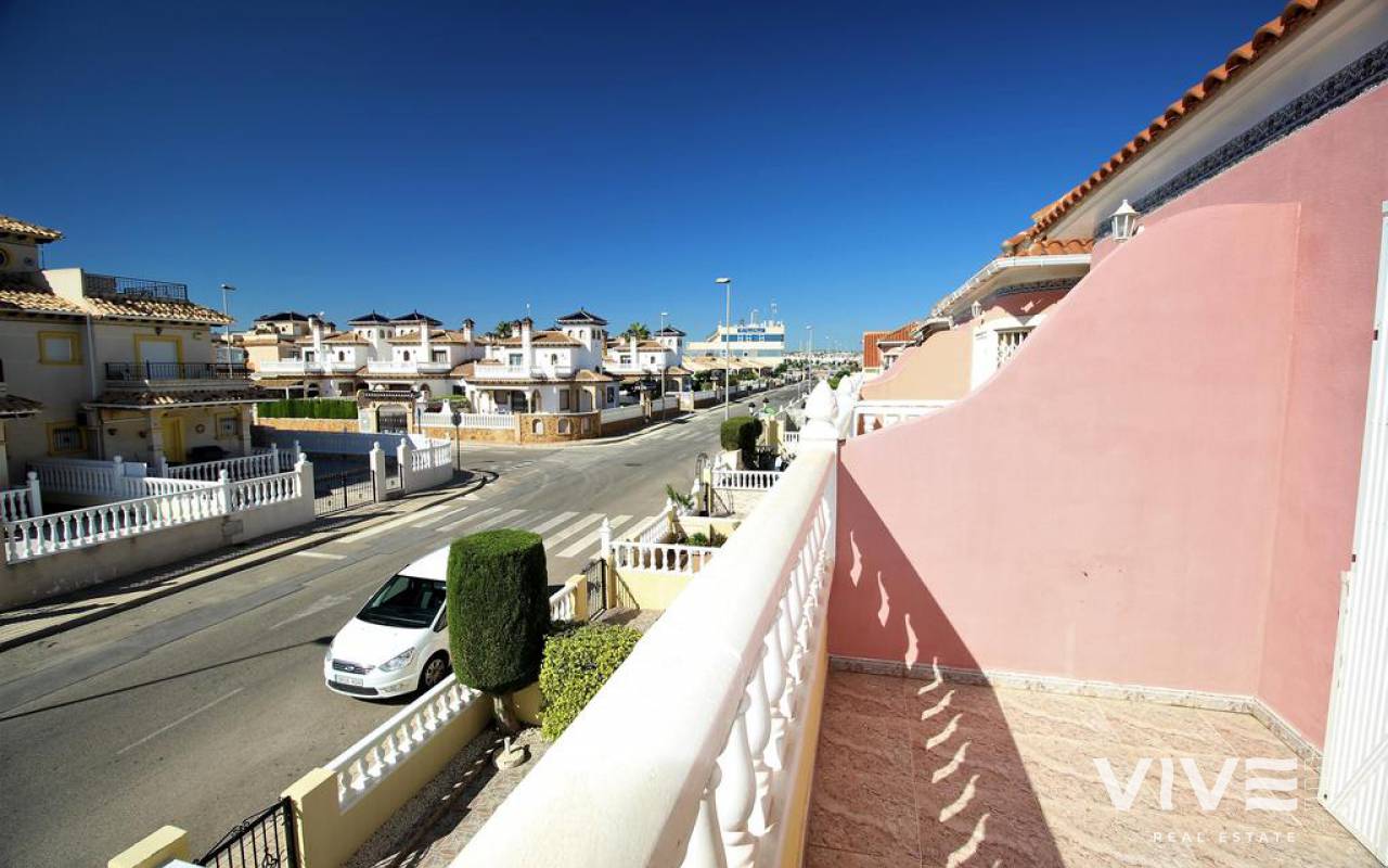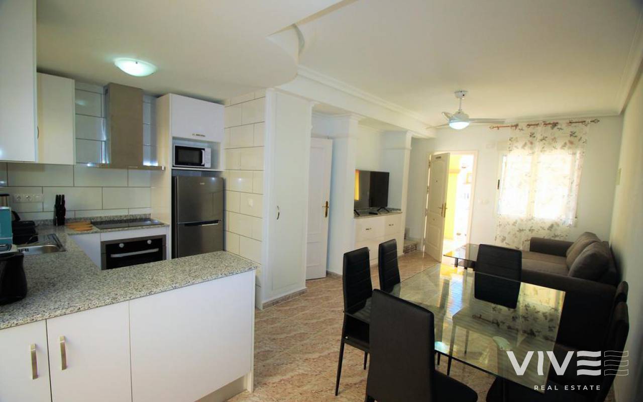 The bungalow Granito has a huge front terrace and porch, offering a 2 bed, 1 bath +1 WC accommodation. The big lounge has a dining area and next to it a fully equiped kitchen. The back terrace is used as an utility space. All the house has air condition, in the lounge you have a flat screen tv and free WiFi as well you have a toilet here.. On the first floor you have the two bedrooms, the main bedroom has a very nice Balkony in front of it and the bath. Featuring both city views and a garden, the comunity has an outdoor pool. Barbecue facilities are available.This town house is located 1 km from Zenia Boulevard Shopping Centre in Playas de Orihuela, the airport San Javier is 20 km away.