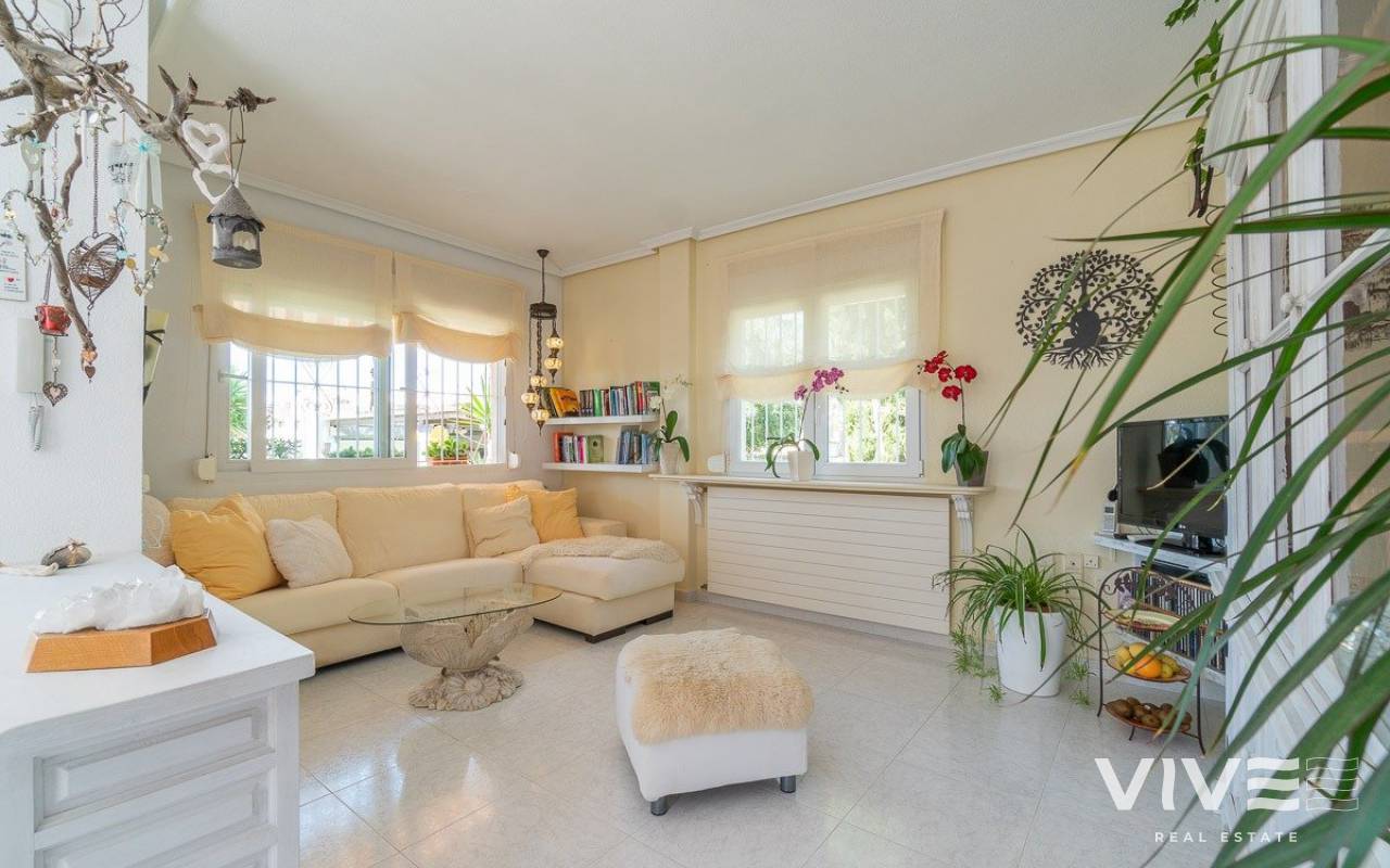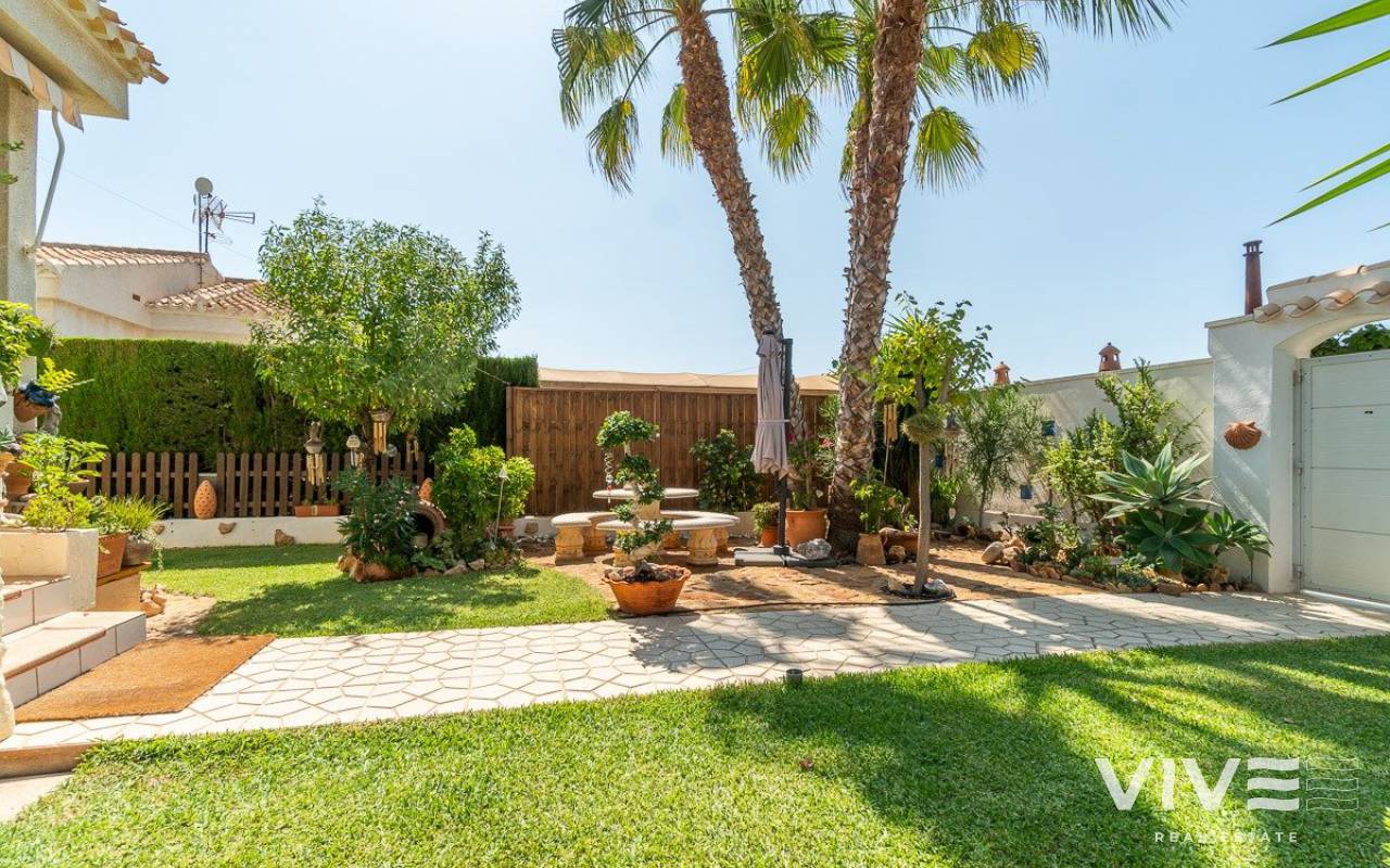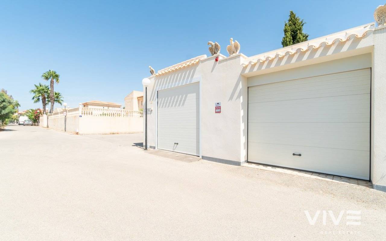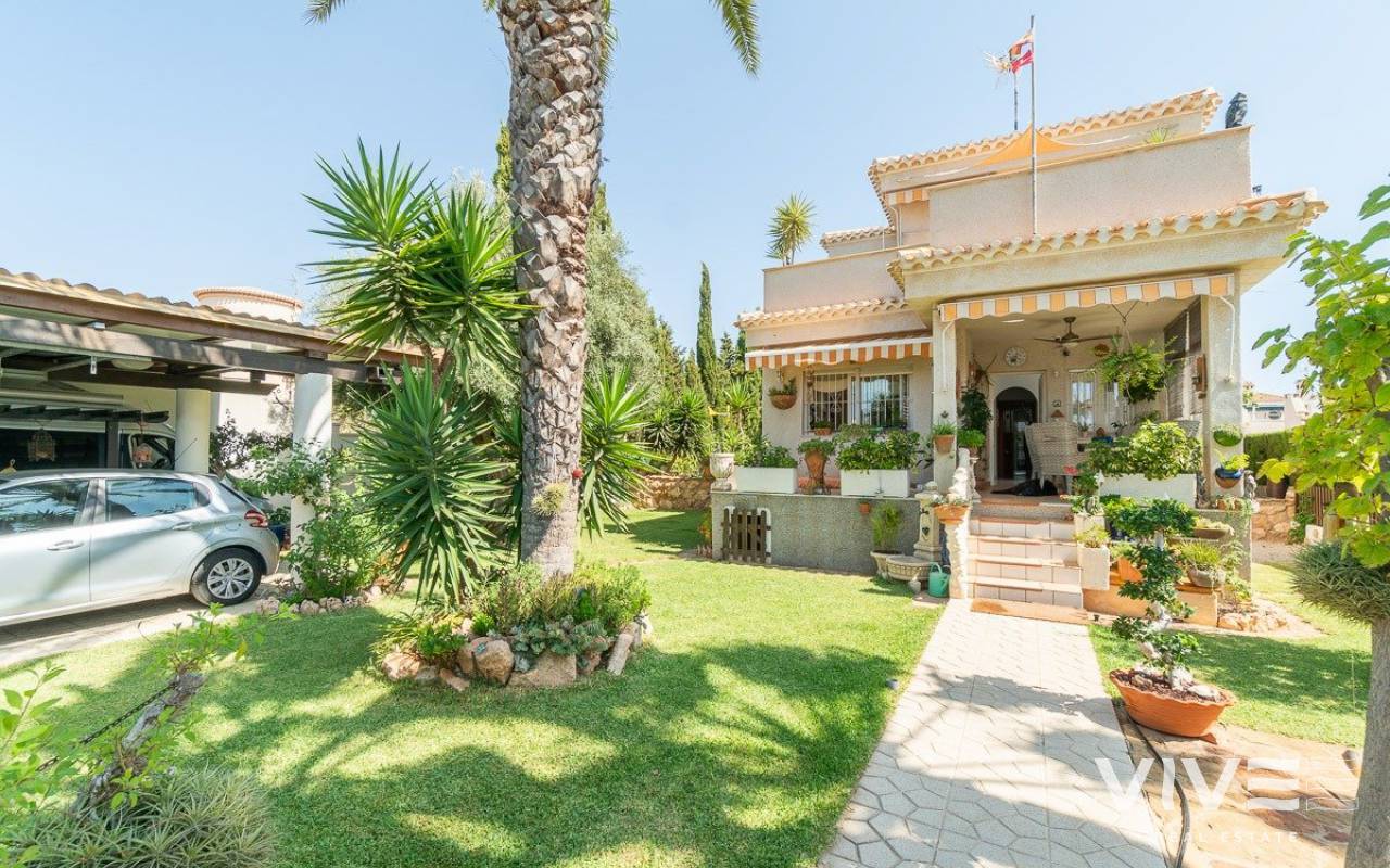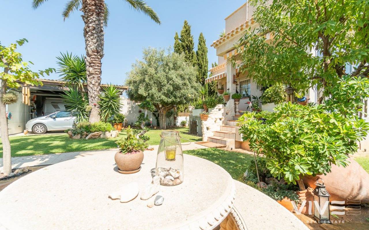 This beautiful Mediterranean-style villa is located in the center of Playa Flamenca, a few meters from the largest shopping center in the province of Alicante. The property is located in Orihuela Costa, near the Mediterranean Sea, about 20 minutes walk. In addition, the post office, the town hall and all necessary German-speaking service providers are located in the immediate vicinity. There are 2 private hospitals in Torrevieja (5 km). The largest shopping center in the province of Alicante, Zenia Boulevard, is a 5-minute drive away. Alicante is 60 km away, less than an hour from the airport. The plot measures 550 m2 and its distribution is as follows: in front there is an automatically irrigated lawn, 4 palm trees and a centenary olive tree, which contribute to an exceptionally cool microclimate. In the background there are trees such as lemon, fig, orange, medlar and pomegranate trees, as well as a garden of plants with irrigation controlled in time by means of droplets.There is a double garage for 1 car and a 6m long motorhome with automatic doors.Two terraces, one on the ground floor and one on the top floor. The orientation is south, so you can enjoy the sun all day. There are enough shady spots. The size of the house is considerable: approx. 180 m2 of constructed area, consisting of: GROUND FLOOR with living / dining room, separate kitchen, 1 bedroom and 1 bathroom. FIRST FLOOR with 2 bedrooms and 1 bathroom with a new large shower. All bedrooms are large and can accommodate a double bed or two single beds. BASEMENT FLOOR with 5 rooms, such as pantry, laundry room, room / office, storage room and workshop / central heating (heat pump). The Extras to highlight are: The sanitary hot water and part of the electricity is generated with a photovoltaic panel.The house is sold furnished and is in very good condition. There is a multi-stage filtration system for drinking water and a permanent 700 liter water supply throughout the house. The property is well worth a visit. It is very suitable as a residence all year round. The photovoltaic system generates an average of 2.3 kWh per day. Electricity is consumed directly at home and reduces electricity consumption by around 15%. The windows are double-glazed and the masonry is two-layer with thermal insulation. Internet and telephony run over fiber optic cables to the modem / router. On the property there is also a fully covered double garage with automatic gates for one car and a 6m long mobile home. There are no pending corrective actions. There are no regular expenses for community pool, community gardens, etc.
