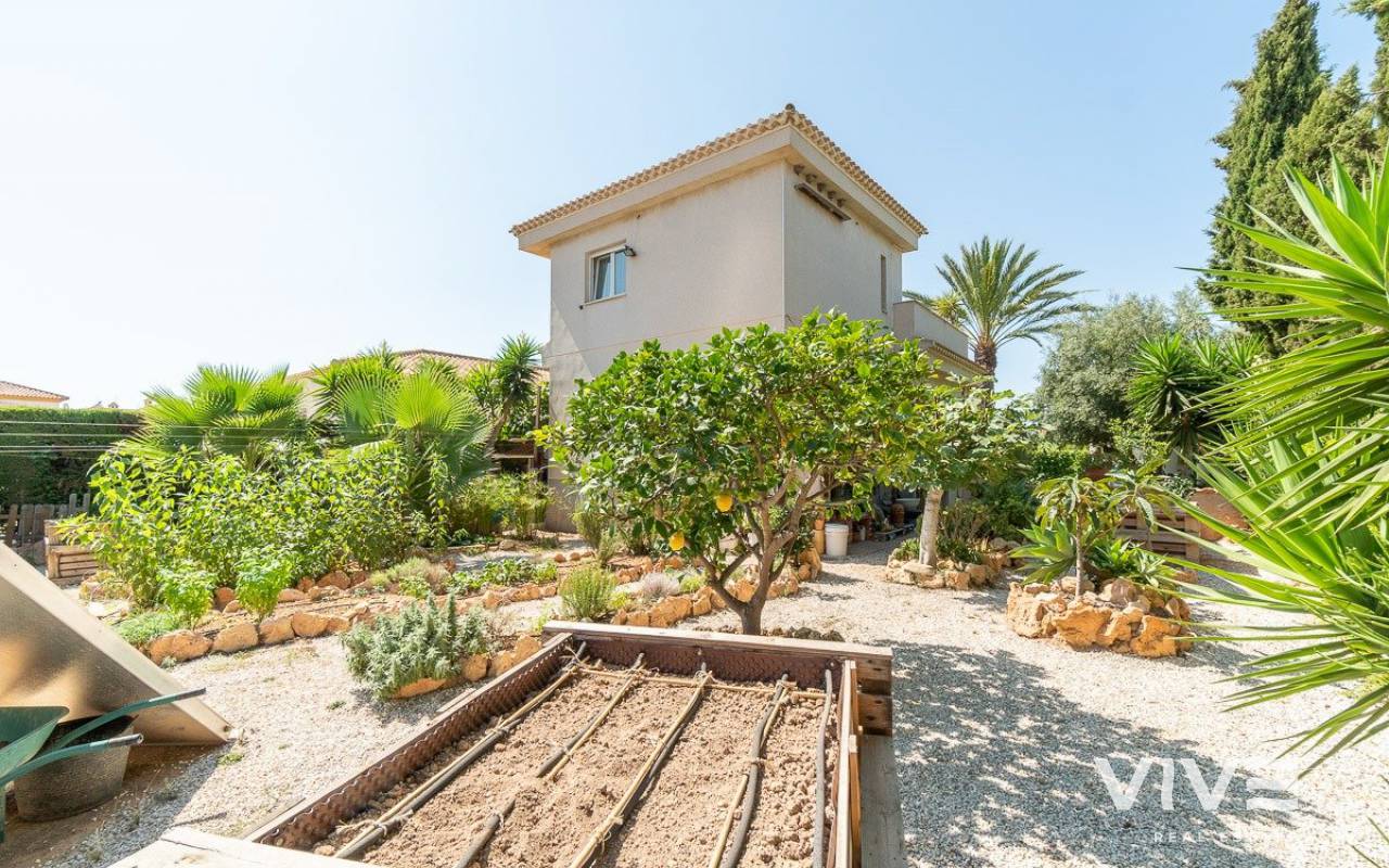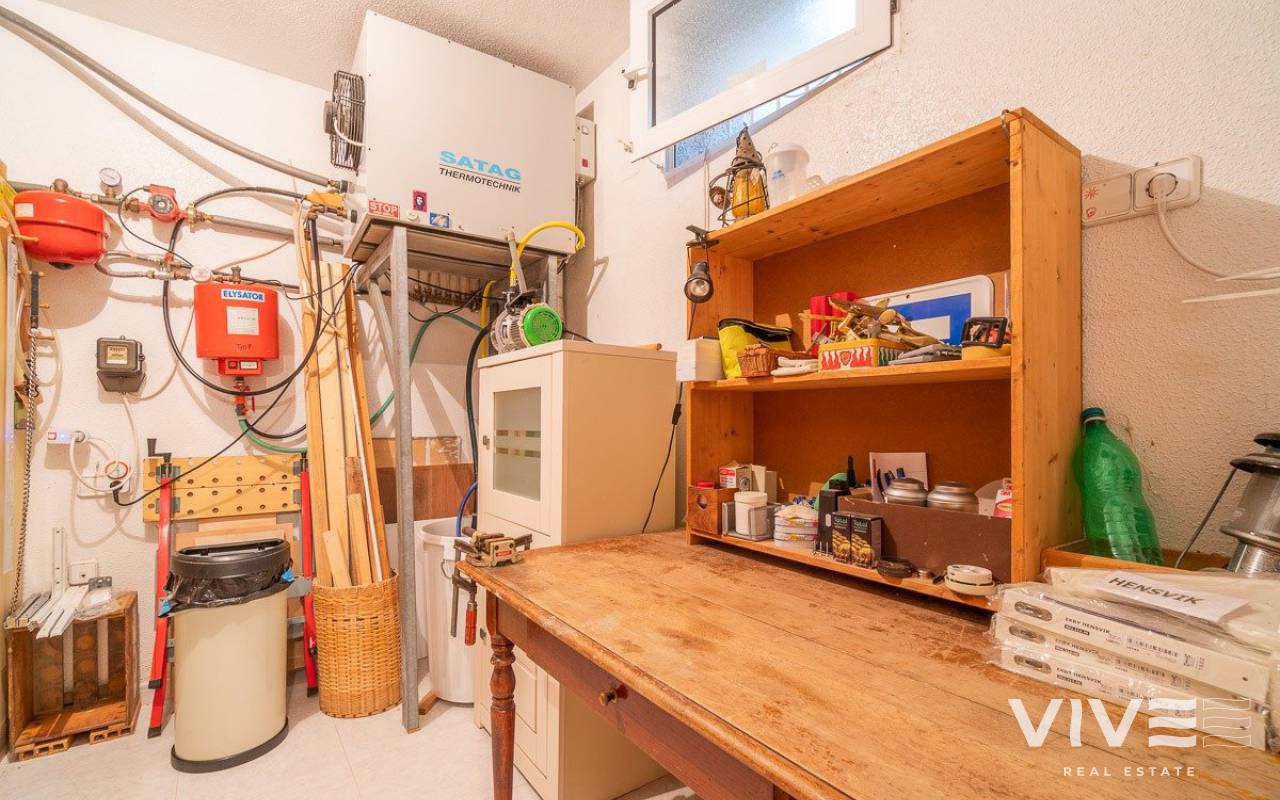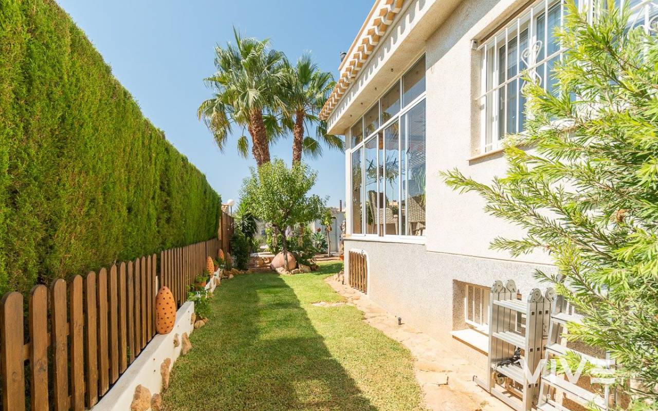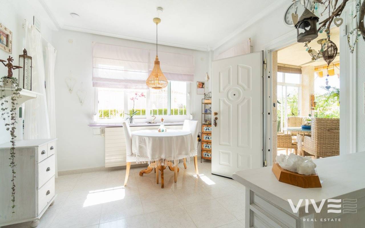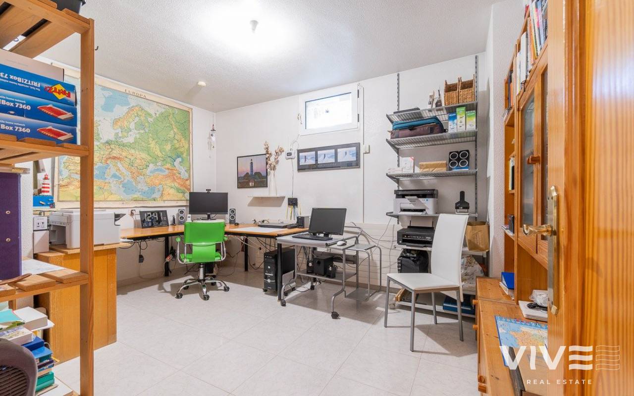 This beautiful Mediterranean-style villa is located in the center of Playa Flamenca, a few meters from the largest shopping center in the province of Alicante. The property is located in Orihuela Costa, near the Mediterranean Sea, about 20 minutes walk. In addition, the post office, the town hall and all necessary German-speaking service providers are located in the immediate vicinity. There are 2 private hospitals in Torrevieja (5 km). The largest shopping center in the province of Alicante, Zenia Boulevard, is a 5-minute drive away. Alicante is 60 km away, less than an hour from the airport. The plot measures 550 m2 and its distribution is as follows: in front there is an automatically irrigated lawn, 4 palm trees and a centenary olive tree, which contribute to an exceptionally cool microclimate. In the background there are trees such as lemon, fig, orange, medlar and pomegranate trees, as well as a garden of plants with irrigation controlled in time by means of droplets.There is a double garage for 1 car and a 6m long motorhome with automatic doors.Two terraces, one on the ground floor and one on the top floor. The orientation is south, so you can enjoy the sun all day. There are enough shady spots. The size of the house is considerable: approx. 180 m2 of constructed area, consisting of: GROUND FLOOR with living / dining room, separate kitchen, 1 bedroom and 1 bathroom. FIRST FLOOR with 2 bedrooms and 1 bathroom with a new large shower. All bedrooms are large and can accommodate a double bed or two single beds. BASEMENT FLOOR with 5 rooms, such as pantry, laundry room, room / office, storage room and workshop / central heating (heat pump). The Extras to highlight are: The sanitary hot water and part of the electricity is generated with a photovoltaic panel.The house is sold furnished and is in very good condition. There is a multi-stage filtration system for drinking water and a permanent 700 liter water supply throughout the house. The property is well worth a visit. It is very suitable as a residence all year round. The photovoltaic system generates an average of 2.3 kWh per day. Electricity is consumed directly at home and reduces electricity consumption by around 15%. The windows are double-glazed and the masonry is two-layer with thermal insulation. Internet and telephony run over fiber optic cables to the modem / router. On the property there is also a fully covered double garage with automatic gates for one car and a 6m long mobile home. There are no pending corrective actions. There are no regular expenses for community pool, community gardens, etc.
