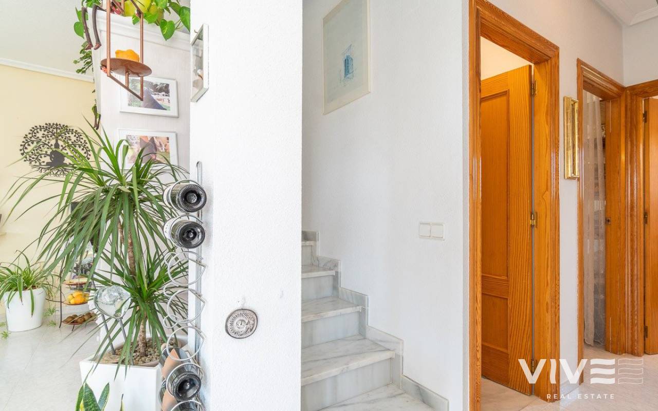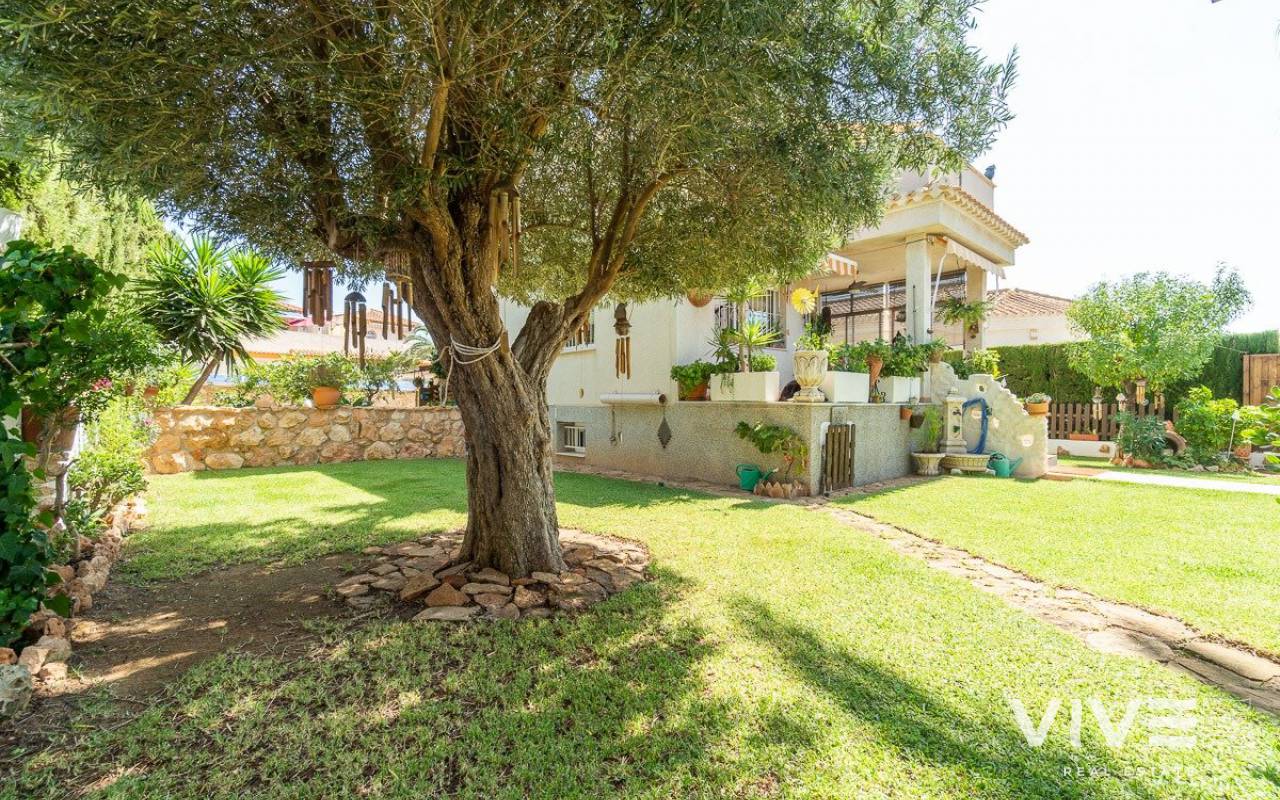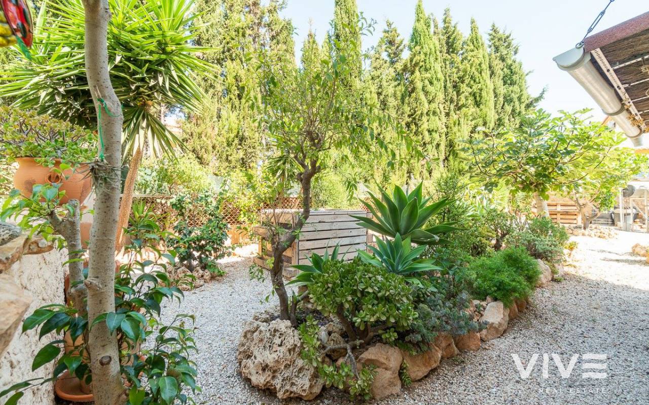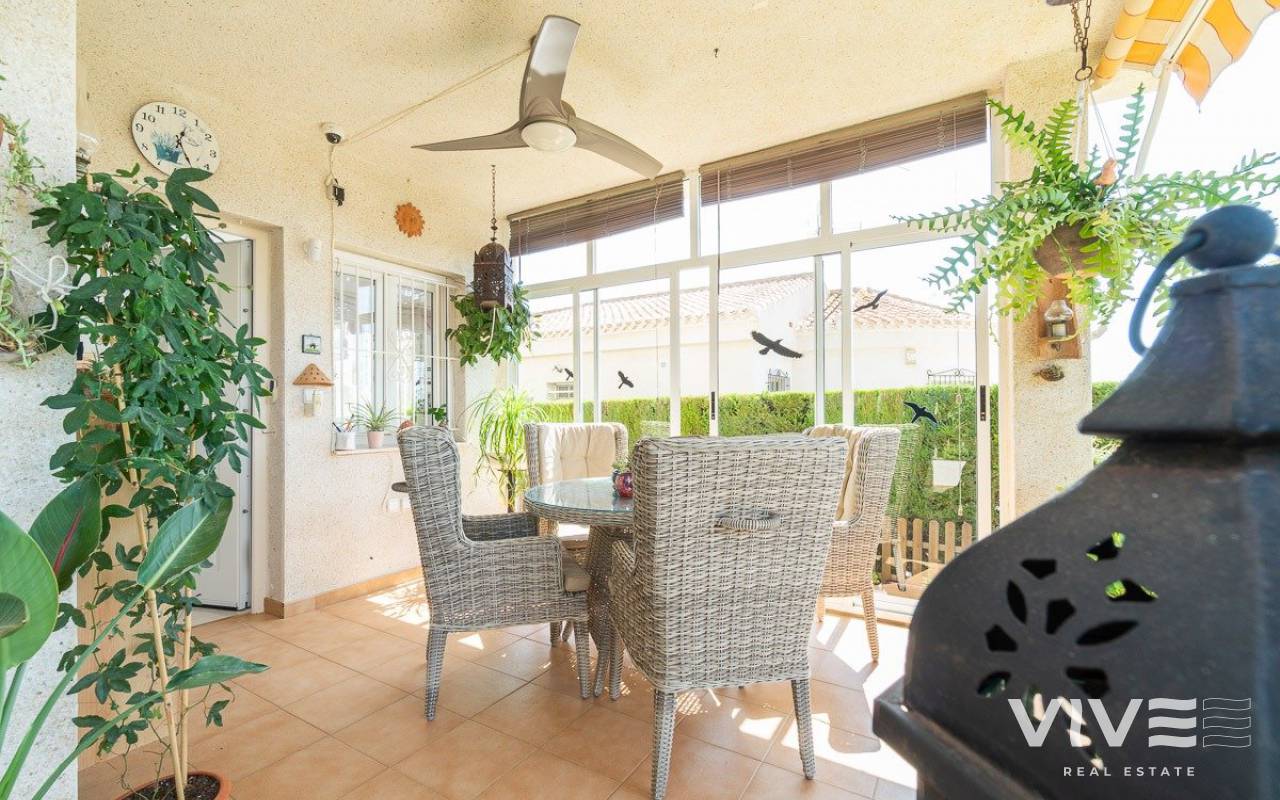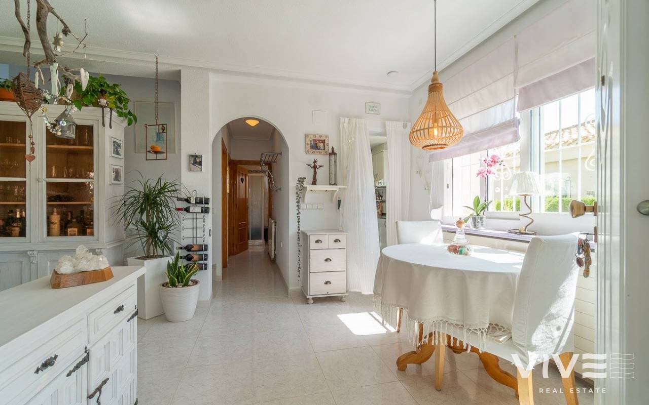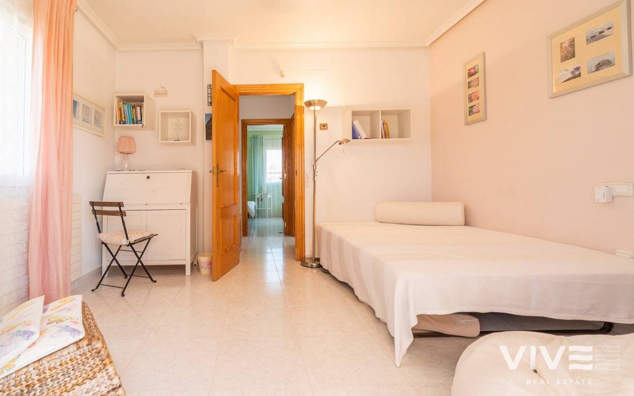 This beautiful Mediterranean-style villa is located in the center of Playa Flamenca, a few meters from the largest shopping center in the province of Alicante. The property is located in Orihuela Costa, near the Mediterranean Sea, about 20 minutes walk. In addition, the post office, the town hall and all necessary German-speaking service providers are located in the immediate vicinity. There are 2 private hospitals in Torrevieja (5 km). The largest shopping center in the province of Alicante, Zenia Boulevard, is a 5-minute drive away. Alicante is 60 km away, less than an hour from the airport. The plot measures 550 m2 and its distribution is as follows: in front there is an automatically irrigated lawn, 4 palm trees and a centenary olive tree, which contribute to an exceptionally cool microclimate. In the background there are trees such as lemon, fig, orange, medlar and pomegranate trees, as well as a garden of plants with irrigation controlled in time by means of droplets.There is a double garage for 1 car and a 6m long motorhome with automatic doors.Two terraces, one on the ground floor and one on the top floor. The orientation is south, so you can enjoy the sun all day. There are enough shady spots. The size of the house is considerable: approx. 180 m2 of constructed area, consisting of: GROUND FLOOR with living / dining room, separate kitchen, 1 bedroom and 1 bathroom. FIRST FLOOR with 2 bedrooms and 1 bathroom with a new large shower. All bedrooms are large and can accommodate a double bed or two single beds. BASEMENT FLOOR with 5 rooms, such as pantry, laundry room, room / office, storage room and workshop / central heating (heat pump). The Extras to highlight are: The sanitary hot water and part of the electricity is generated with a photovoltaic panel.The house is sold furnished and is in very good condition. There is a multi-stage filtration system for drinking water and a permanent 700 liter water supply throughout the house. The property is well worth a visit. It is very suitable as a residence all year round. The photovoltaic system generates an average of 2.3 kWh per day. Electricity is consumed directly at home and reduces electricity consumption by around 15%. The windows are double-glazed and the masonry is two-layer with thermal insulation. Internet and telephony run over fiber optic cables to the modem / router. On the property there is also a fully covered double garage with automatic gates for one car and a 6m long mobile home. There are no pending corrective actions. There are no regular expenses for community pool, community gardens, etc.