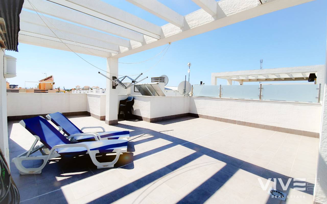 Bungalow på översta våningen med privat solarium i ett bostadsområde med pool, grönområden och lekplats.