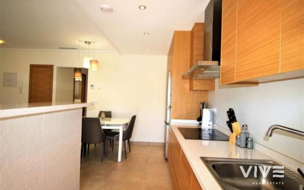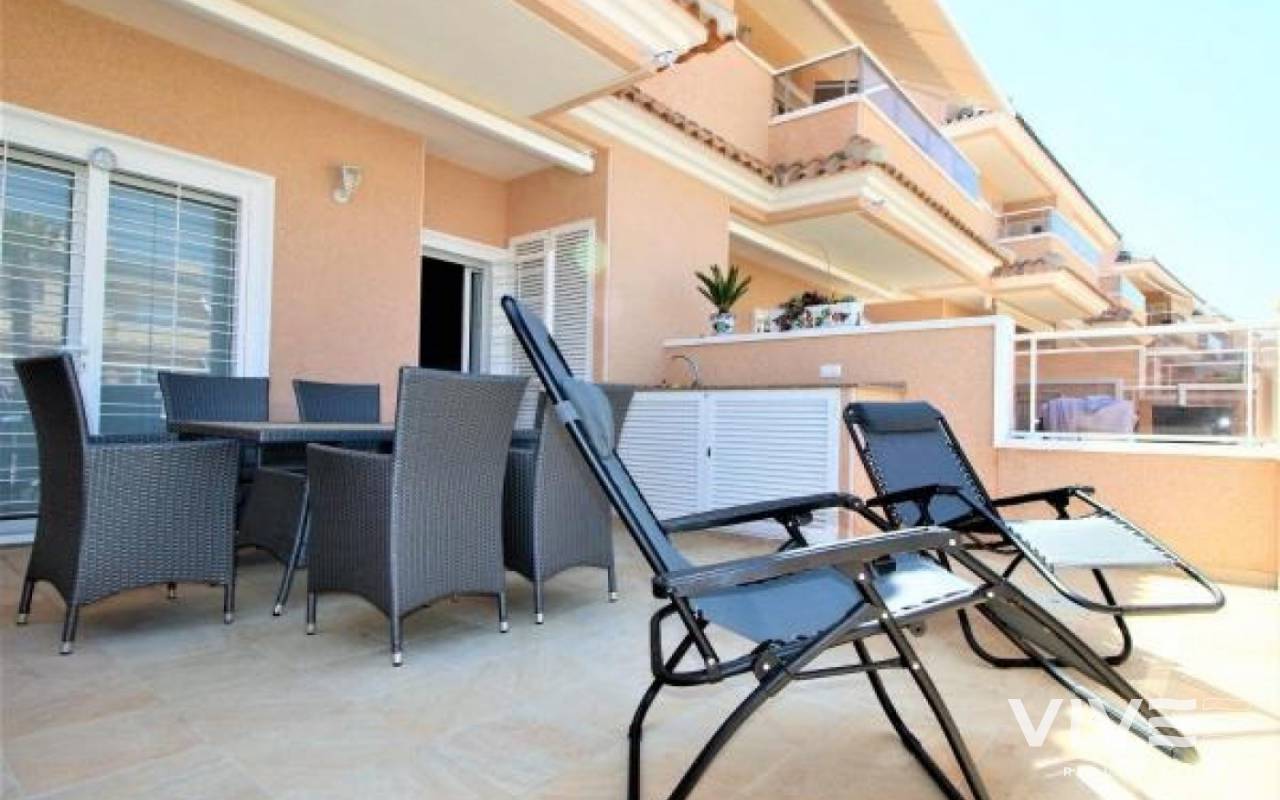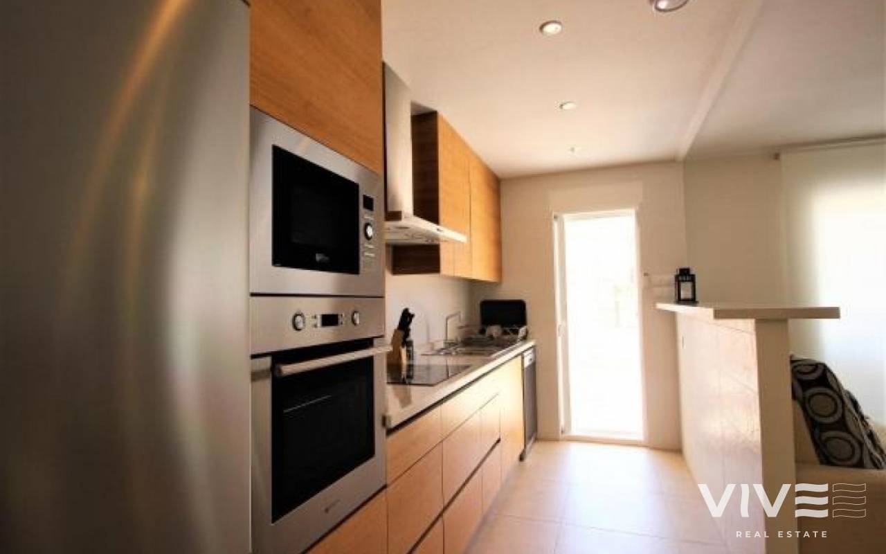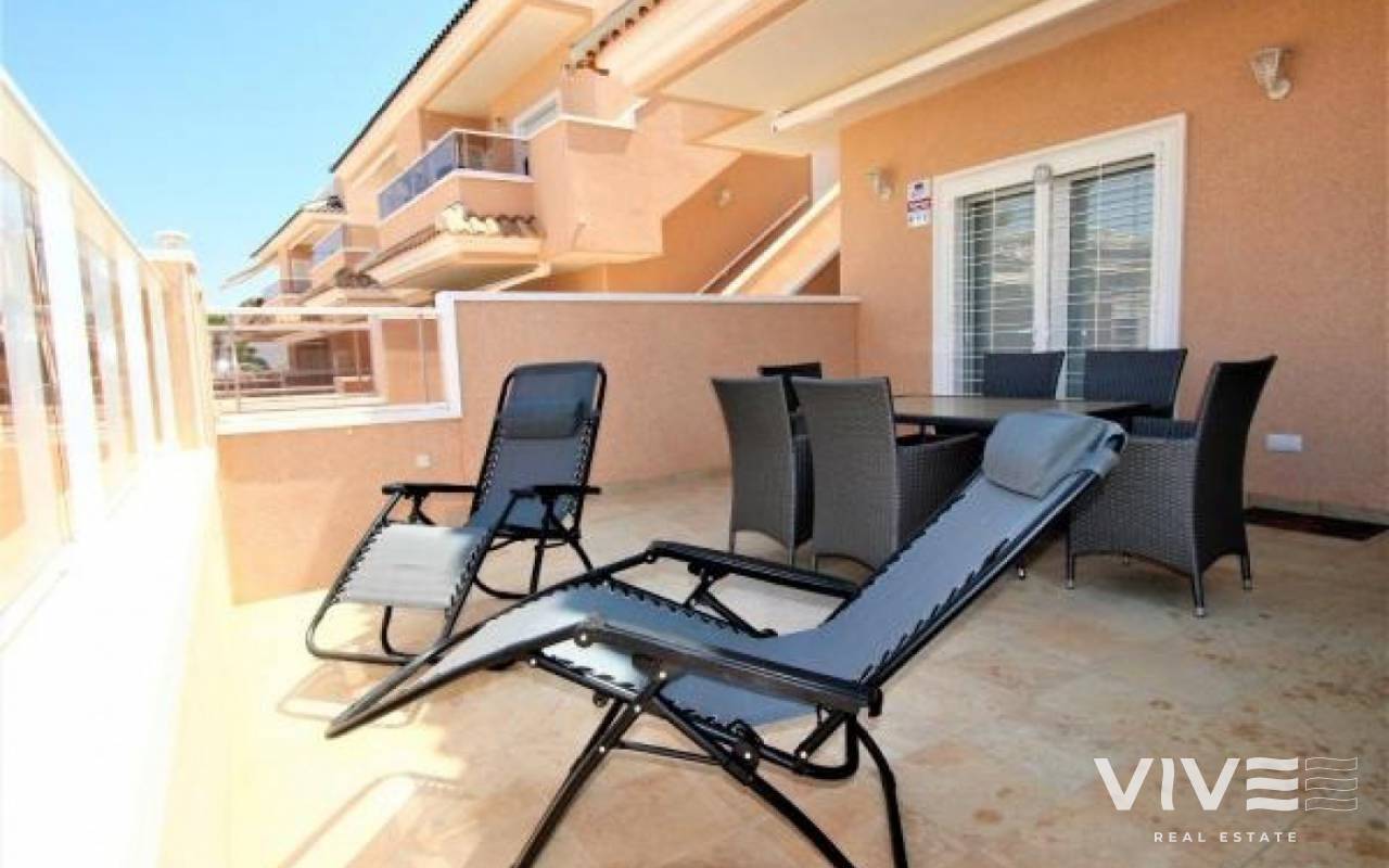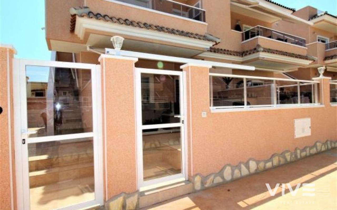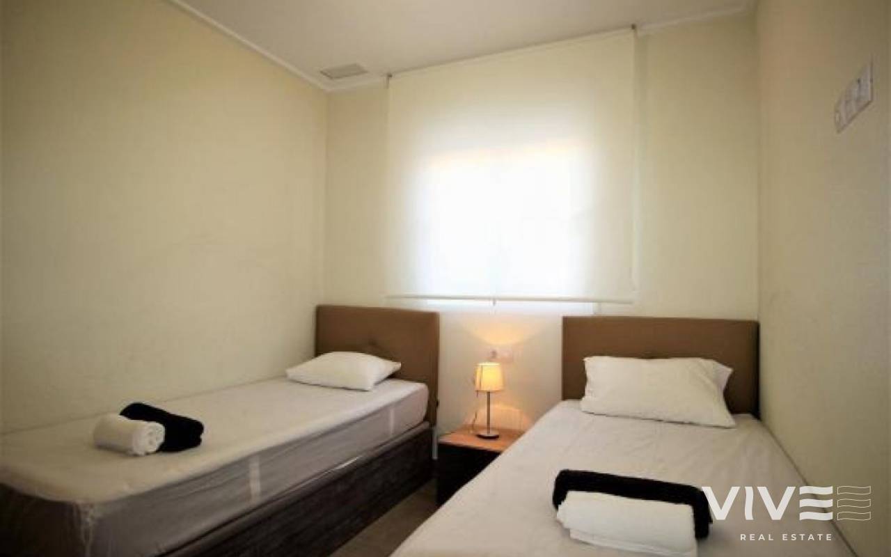 VISTA AZUL Bungalow på bottenvåningen med två dubbelrum med inbyggda garderober och två badrum, varav ett sovrum har eget badrum, fullt utrustat kök med öppen planlösning, vardagsrum med utgång till terrassen från vilken du kan gå ut till de gemensamma områdena med utomhuspool, uppvärmd inomhuspool, bastu, jacuzzi, lekplats och grönområden.