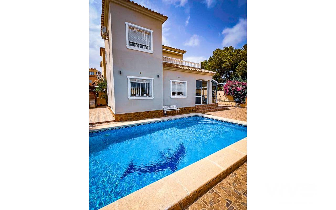Denna fantastiska friliggande villa erbjuder gott om utrymme, privatliv och ett utmärkt läge. Med 4 sovrum, ett separat kök med inglasad matplats och 2 kompletta badrum (ett nyligen renoverat med golvvärme) är detta ett perfekt val för familjer eller som en säker investering på Costa Blanca.