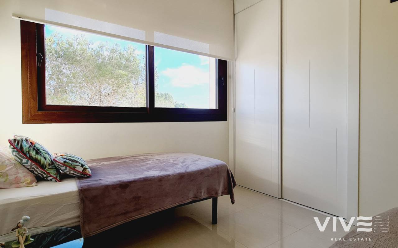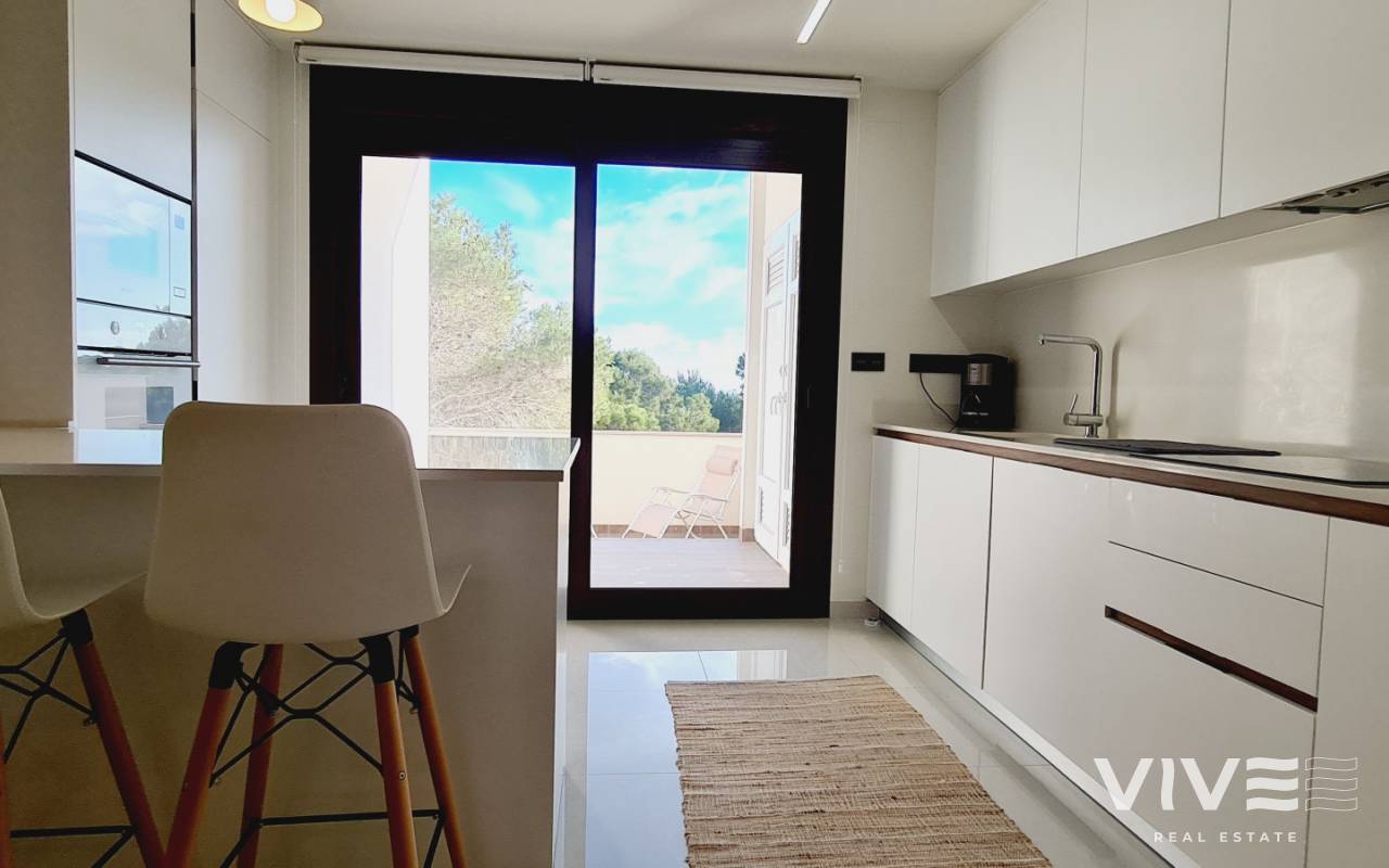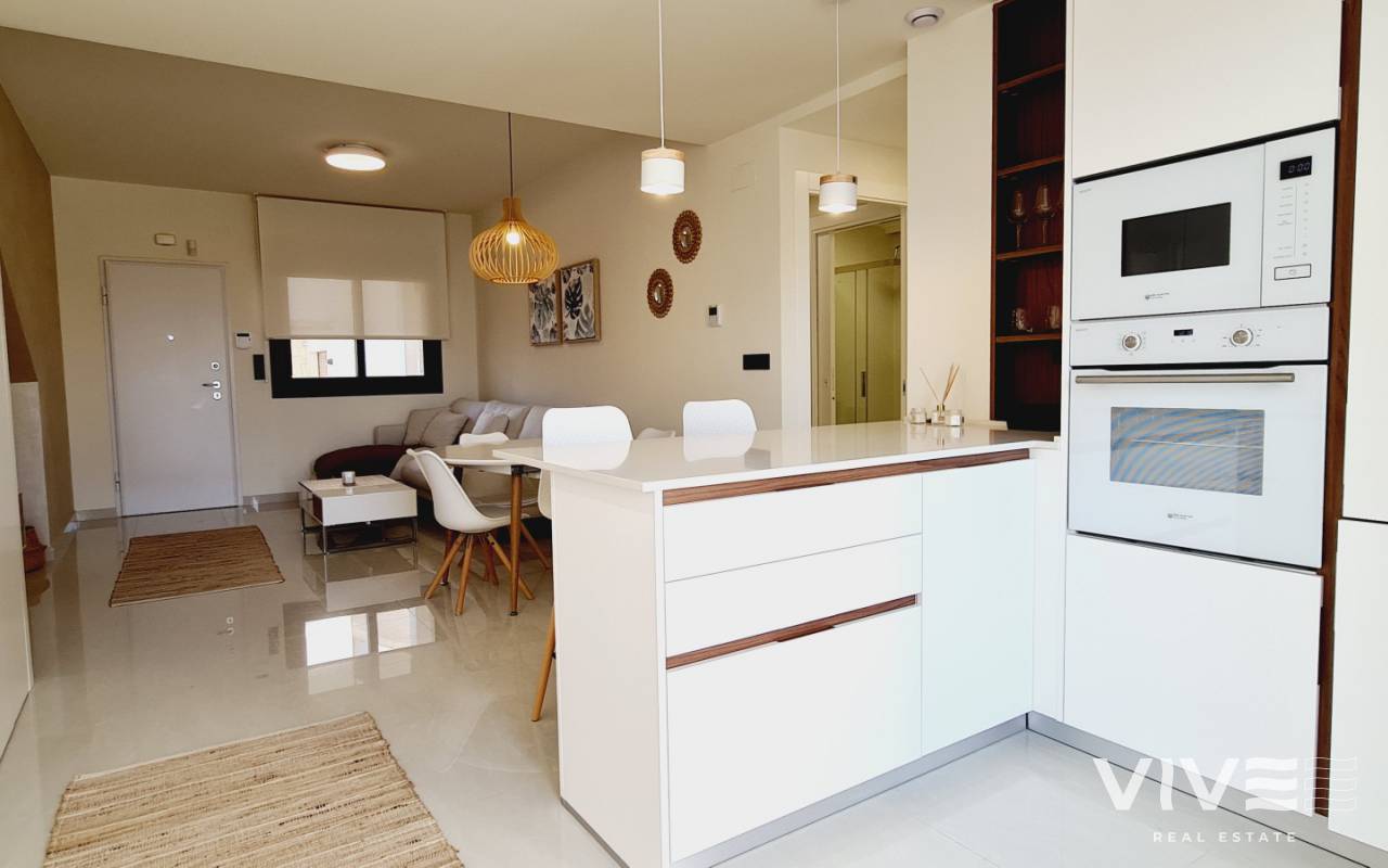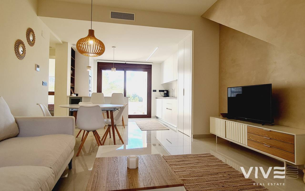 Bostaden har en boyta på 70 m² fördelad på ett ljust vardagsrum med öppen planlösning och kök, två sovrum, två kompletta badrum och en privat terrass på 10 m² – perfekt för att njuta av det milda medelhavsklimatet året runt.