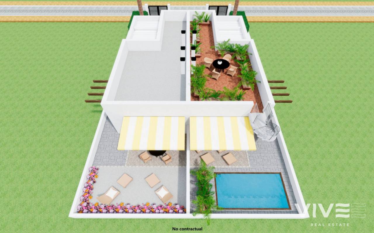 NEUBAU-REIHENHAUSVILLEN IN LOS ALCAZARES Diese geräumigen, gut gestalteten Villen sind paarweise gebaut. Jede Villa hat ihr eigenes privates 175 m² großes Grundstück mit großzügigen Terrassen, einem Poolbereich und einem Garten auf drei Seiten der Villa. Wir glauben, dass diese Villen das beste Preis-Leistungs-Verhältnis in Spanien bieten – wir bieten eine Doppelhaushälfte mit mehr als 100 m2 Terrasse (Solarium kann gegen Aufpreis hinzugefügt werden), Poolbereich oder Garten zum Preis einer Wohnung an. Die Villen wurden mit Blick auf das Leben im Freien entworfen. Das Wohnzimmer hat zwei große Doppeltüren mit Blick auf die Terrasse und den Poolbereich, ideal für Mahlzeiten im Freien. Großzügige Terrassen vorne und hinten sorgen dafür, dass sich die Besitzer den ganzen Tag über sonnen können. Die Villen verfügen über moderne Einbauküchen mit einer Auswahl an Farben für Kücheneinheiten und Wandfliesen in Küche und Bad sowie Böden und Terrassen. Die beiden komfortablen Doppelzimmer verfügen beide über Einbauschränke. Ein Schlafzimmer hat ein eigenes Duschbad und es gibt ein zweites Gäste-Duschbad für Schlafzimmer 2. Die Gärten sind von einer 40 cm hohen Mauer mit Hecken für Privatsphäre an der Vorderseite mit Toren umgeben. Käufer können sich entscheiden, die Höhe der Mauer um den hinteren Garten auf eine Höhe von 180 cm (5 Fuß 10 Zoll) zu erhöhen oder Zäune oder Hecken für die Privatsphäre hinzuzufügen. Eine riesige Sonnenterrasse auf dem Dach mit Wendeltreppe steht gegen Aufpreis zur Verfügung. Jede Villa verfügt über eine geräumige Garage, die auch als Hobbyraum oder Atelier genutzt werden könnte. Pools oder Whirlpools können gegen Aufpreis hinzugefügt werden. Wir haben Pläne, ein drittes Schlafzimmer auf dem Dach der Villen zu bauen. Residenz von Villen, 1 km vom Strand und der Stadt Los Alcázares entfernt, wo Sie verschiedene Wassersportarten ausüben können, umgeben von mehreren Golfplätzen. Stadt Cartagena weniger als 15 Autominuten und 30 Minuten vom Flughafen Murcia Corvera entfernt.
