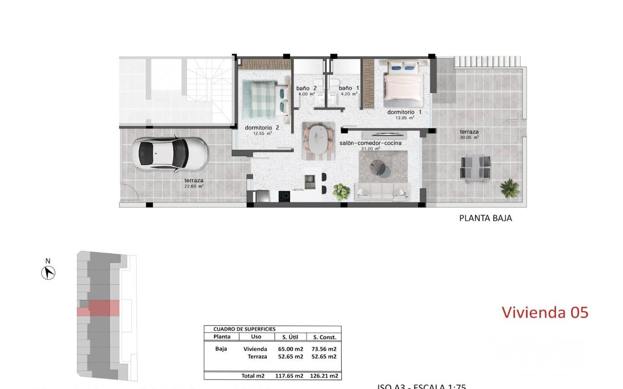 Neubau einer Bungalow-Wohnanlage in Pilar de la Horadada Exklusive moderne Bungalows in Pilar de la Horadada Diese neue Wohnanlage bietet 16 stilvolle Bungalows in der begehrten Ortschaft Pilar de la Horadada, die im südlichsten Teil der Costa Blanca liegt. Wählen Sie zwischen 2- oder 3-Schlafzimmer-Varianten, die jeweils über 2 Badezimmer verfügen. Die Wohnungen im Erdgeschoss verfügen über geräumige Terrassen auf der Vorder- und Rückseite mit direktem Zugang zum Gemeinschaftspool und Garten, während die Wohnungen im Obergeschoss über eine große private Dachterrasse verfügen. Geräumiges Wohnen mit moderner Ausstattung Jeder Bungalow verfügt über einen hellen und offenen Wohn-/Essbereich und eine voll ausgestattete Küche mit großen Schiebetüren, die den Innen- und Außenbereich nahtlos miteinander verbinden. Die Schlafzimmer sind mit Einbauschränken ausgestattet. Die Anlage verfügt über eine Klimaanlage mit Kanalisation und einen Aufzug, der den Zugang zu den oberen Etagen erleichtert. Ein privater Parkplatz ist ebenfalls für alle Einheiten vorgesehen. Erstklassige Lage in Pilar de la Horadada Pilar de la Horadada ist ein traditioneller spanischer Ort mit einer lebhaften Hauptstraße mit Supermärkten, Geschäften, Restaurants und Bars. Die schönen Strände von Torre de la Horadada und Mil Palmeras sind nur 5 Minuten entfernt. Die Siedlung liegt 40 km vom Flughafen Corvera (Murcia) und 55 km vom Flughafen Alicante entfernt und ist somit ein idealer Standort für einen dauerhaften Wohnsitz oder einen Urlaubsaufenthalt.