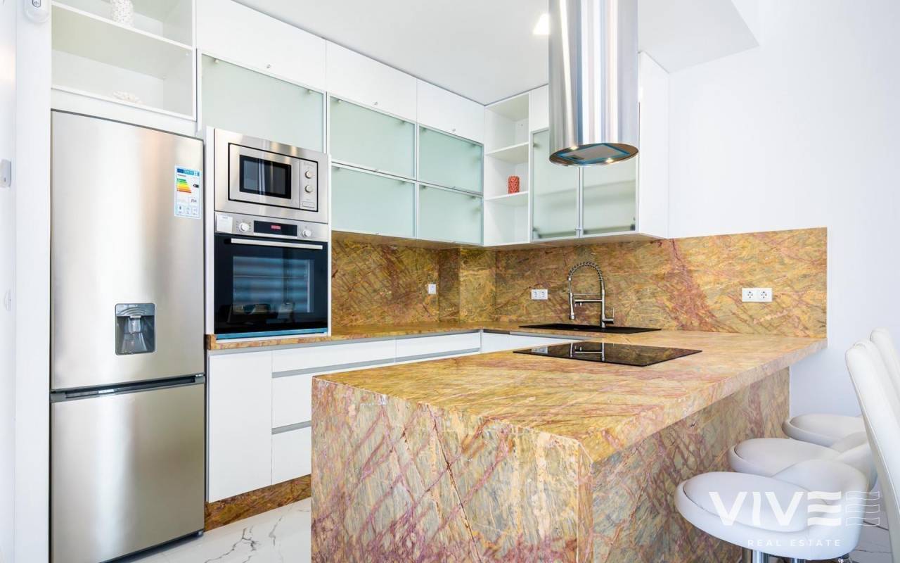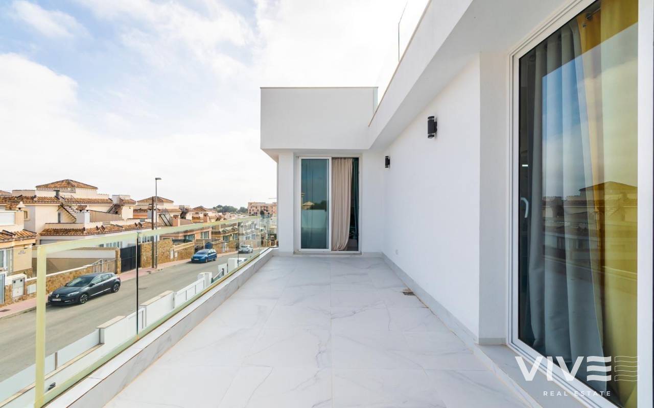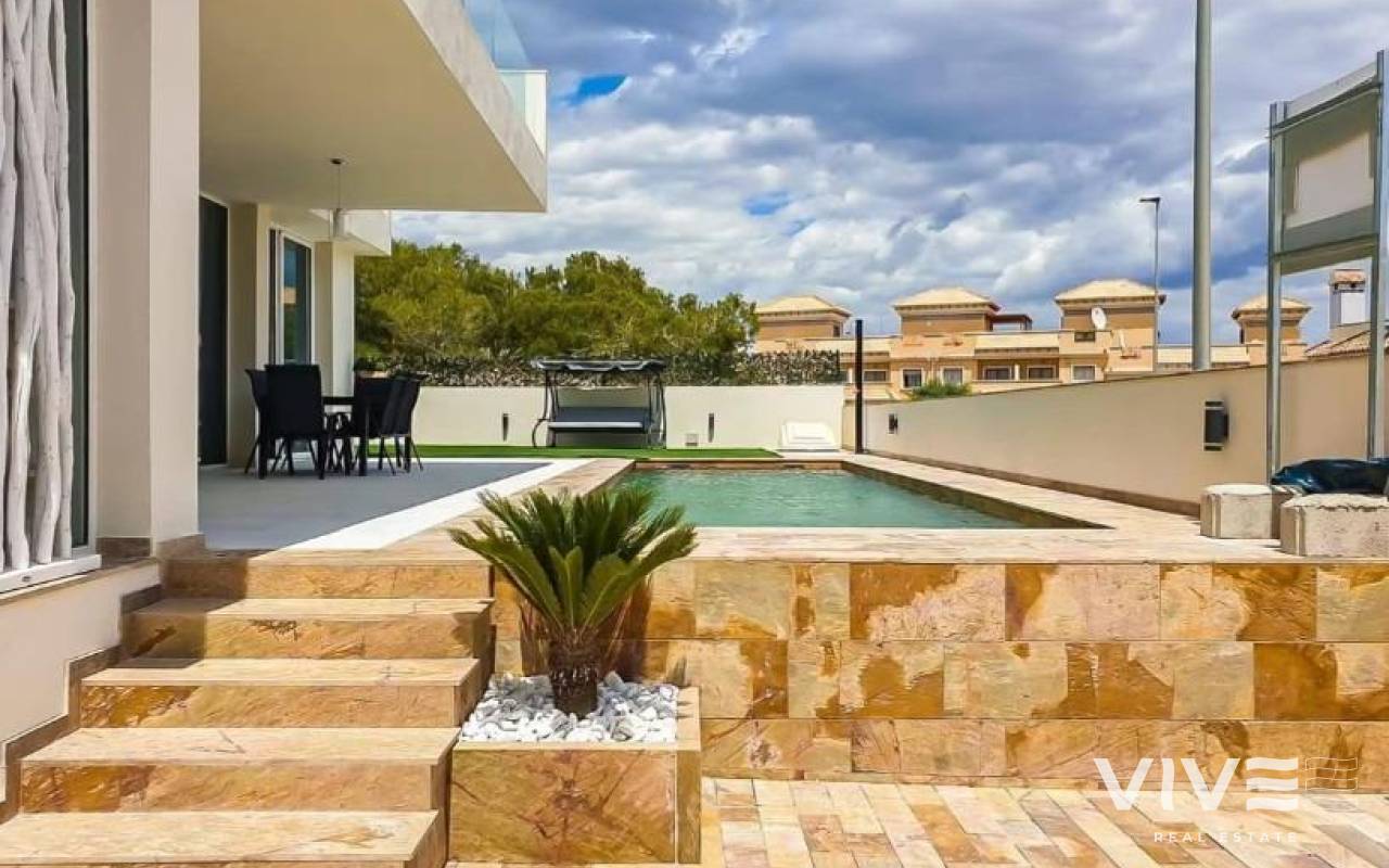 Exklusive Neubau-Wohnanlage in Orihuela Costa Privilegierte Lage im Herzen der Costa Blanca Diese moderne, geschlossene Wohnanlage befindet sich in Orihuela Costa, einer der begehrtesten Gegenden der Costa Blanca, nur 4 km von den Stränden von Orihuela Costa entfernt. Dank der hervorragenden Lage können Sie das ganze Jahr über die Sonne des Mittelmeers genießen und haben Zugang zu einem breiten Freizeit-, Golf- und Dienstleistungsangebot. In nur 5 Autominuten erreichen Sie den Golfplatz von Villamartin und das Einkaufszentrum La Zenia Boulevard, das größte in der Provinz Alicante, mit mehr als 150 Geschäften, Restaurants und Unterhaltungsbereichen. Modernes Design und exklusive Wohnungen Diese Wohnanlage bietet eine Auswahl an neu gebauten Häusern, die nach den höchsten Qualitäts- und Komfortstandards entworfen wurden: 7 Stadthäuser mit 2 und 3 Schlafzimmern und Zugang zu einem Gemeinschaftspool. 2 freistehende Villen mit 3 Schlafzimmern und 3 Bädern, jeweils mit privatem Swimmingpool. Optional: Tiefgaragenstellplätze und Abstellräume gegen Aufpreis. Exklusive Qualitäten und Merkmale Jede Immobilie wurde nach modernen und funktionalen Gesichtspunkten entworfen, wie zum Beispiel: Begrünte Außenbereiche mit Kunstrasen neben dem Swimmingpool. Aerothermische Heizung für mehr Energieeffizienz. Küche mit Quarz-Frühstücksbar, Sitzbereich und 50 cm Metallspüle. Treppe mit Handlauf aus Glas und Edelstahl. Voll ausgestattete Bäder mit Oberschränken, Spiegel und Duschwand. Vorinstallation für eine Kanal-Klimaanlage. Einbauschränke in jedem Schlafzimmer, mit Schiebetüren und Soft-Closing-System. Sicherheitseingangstür für den Seelenfrieden. Nähe zu interessanten Orten Strand von Punta Prima - 4 km. Villamartin Golfplatz - 5 km. Einkaufszentrum „La Zenia Boulevard“ - 5 km. Stadtzentrum Torrevieja - 10 km. Flughafen Alicante - 40 Minuten. Flughafen Murcia-Corvera - 1 Stunde. Erleben Sie den mediterranen Lebensstil Diese exklusive Wohnanlage ist ideal für diejenigen, die ein modernes Haus an der Costa Blanca suchen, mit Zugang zu Stränden, Golf und allen Annehmlichkeiten. Lassen Sie sich diese einmalige Gelegenheit nicht entgehen und kontaktieren Sie uns noch heute für weitere Informationen oder um einen Besichtigungstermin zu vereinbaren.