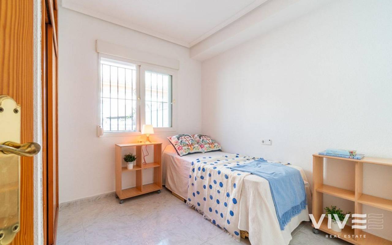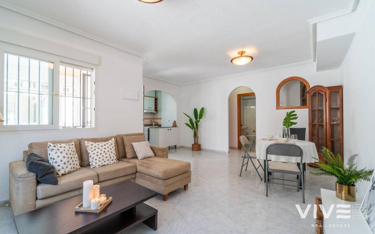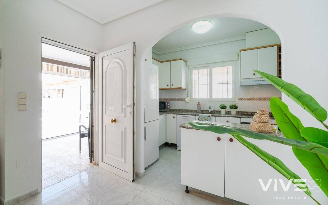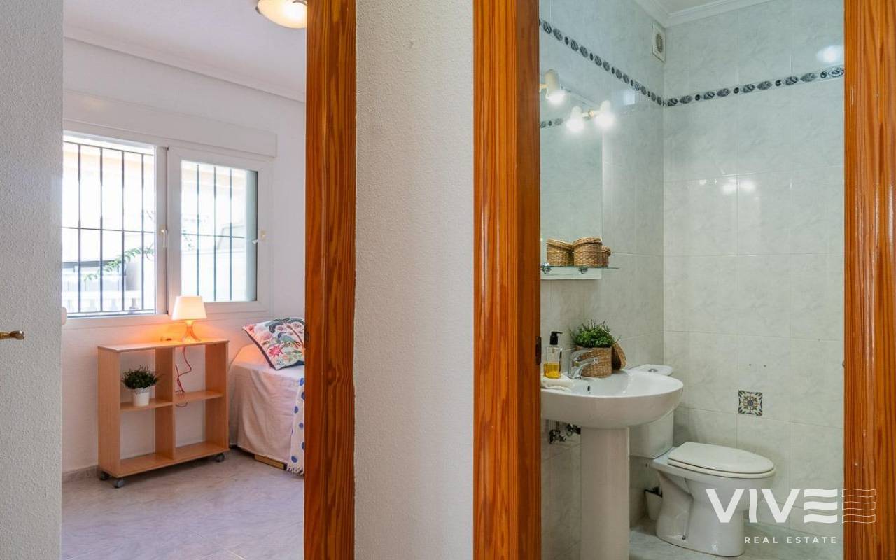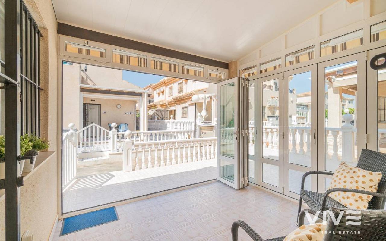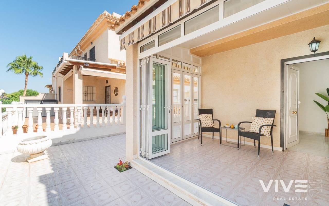 Geräumiges Doppelhaus mit vier Eckhäusern in einer Wohnanlage mit Gemeinschaftspool im Zentrum von Playa Flamenca.. Ganz in der Nähe von Sport- und Freizeitbereichen, dem Einkaufszentrum Zenia Boulevard und anderen Einkaufsmöglichkeiten. Die Strände von Playa Flamenca, die örtlichen öffentlichen Schulen, der Samstagsmarkt sowie Bars und Restaurants sind nur einen kurzen Spaziergang entfernt. Dennoch befindet sich das Haus in einer ruhigen, geschlossenen Anlage mit Gemeinschaftspool und -gärten, privaten Straßen, die nur von Anwohnern genutzt werden, und Parkplätzen am Fuße der Häuser, sodass Sie mit Ihrer Familie, Ihren Koffern und anderen Gegenständen in nur wenigen Schritten von Ihrem Fahrzeug zu Ihrem Haus gelangen.. . Das Haus verfügt über eine geflieste Eckterrasse mit Pflanzenflächen und bietet ausreichend Platz für einen Grillplatz, eine Leseecke, einen Ruhebereich oder wie auch immer Sie die über 30 m² große Fläche nutzen möchten. Es gibt außerdem einen Aluminium-Abstellraum für Koffer, Werkzeuge und mehr.. Die Eingangsveranda des Hauses ist mit einer Aluminium-Glas-Einhausung ausgestattet und eignet sich dank der unschlagbaren Süd-Südwest-Lage des Hauses ideal als Winterwohnzimmer. Dies sorgt das ganze Jahr über für Sonnenschein. Im Winter genießen Sie dank der Einhausung einen warmen Raum, der gleichzeitig den Rest des Hauses beheizt. Im Sommer lassen sich alle Glasfenster öffnen, um frische Luft hereinzulassen.. . Das Haus verfügt über drei Schlafzimmer, eines davon im Erdgeschoss, und ein Badezimmer mit Dusche auf derselben Etage. Dadurch müssen ältere Menschen mit eingeschränkter Mobilität oder Menschen mit Behinderung keine Treppen steigen, was die Wohnung für Familien aller Art sehr praktisch macht.. . Die Beschreibung beginnt mit dem Betreten der bereits erwähnten verglasten Veranda durch die Sicherheitseingangstür in das L-förmige Wohn- und Esszimmer mit großen Fenstern, die für maximalen Raumkomfort sorgen und viel Licht und Sonnenlicht in das gesamte Erdgeschoss lassen. Das Wohnzimmer bietet Platz für eine Leseecke, einen Fernsehbereich und einen Essbereich sowie eine offene Küche mit Frühstückstresen, ausgestattet mit Schränken und Geräten. Im Erdgeschoss befindet sich ein Badezimmer mit Dusche, das auf der gesamten Etage genutzt werden kann, sowie ein geräumiger Abstellraum unter dem Treppenhaus für alle Haushaltsgegenstände, die nicht in den oben genannten Abstellraum auf der Außenterrasse passten.. . Im ersten Stock befinden sich die beiden Hauptschlafzimmer, beide mit Einbauschränken, eines davon mit Frühstücksbalkon, und ein komplettes Badezimmer sowie eine Waschküche mit Waschmaschine und einem 80-Liter-Elektroboiler.. . Auf dem Dach des Hauses befindet sich eine 30 Quadratmeter große Sonnenterrasse mit freiem Blick und Platz zum Entspannen, Lesen oder einfach zum Genießen der Sonne und des freien Ausblicks.. Das Haus wurde gerade gestrichen und dekoriert, und sobald es möbliert ist, können Sie es genießen.. . Ein Besuch lohnt sich, um die vielen Möglichkeiten des Anwesens zu entdecken – dank seiner sonnigen Lage, der sehr ruhigen Lage, der guten Parkmöglichkeiten und der Tatsache, dass es sich in einem perfekten Zustand befindet und sofort bezugsfertig ist.