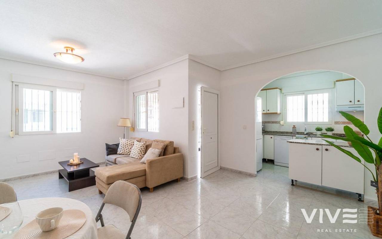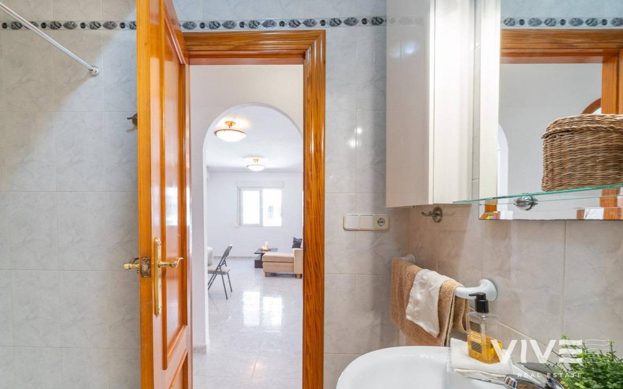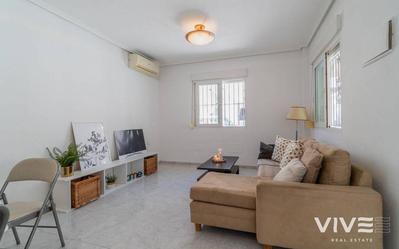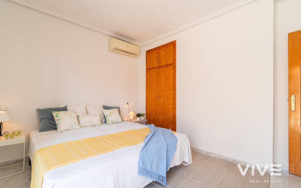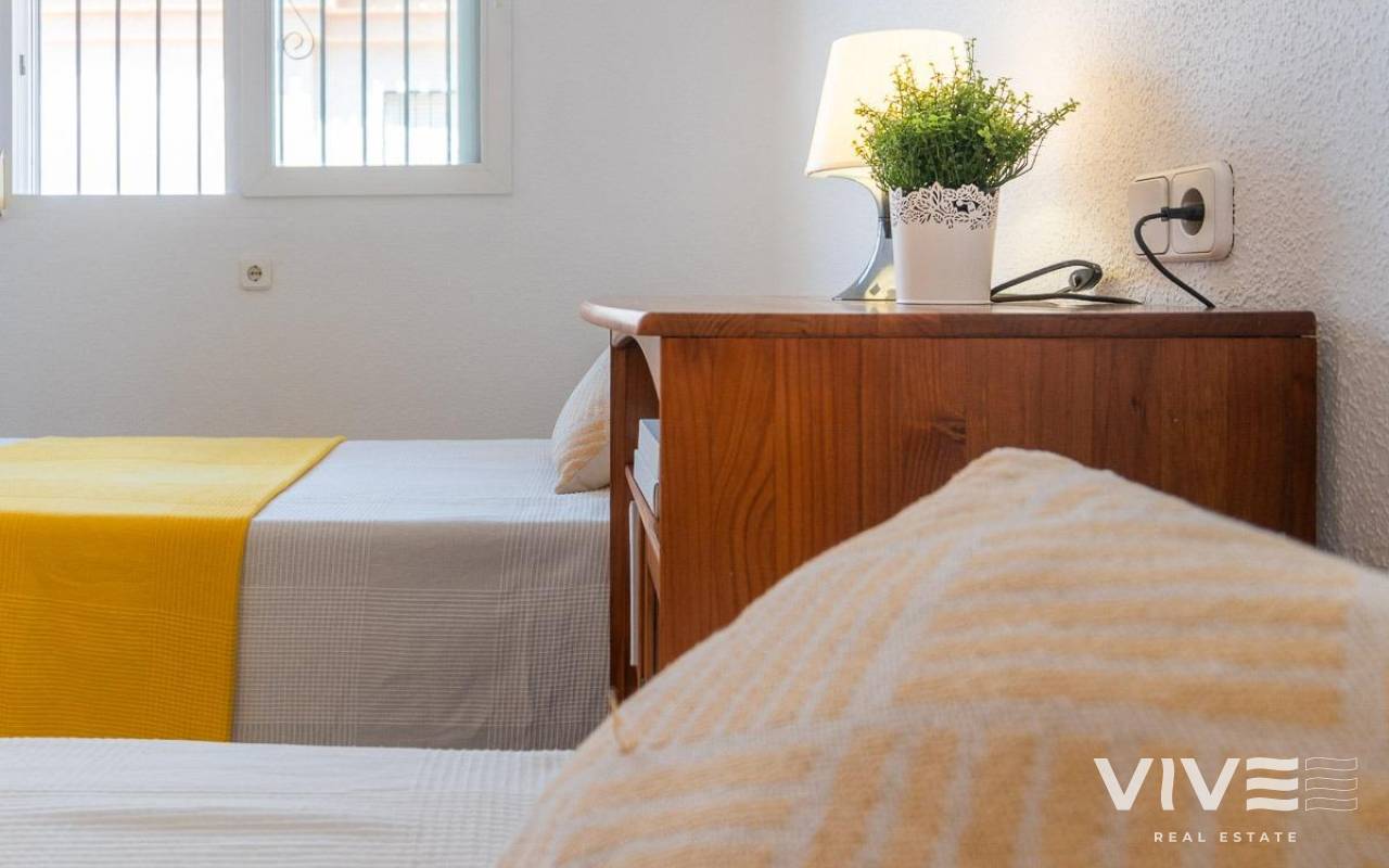Geräumiges Doppelhaus mit vier Eckhäusern in einer Wohnanlage mit Gemeinschaftspool im Zentrum von Playa Flamenca.. Ganz in der Nähe von Sport- und Freizeitbereichen, dem Einkaufszentrum Zenia Boulevard und anderen Einkaufsmöglichkeiten. Die Strände von Playa Flamenca, die örtlichen öffentlichen Schulen, der Samstagsmarkt sowie Bars und Restaurants sind nur einen kurzen Spaziergang entfernt. Dennoch befindet sich das Haus in einer ruhigen, geschlossenen Anlage mit Gemeinschaftspool und -gärten, privaten Straßen, die nur von Anwohnern genutzt werden, und Parkplätzen am Fuße der Häuser, sodass Sie mit Ihrer Familie, Ihren Koffern und anderen Gegenständen in nur wenigen Schritten von Ihrem Fahrzeug zu Ihrem Haus gelangen.. . Das Haus verfügt über eine geflieste Eckterrasse mit Pflanzenflächen und bietet ausreichend Platz für einen Grillplatz, eine Leseecke, einen Ruhebereich oder wie auch immer Sie die über 30 m² große Fläche nutzen möchten. Es gibt außerdem einen Aluminium-Abstellraum für Koffer, Werkzeuge und mehr.. Die Eingangsveranda des Hauses ist mit einer Aluminium-Glas-Einhausung ausgestattet und eignet sich dank der unschlagbaren Süd-Südwest-Lage des Hauses ideal als Winterwohnzimmer. Dies sorgt das ganze Jahr über für Sonnenschein. Im Winter genießen Sie dank der Einhausung einen warmen Raum, der gleichzeitig den Rest des Hauses beheizt. Im Sommer lassen sich alle Glasfenster öffnen, um frische Luft hereinzulassen.. . Das Haus verfügt über drei Schlafzimmer, eines davon im Erdgeschoss, und ein Badezimmer mit Dusche auf derselben Etage. Dadurch müssen ältere Menschen mit eingeschränkter Mobilität oder Menschen mit Behinderung keine Treppen steigen, was die Wohnung für Familien aller Art sehr praktisch macht.. . Die Beschreibung beginnt mit dem Betreten der bereits erwähnten verglasten Veranda durch die Sicherheitseingangstür in das L-förmige Wohn- und Esszimmer mit großen Fenstern, die für maximalen Raumkomfort sorgen und viel Licht und Sonnenlicht in das gesamte Erdgeschoss lassen. Das Wohnzimmer bietet Platz für eine Leseecke, einen Fernsehbereich und einen Essbereich sowie eine offene Küche mit Frühstückstresen, ausgestattet mit Schränken und Geräten. Im Erdgeschoss befindet sich ein Badezimmer mit Dusche, das auf der gesamten Etage genutzt werden kann, sowie ein geräumiger Abstellraum unter dem Treppenhaus für alle Haushaltsgegenstände, die nicht in den oben genannten Abstellraum auf der Außenterrasse passten.. . Im ersten Stock befinden sich die beiden Hauptschlafzimmer, beide mit Einbauschränken, eines davon mit Frühstücksbalkon, und ein komplettes Badezimmer sowie eine Waschküche mit Waschmaschine und einem 80-Liter-Elektroboiler.. . Auf dem Dach des Hauses befindet sich eine 30 Quadratmeter große Sonnenterrasse mit freiem Blick und Platz zum Entspannen, Lesen oder einfach zum Genießen der Sonne und des freien Ausblicks.. Das Haus wurde gerade gestrichen und dekoriert, und sobald es möbliert ist, können Sie es genießen.. . Ein Besuch lohnt sich, um die vielen Möglichkeiten des Anwesens zu entdecken – dank seiner sonnigen Lage, der sehr ruhigen Lage, der guten Parkmöglichkeiten und der Tatsache, dass es sich in einem perfekten Zustand befindet und sofort bezugsfertig ist.
