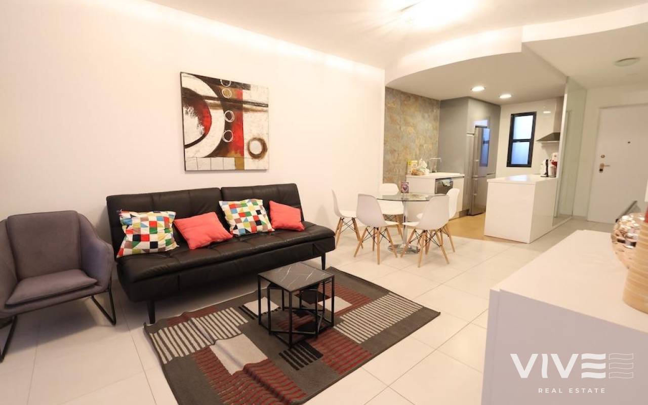 La Zenia, Residencial Sabrina.. 77 m2 große, nach Süden ausgerichtete Wohnung mit 2 Schlafzimmern (davon 1 en suite), 2 Bädern, einem großzügigen Wohn-Esszimmer, einer offenen Küche und einer Terrasse.. Die Immobilie wird möbliert und mit Klimaanlage verkauft. Sie bietet weitläufige Gemeinschaftsbereiche mit Gemeinschaftspool sowie einen Abstellraum und einen Parkplatz.. Die Wohnung verfügt über eine Touristenlizenz und erzielt derzeit hervorragende Erträge.