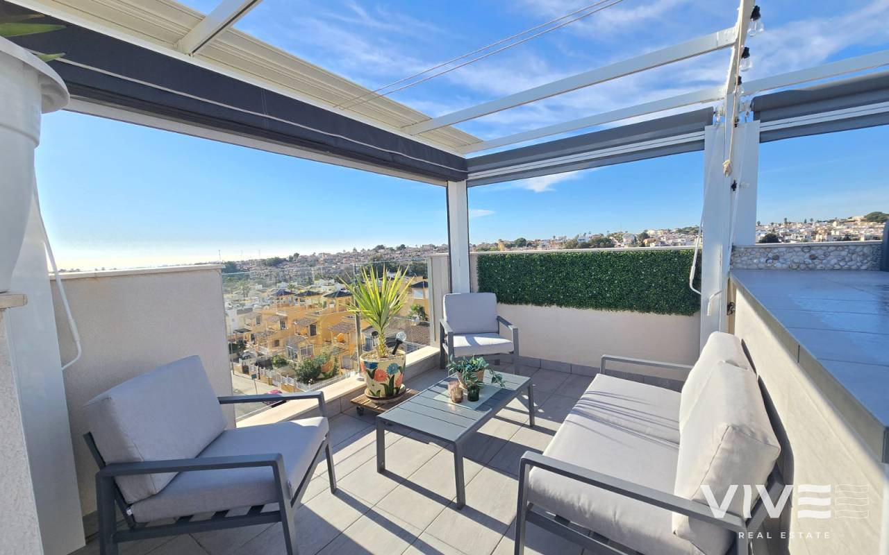 Entdecken Sie dieses außergewöhnliche südlich ausgerichtete Penthouse mit atemberaubendem Meer- und Bergblick, gelegen in einer jungen und perfekt gepflegten Urbanisation in der Nähe des Golfs von Villamartin. Das absolute Highlight ist das geräumige Solarium, das mit einer voll ausgestatteten Außenküche, einem Ess- und Loungebereich und Sonnenterrassen ausgestattet ist, auf denen Sie den ganzen Tag über Licht, Ruhe und Panoramablicke genießen können. Im Inneren empfängt Sie ein heller und geräumiger Wohnbereich mit offener Küche in einer modernen, einladenden Atmosphäre. Das Penthouse verfügt über zwei Schlafzimmer und zwei Badezimmer, eines davon en-suite, die mit hochwertigen Materialien und einer praktischen Aufteilung gestaltet sind. Zusätzlichen Komfort bieten die Tiefgarage (mit Vorinstallation für Elektroautos) und zwei separate Abstellräume, ideal für zusätzlichen Stauraum. Die Urbanisation selbst bietet eine Reihe von Einrichtungen: zwei Swimmingpools, einen Whirlpool, einen Fitnessraum im Freien, einen Petanque-Platz, einen Spielplatz für die Kleinsten und wunderschön angelegte Gemeinschaftsbereiche. Darüber hinaus befindet sich alles in Gehweite zu Bars, Restaurants und anderen Einrichtungen, sodass Entspannung und Komfort immer in Reichweite sind. Als Extras verfügt die Wohnung über Sonnensegel, Windschutz, Wasserenthärter + OSMOSE und wird vollständig möbliert verkauft! Dieses Penthouse verbindet luxuriöses Wohnen, Komfort und eine erstklassige Lage an der Costa Blanca – perfekt als Dauerwohnsitz, Ferienunterkunft oder Investition. Zögern Sie nicht und vereinbaren Sie schnell einen Besichtigungstermin! Suma: 249 Euro/Jahr. Gemeinschaftskosten: 920 Euro/Jahr.